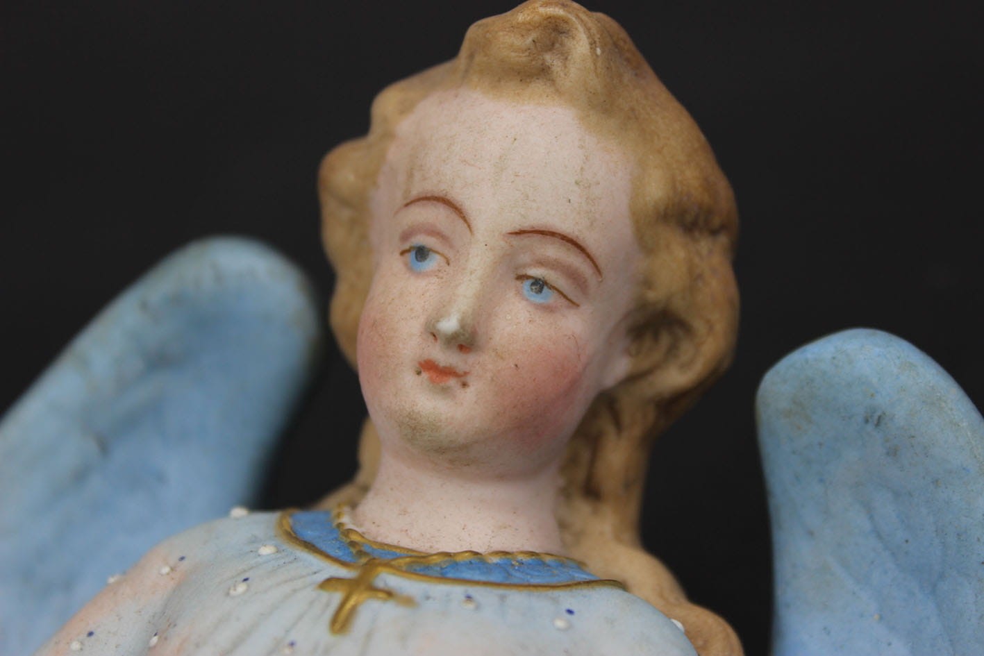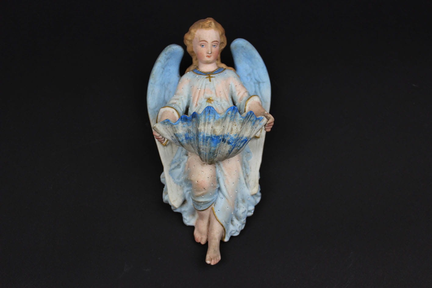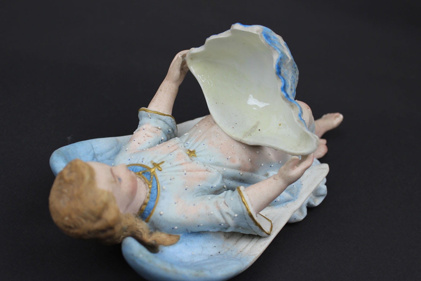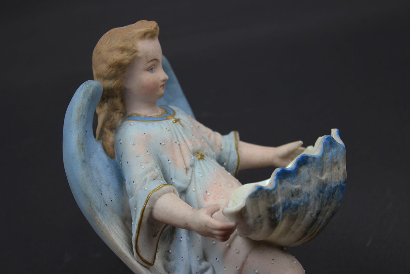 Niezwykle okazała i masywna kropielnica wykonana na Śląsku pod koniec XIX wieku. Wyrób biskwitowy sygnowany puncą wytwórcy oraz numerami na tyle podstawy. Całość w bardzo dobrym stanie zachowania, bez pęknięć lub ubytków. Całość w autentycznej patynce i kurzu. Nie myta i nie czyszczona. Wymiary: