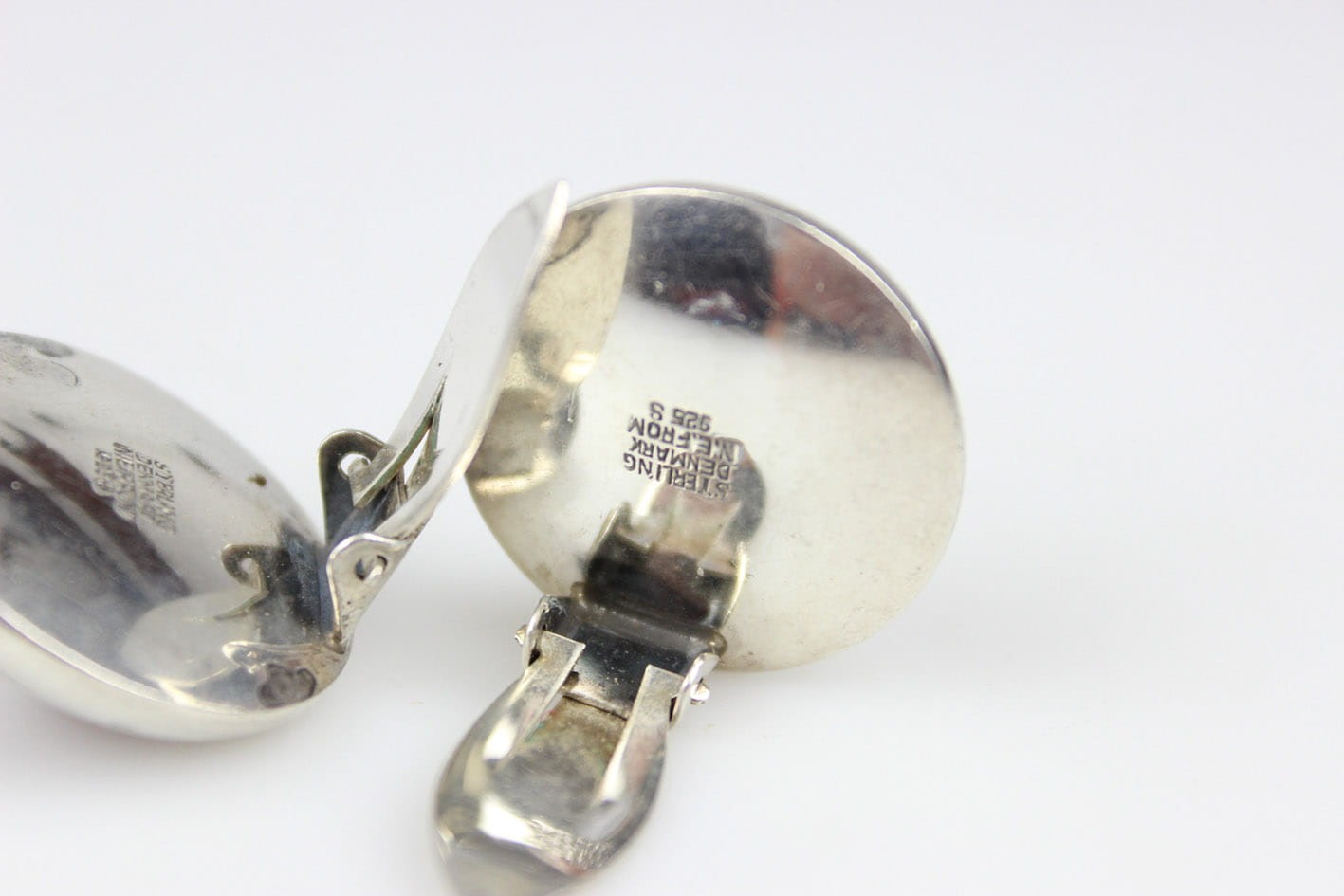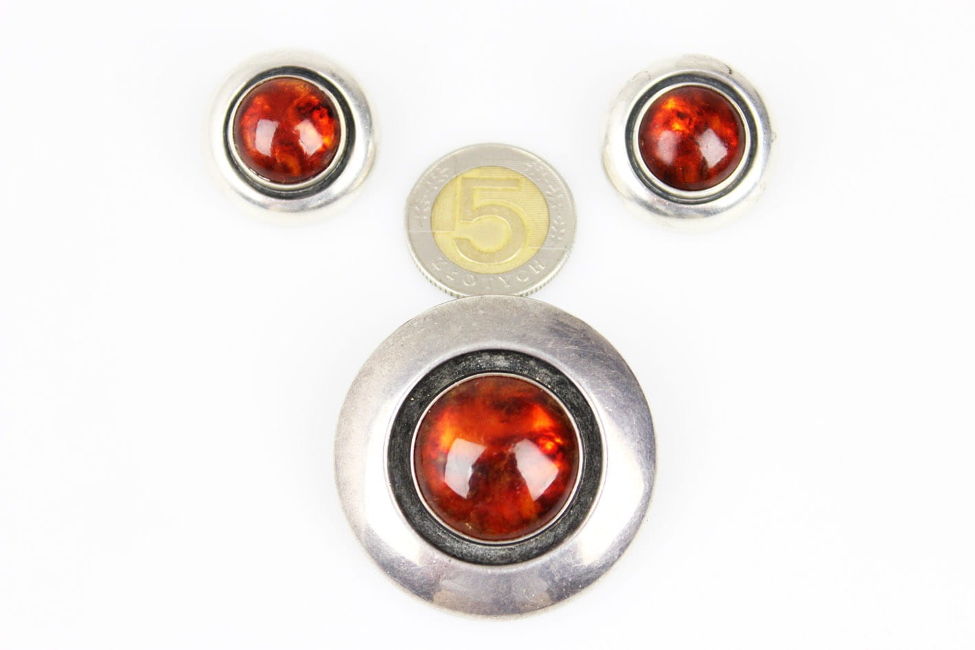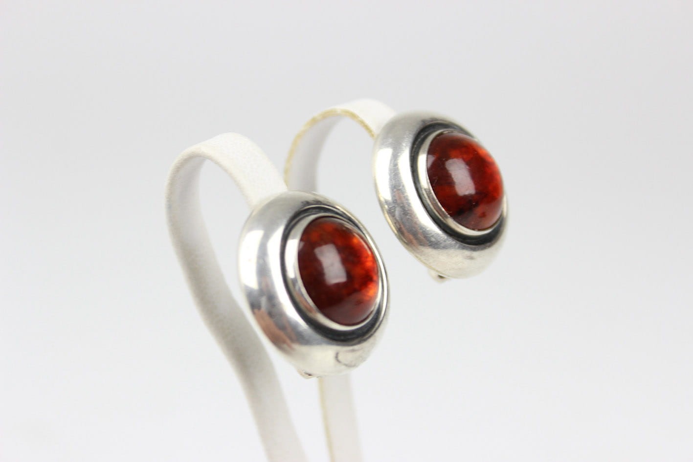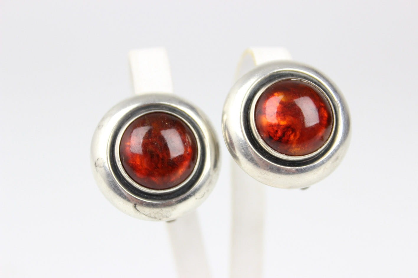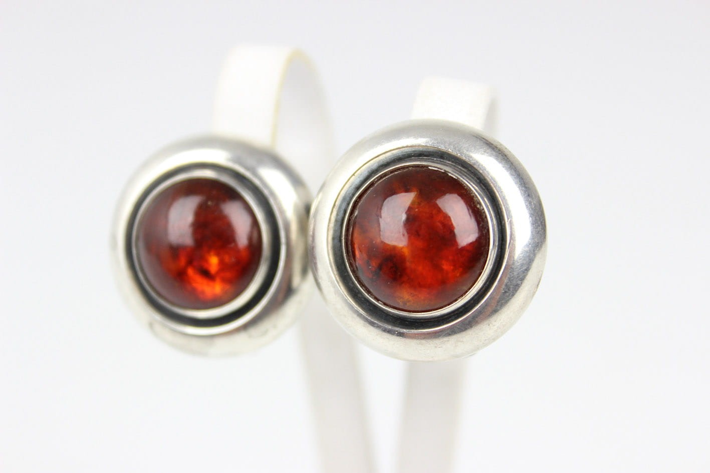 Designerskie okrągłe klipsy z lat 60/70-tych XX wieku, pochodzące z renomowanej duńskiej wytwórni jubilerskiej Nielsa Erika From. Wyrób wykonany w srebrze, sygnowany puncą STERLING DENMARK N.E.FROM 925S. Centralną część klipsów zdobi okazały bursztyn bałtycki w szlifie kaboszonowym. Zapięcia sprawne i mocne. Wymiary:
