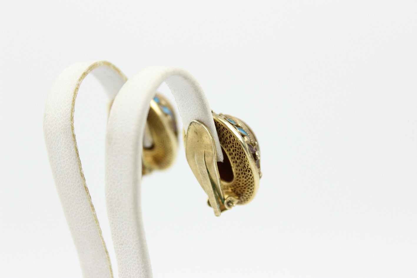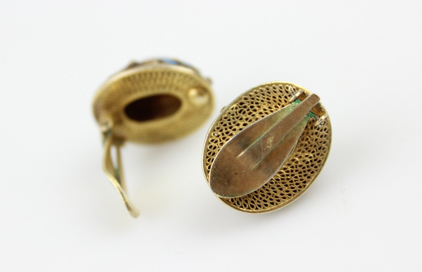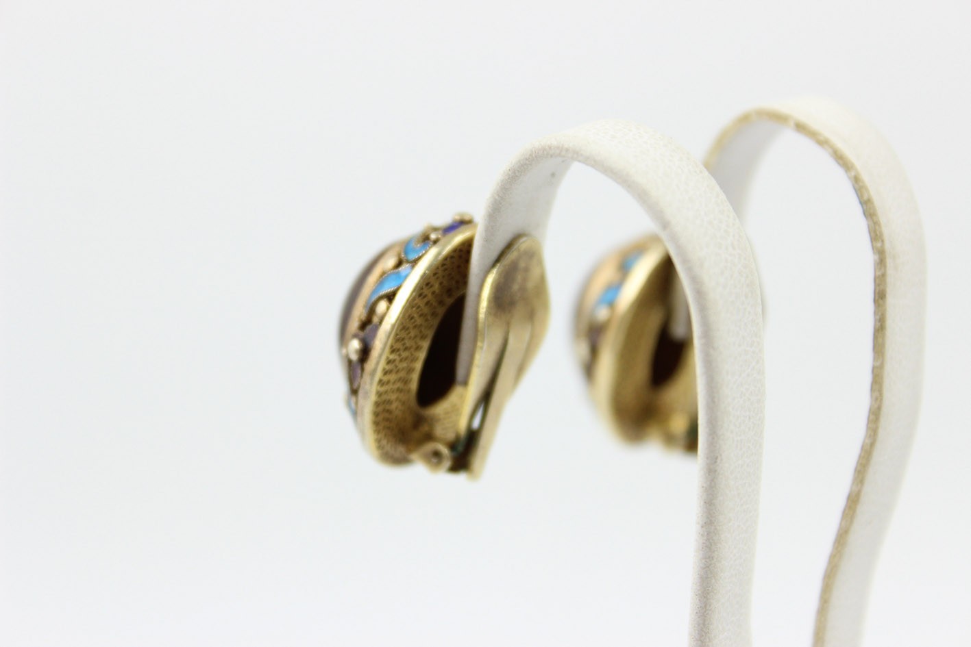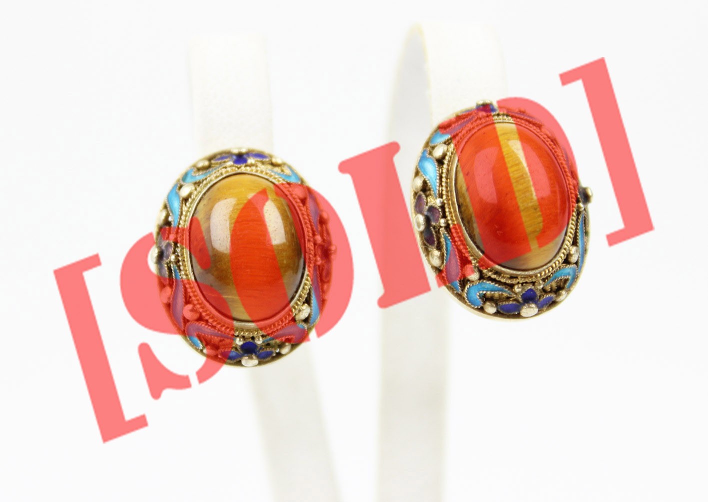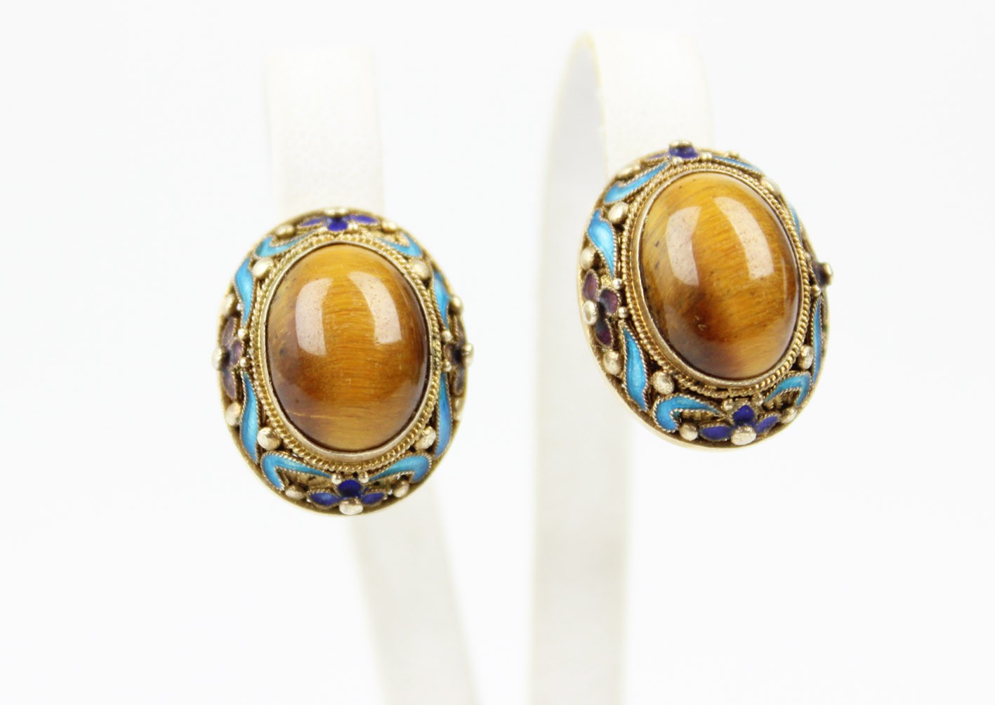 Dekoracyjna para klipsów pochodzenia chińskiego, powstała w latach 60. XX wieku jako część eksportowej biżuterii przeznaczonej na rynek europejski i do USA. Wykonane ze srebra złoconego o bogatej, filigranowej strukturze zdobionej barwną emalią w odcieniach błękitu, fioletu i kobaltu, z finezyjnymi motywami kwiatów i liści. Centralnie osadzone wypukłe kaboszony z naturalnego tygrysiego oka nadają całości elegancji i ciepłego blasku. Migotliwe pasma świetlne w kamieniach pięknie kontrastują z chłodnym tonem emalii i złocenia. Z uwagi na delikatną, ażurową konstrukcję klipsy nie posiadają puncy srebra – zawartość metalu potwierdzono badaniem kwasowym.