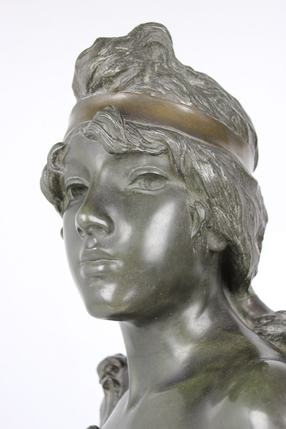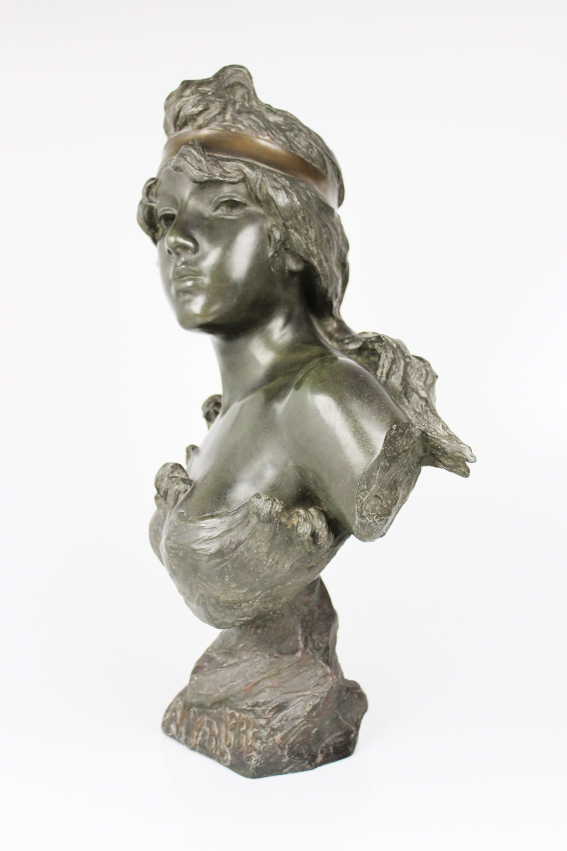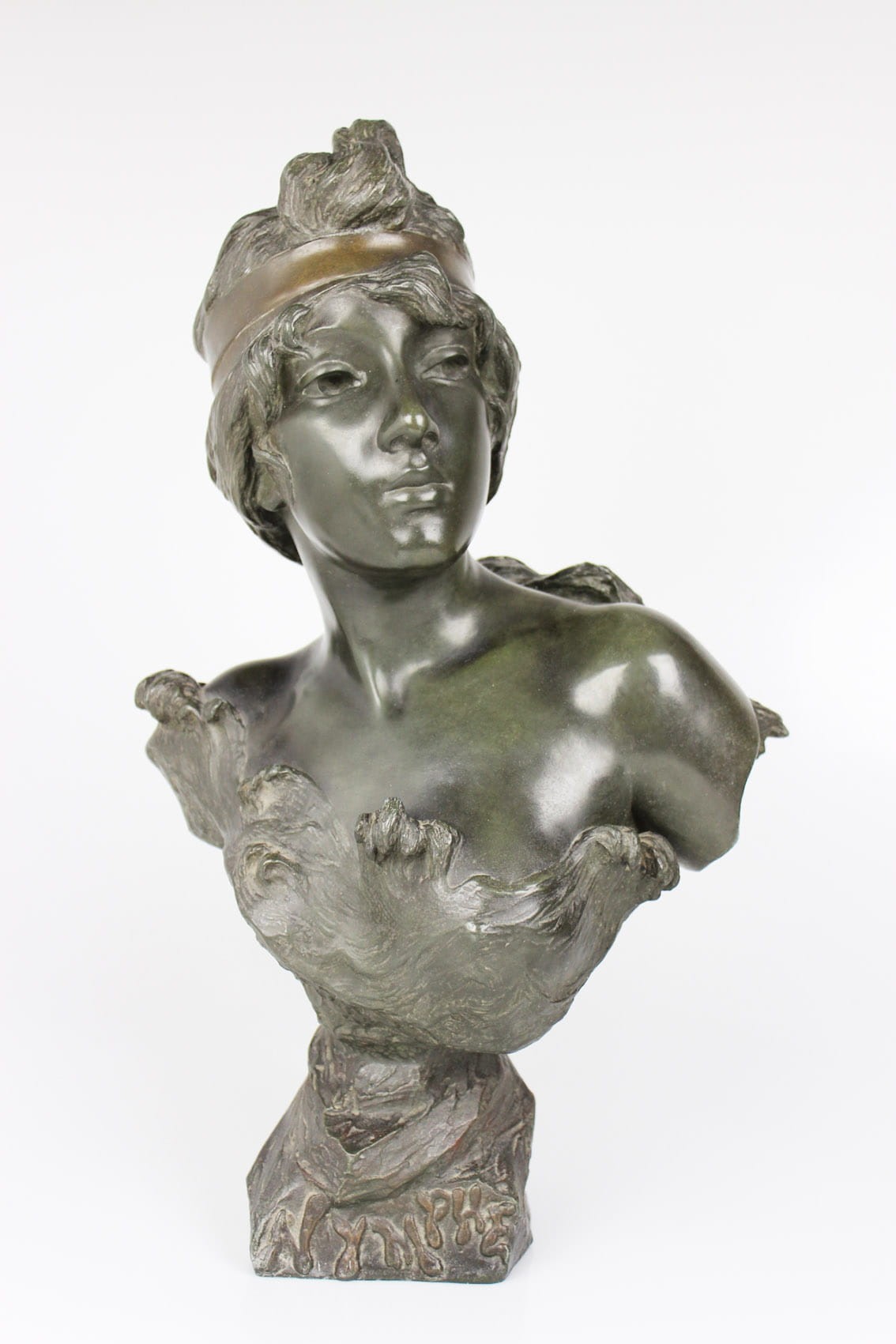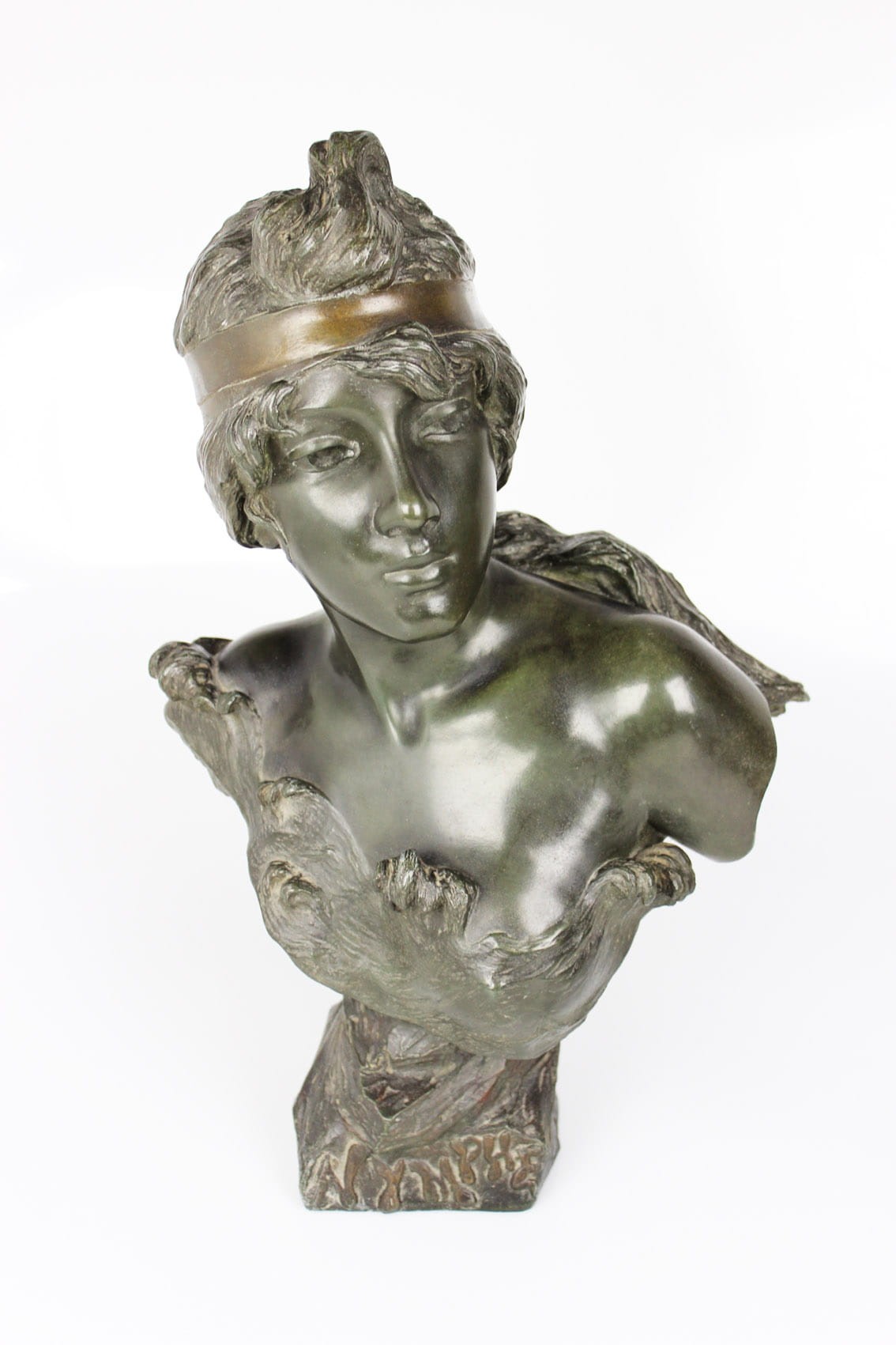 Okazałe popiersie młodej kobiety zatytułowane "Nymphe" wykonane przez znakomitego francuskiego rzeźbiarza Emmanuela Vilanis ( 1858-1914). Dzieło z pierwszego dziesięciolecia XX wieku wykonane w brązowionym i patynowanym cynku. Figura sygnowana na lewym ramieniu popisem artysty E. Villanis. Całość w bardzo dobrym stanie zachowania bez jakichkolwiek przetarć, czy uszkodzeń. Wymiary: