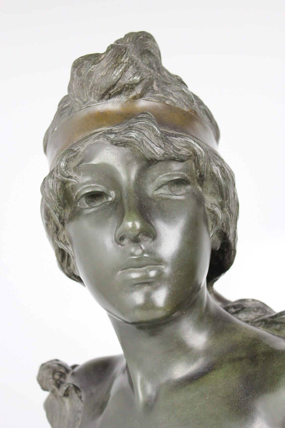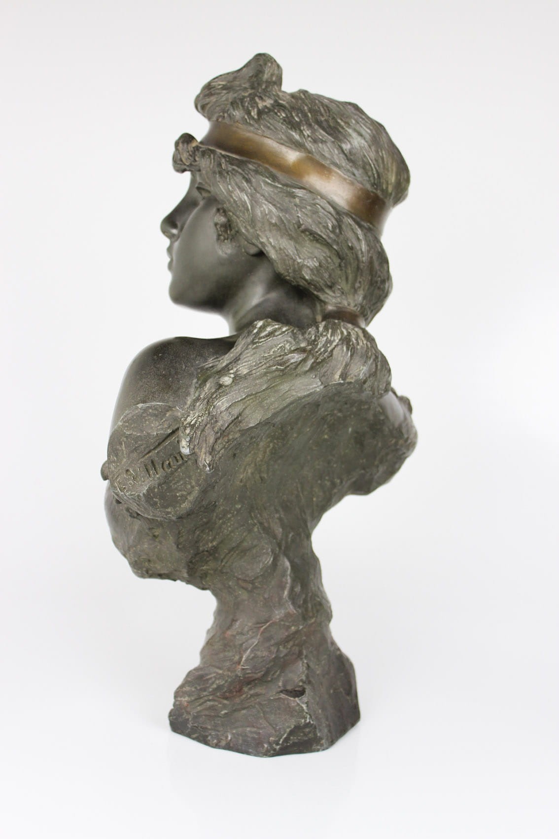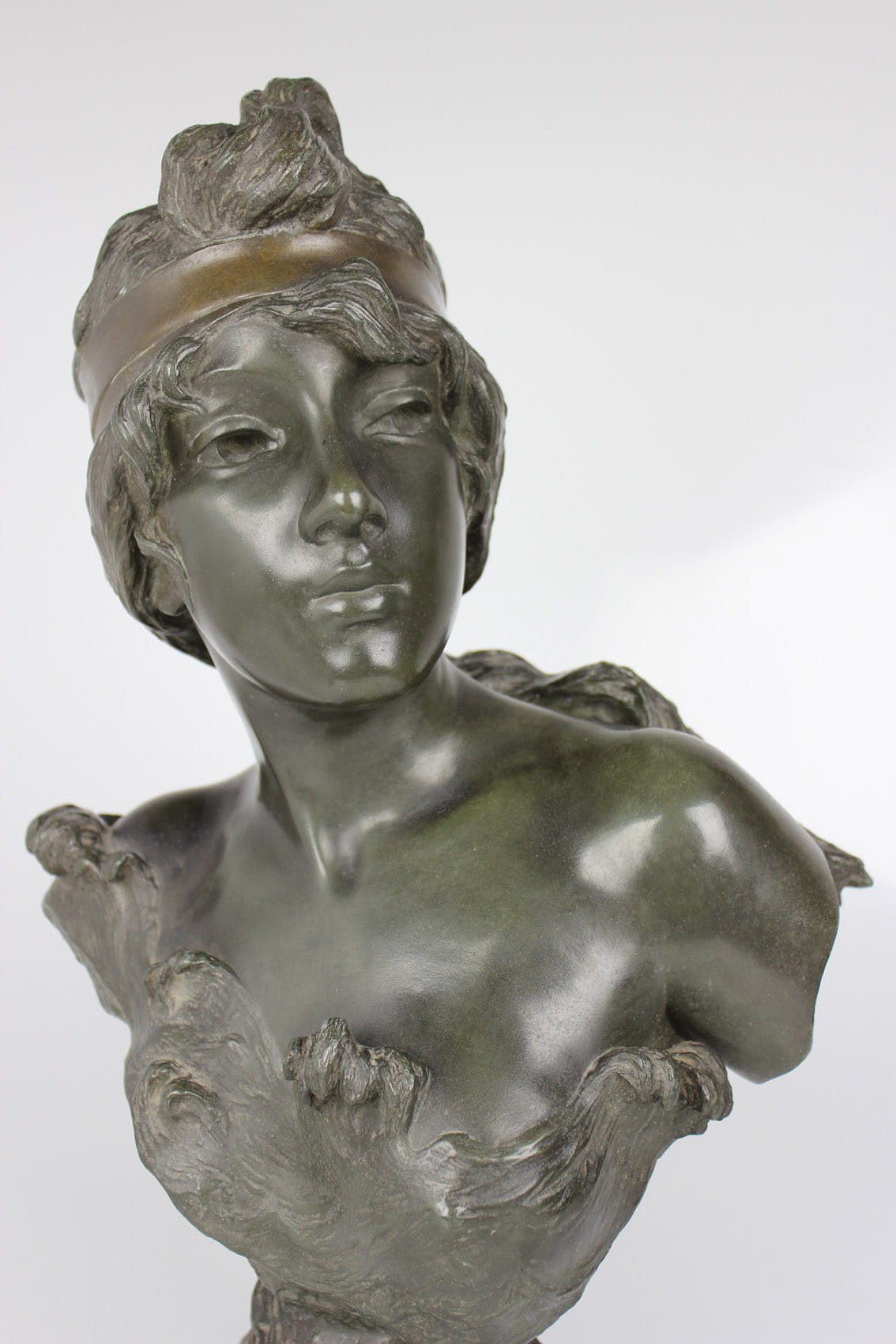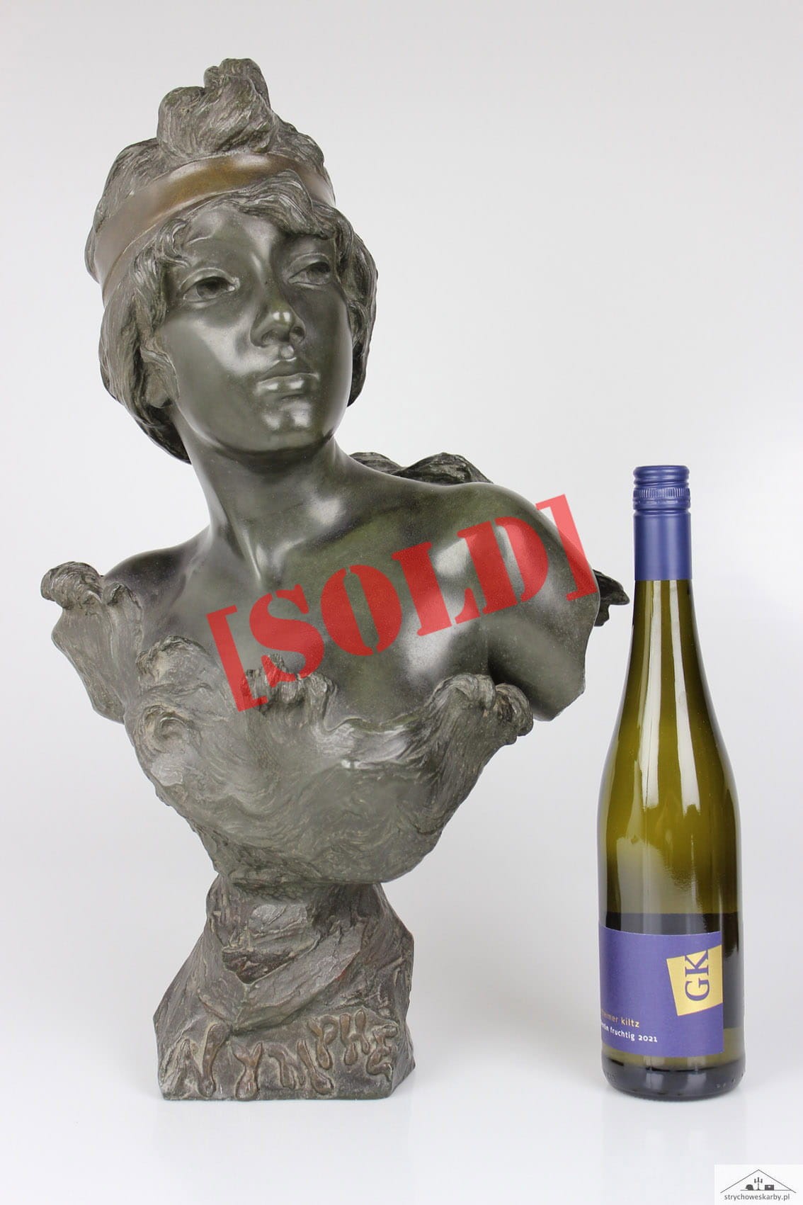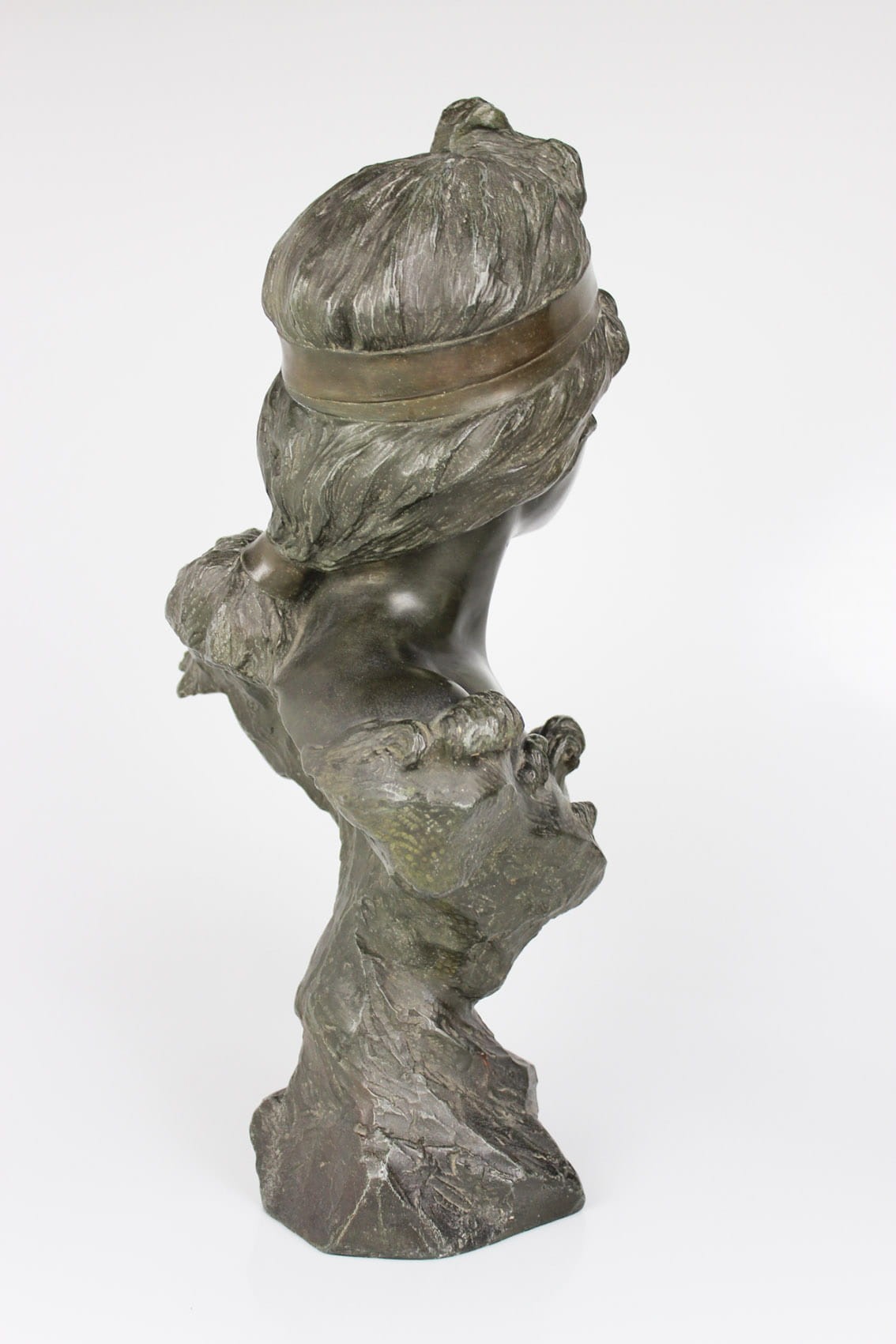 Okazałe popiersie młodej kobiety zatytułowane "Nymphe" wykonane przez znakomitego francuskiego rzeźbiarza Emmanuela Vilanis ( 1858-1914). Dzieło z pierwszego dziesięciolecia XX wieku wykonane w brązowionym i patynowanym cynku. Figura sygnowana na lewym ramieniu popisem artysty E. Villanis. Całość w bardzo dobrym stanie zachowania bez jakichkolwiek przetarć, czy uszkodzeń. Wymiary: