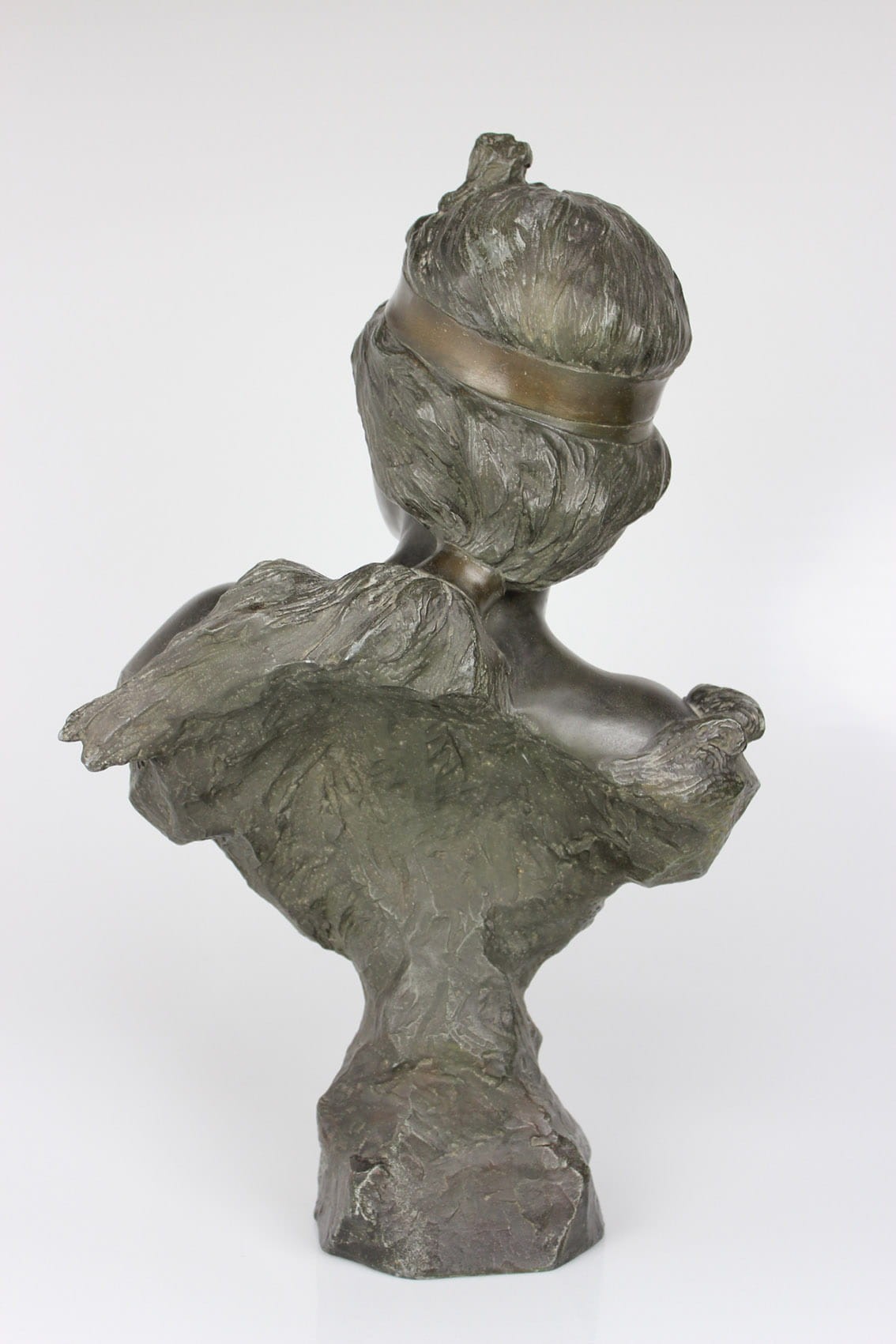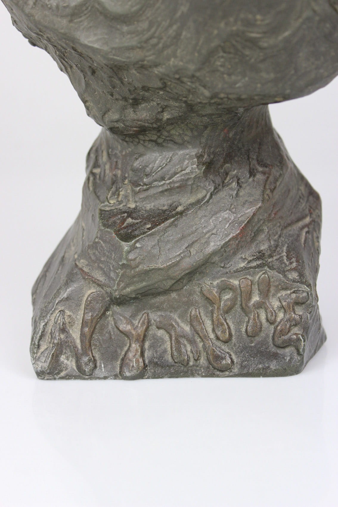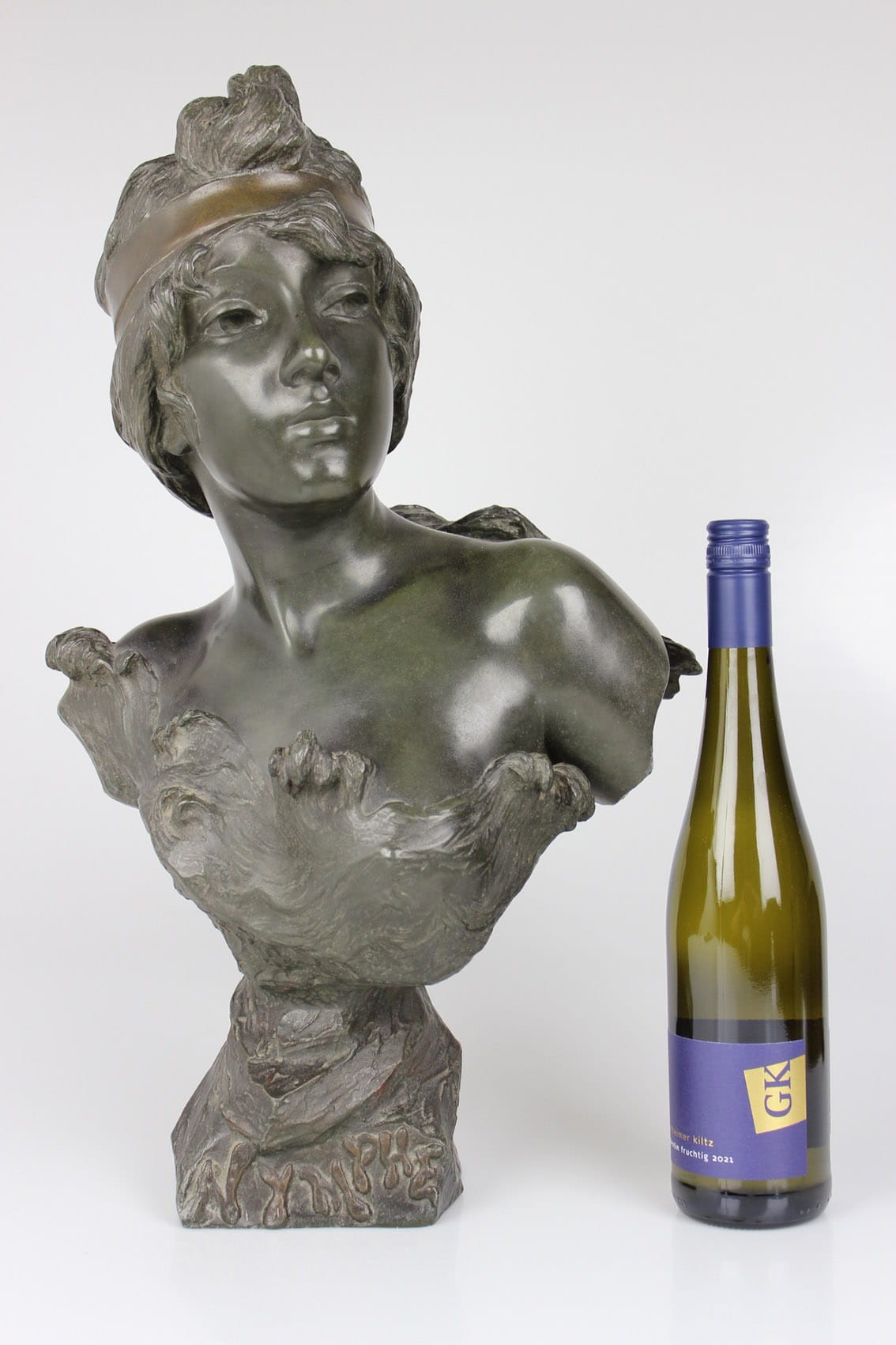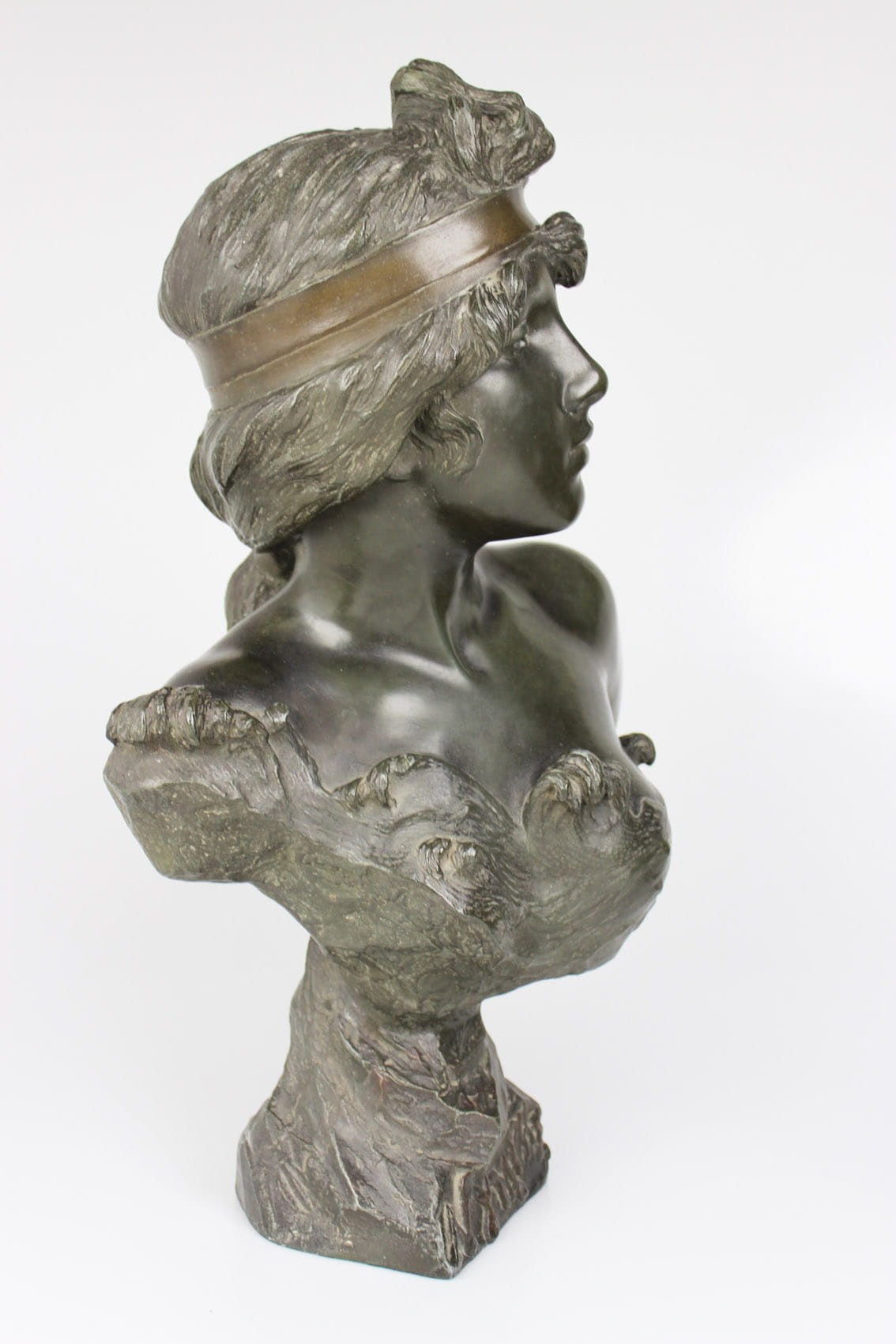 Okazałe popiersie młodej kobiety zatytułowane "Nymphe" wykonane przez znakomitego francuskiego rzeźbiarza Emmanuela Vilanis ( 1858-1914). Dzieło z pierwszego dziesięciolecia XX wieku wykonane w brązowionym i patynowanym cynku. Figura sygnowana na lewym ramieniu popisem artysty E. Villanis. Całość w bardzo dobrym stanie zachowania bez jakichkolwiek przetarć, czy uszkodzeń. Wymiary: