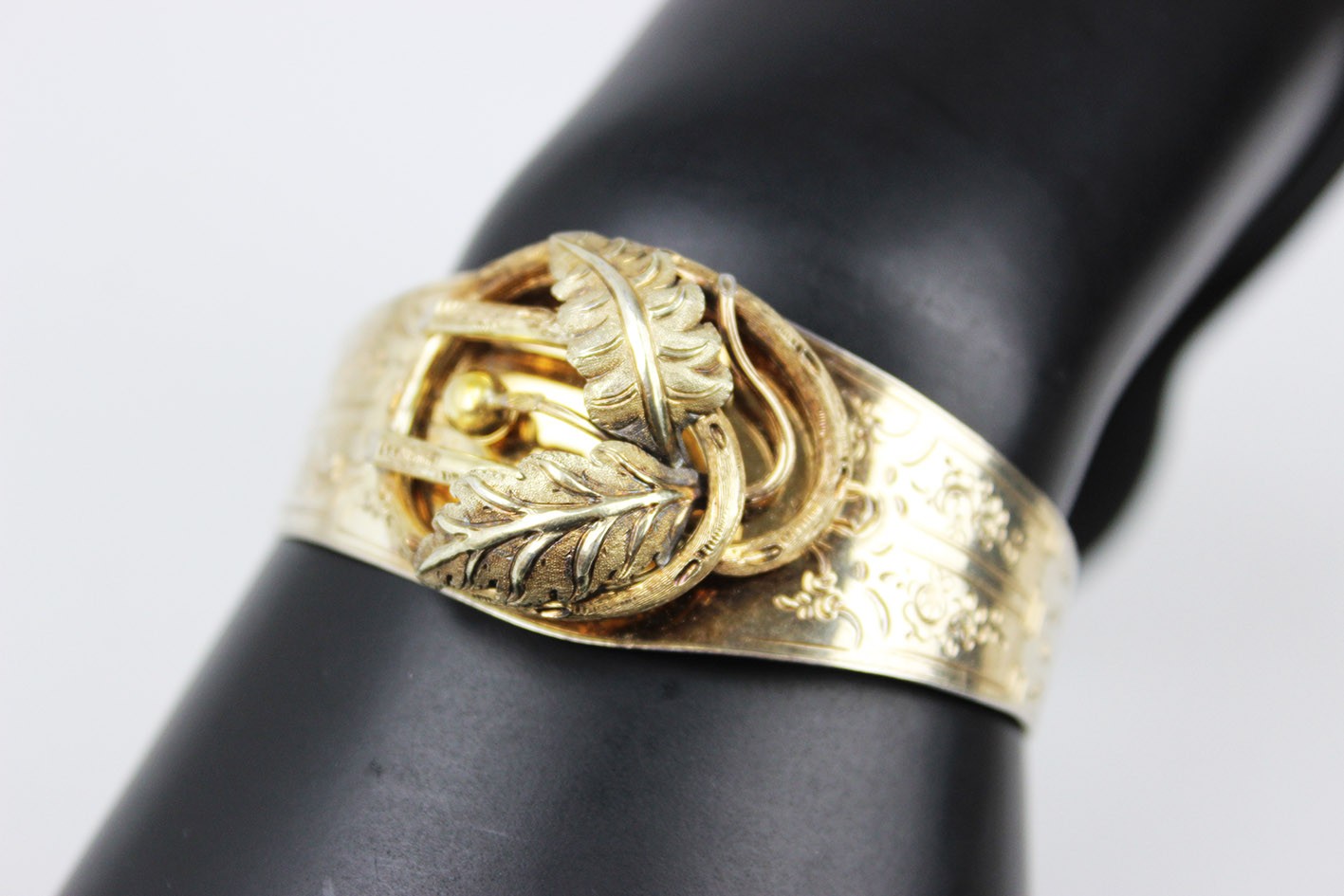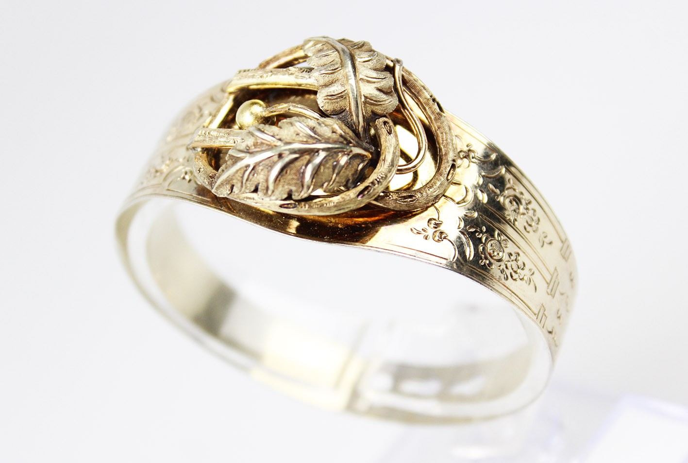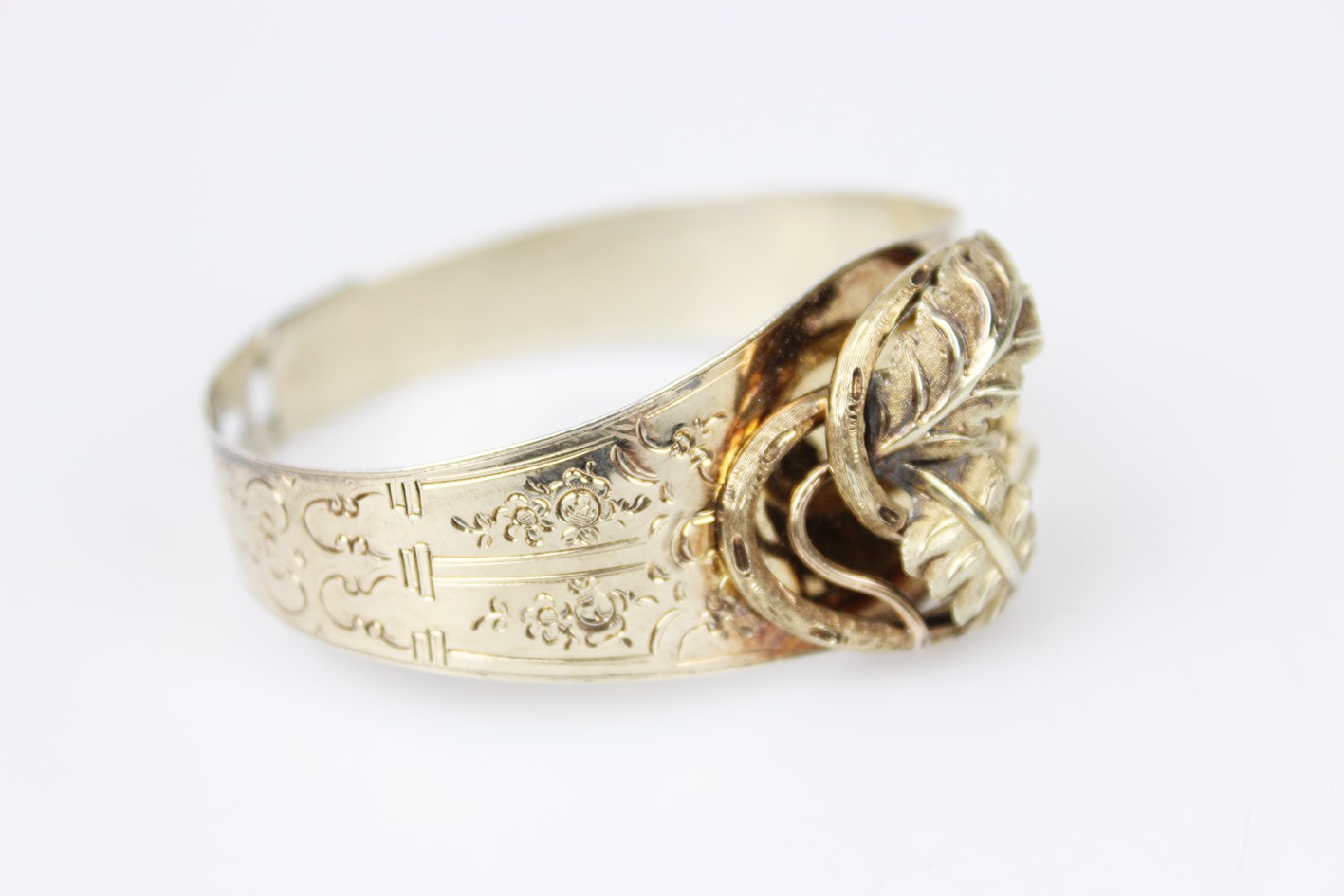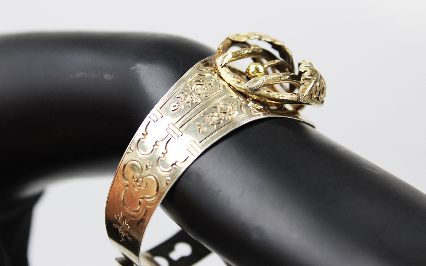 Kompozycja bransolety opiera się na bogato modelowanym, trójwymiarowym ornamencie roślinnym: przeplatających się liściach, wijących się wstęgach i drobnych, dekoracyjnych akcentach, tworzących pełną głębi i ruchu strukturę o wyraźnie wypukłej formie. Centralny motyw, budowany z nakładanych elementów w których symbolika natury — liść, gałązka, pąk — odgrywała kluczową rolę i miała budować przekaz romantyczny lub sentymentalny. Obręcz bransolety ozdobiona jest delikatnym, koronkowym grawerem floralnym, charakterystycznym dla francuskiego neorokoka. Od wewnętrznej strony zastosowano niezwykle ciekawy, rzadko spotykany system regulacji w postaci trzech otworów, pozwalających dopasować obwód. Wymiary:
