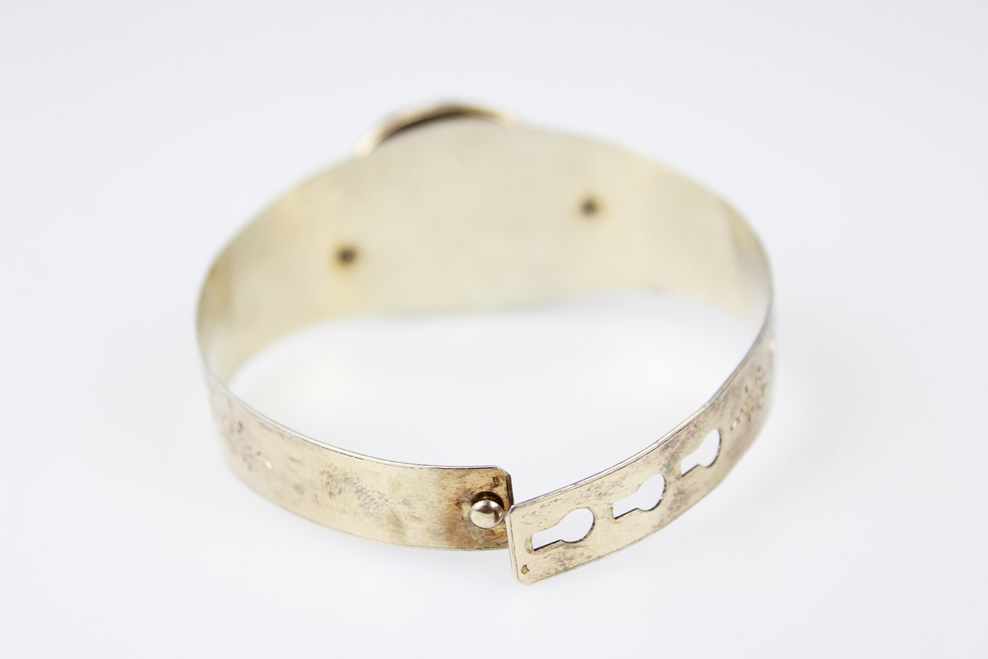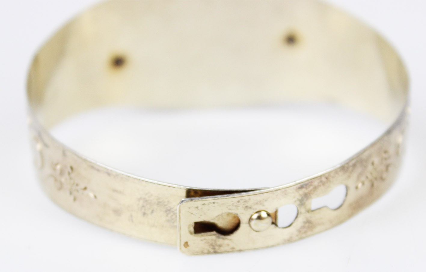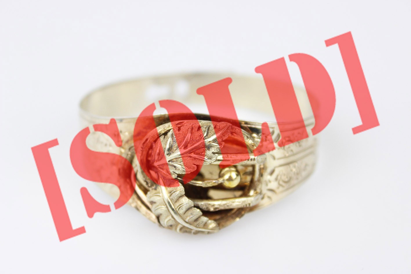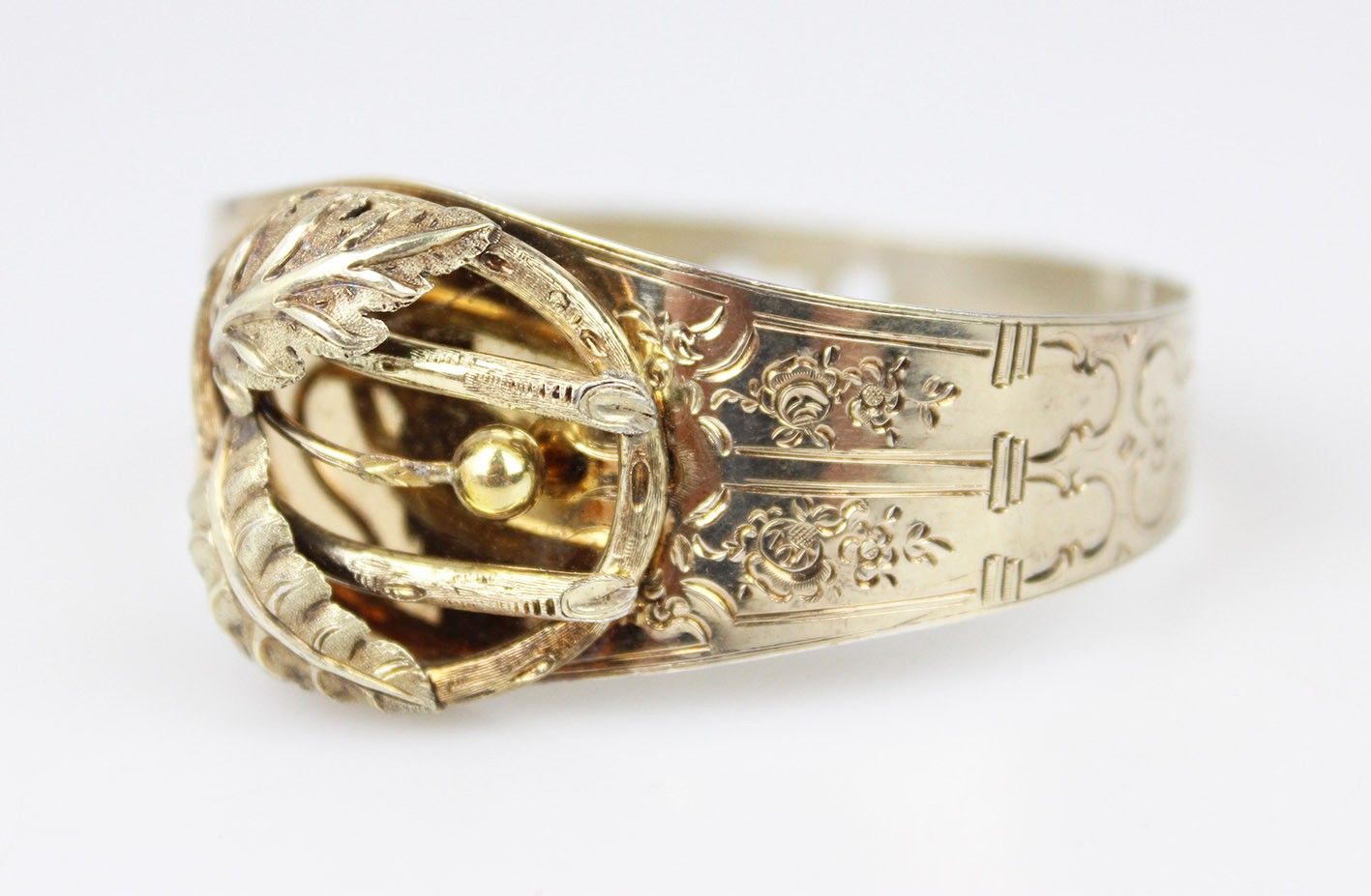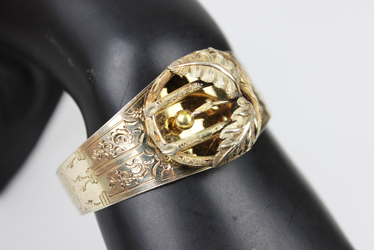 Kompozycja bransolety opiera się na bogato modelowanym, trójwymiarowym ornamencie roślinnym: przeplatających się liściach, wijących się wstęgach i drobnych, dekoracyjnych akcentach, tworzących pełną głębi i ruchu strukturę o wyraźnie wypukłej formie. Centralny motyw, budowany z nakładanych elementów w których symbolika natury — liść, gałązka, pąk — odgrywała kluczową rolę i miała budować przekaz romantyczny lub sentymentalny. Obręcz bransolety ozdobiona jest delikatnym, koronkowym grawerem floralnym, charakterystycznym dla francuskiego neorokoka. Od wewnętrznej strony zastosowano niezwykle ciekawy, rzadko spotykany system regulacji w postaci trzech otworów, pozwalających dopasować obwód. Wymiary:
