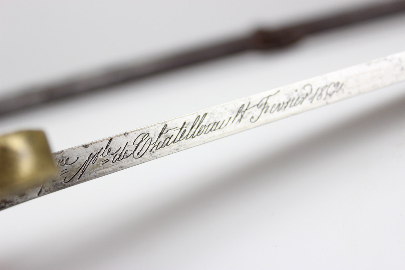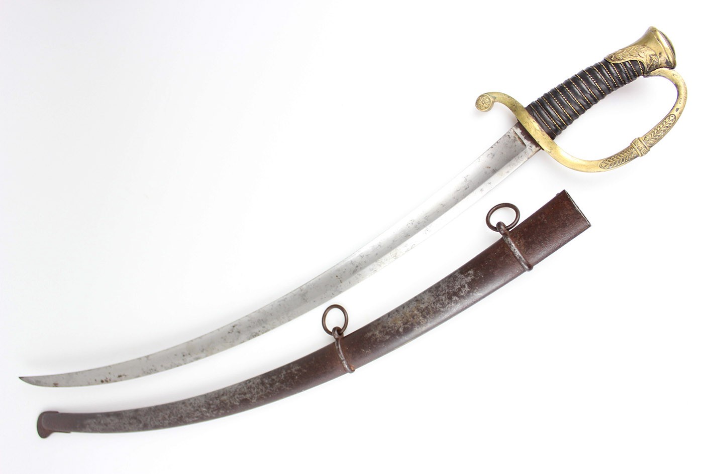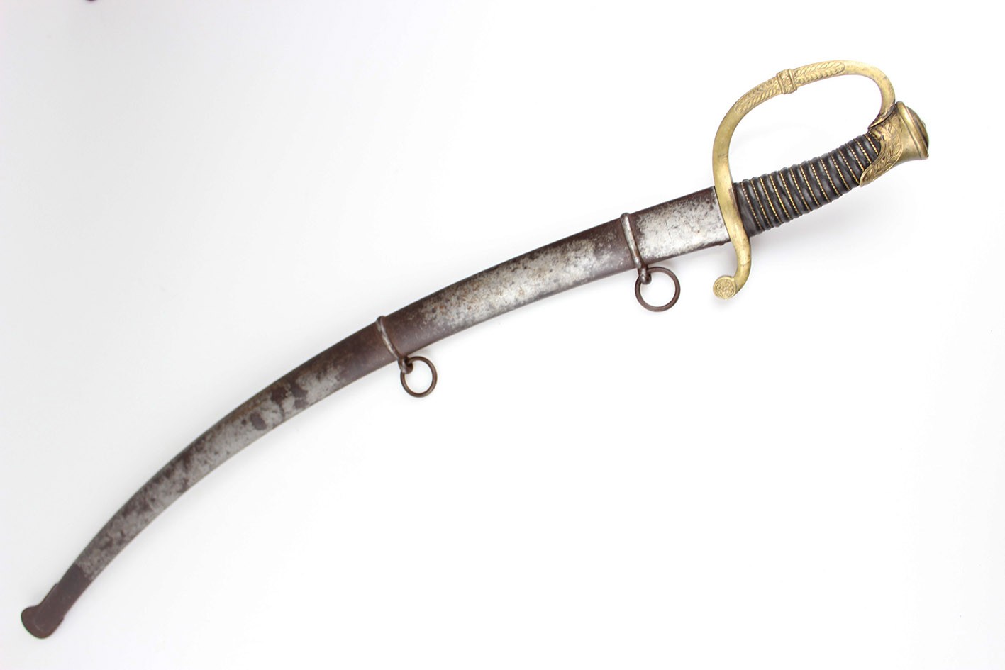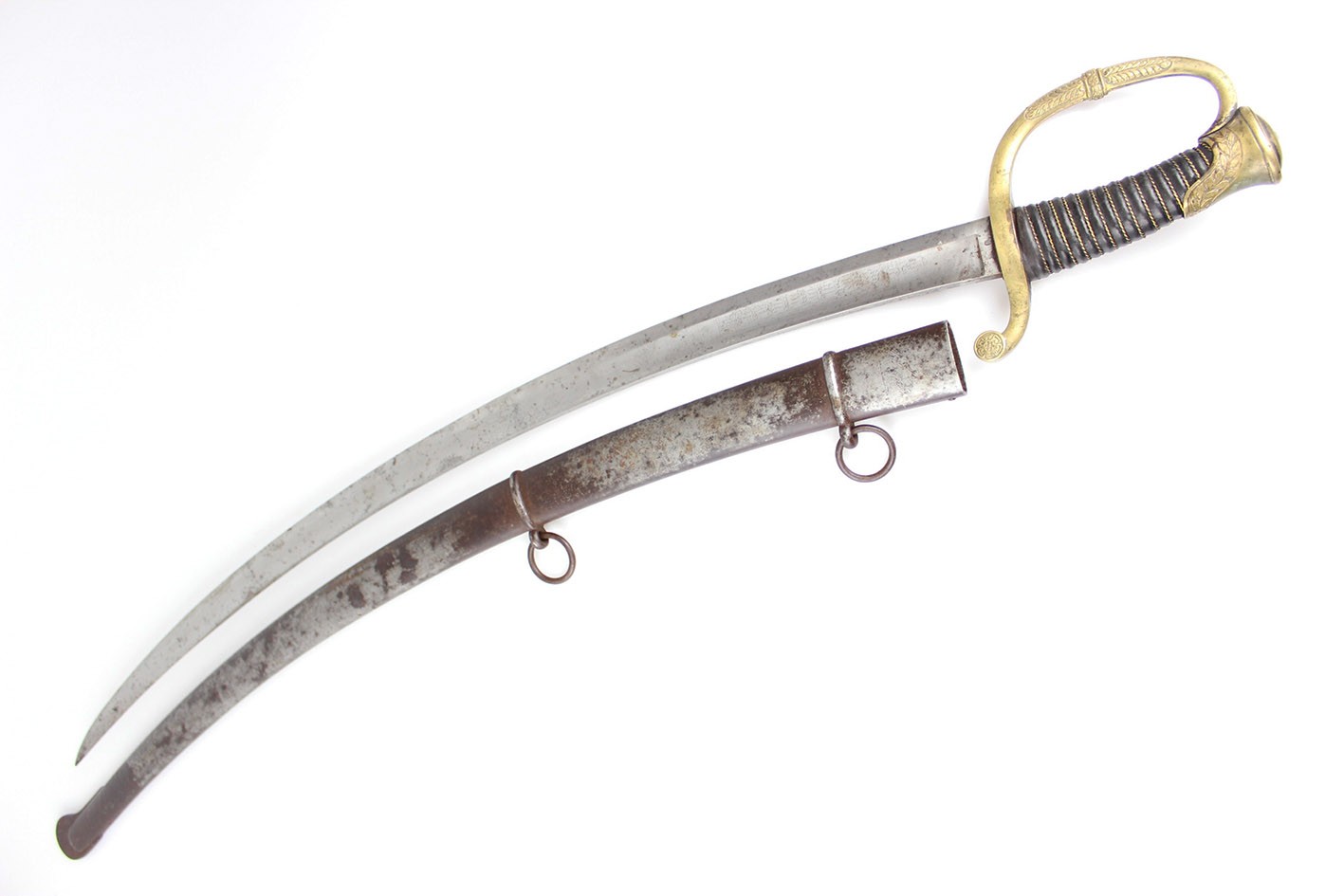 Bojowa francuska szabla oficera artylerii konnej wz. 1829, tzw "taborowa". Głownia obustronnie wklęsło szlifowana z płaskim grzbietem i obosiecznym piórem o sztychu przygrzbietowym. Na głowni widoczne wygrawerowane tabele artyleryjskie do ostrzałów armatami 12 funtowymi, 8 funtowymi oraz mniejszymi, Rękojeść zamknięta z jelcem mosiężnym, jednokabłąkowym. Kabłąk jelca tworzy regularny łuk, u góry połączony zamkiem z głowicą. Całość bogato zdobiona. Tylne ramię jelca odgięte ku dołowi i zakończone zdobioną łezką. Głowica owalna, lekko pochylona ku przodowi. Uchwyt drewniany, nacinany w drobne karby, obciągnięty czarną skórą i owinięty plecionym mosiężnym drutem. Na głowni widnieją cechy odbioru technicznego. Na grzbiecie widoczna sygnatura wytwórni oraz rok: Chatellerault 1852. Głownia w bardzo dobrym stanie zachowania. Pochwa z blachy stalowej w przekroju lekko owalna uzbrojona w dwie ryfki z nałożonych półokrągłych pierścieni, w których umieszczone są ruchome kółka nośne. Ostroga z przednim ramieniem dłuższym, zakończonym wydatnym wybrzuszeniem. Całość nie rozbierana, w oryginalnym stanie zachowania.