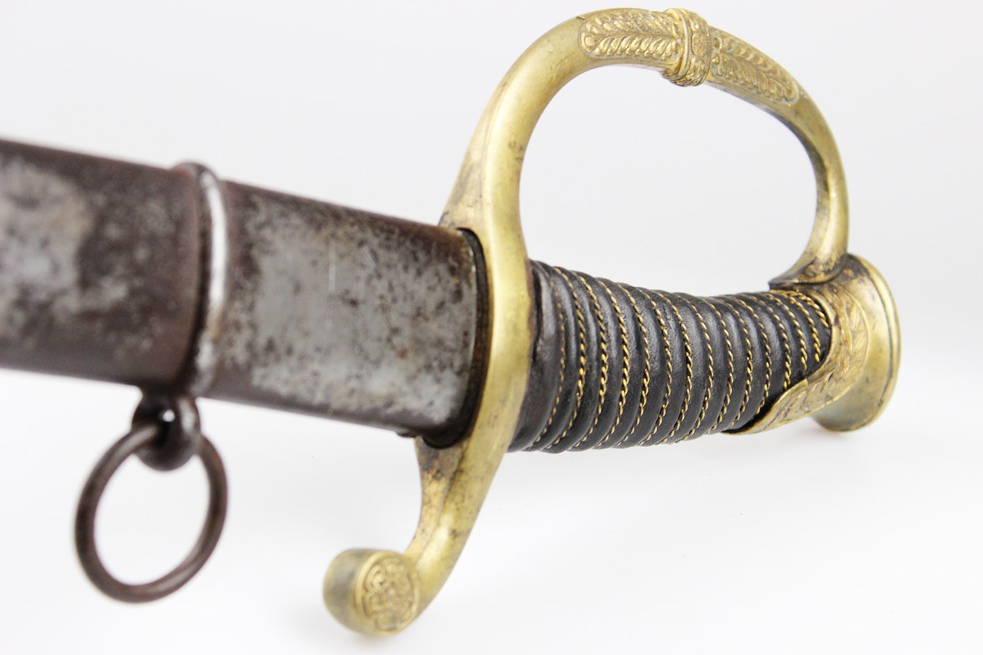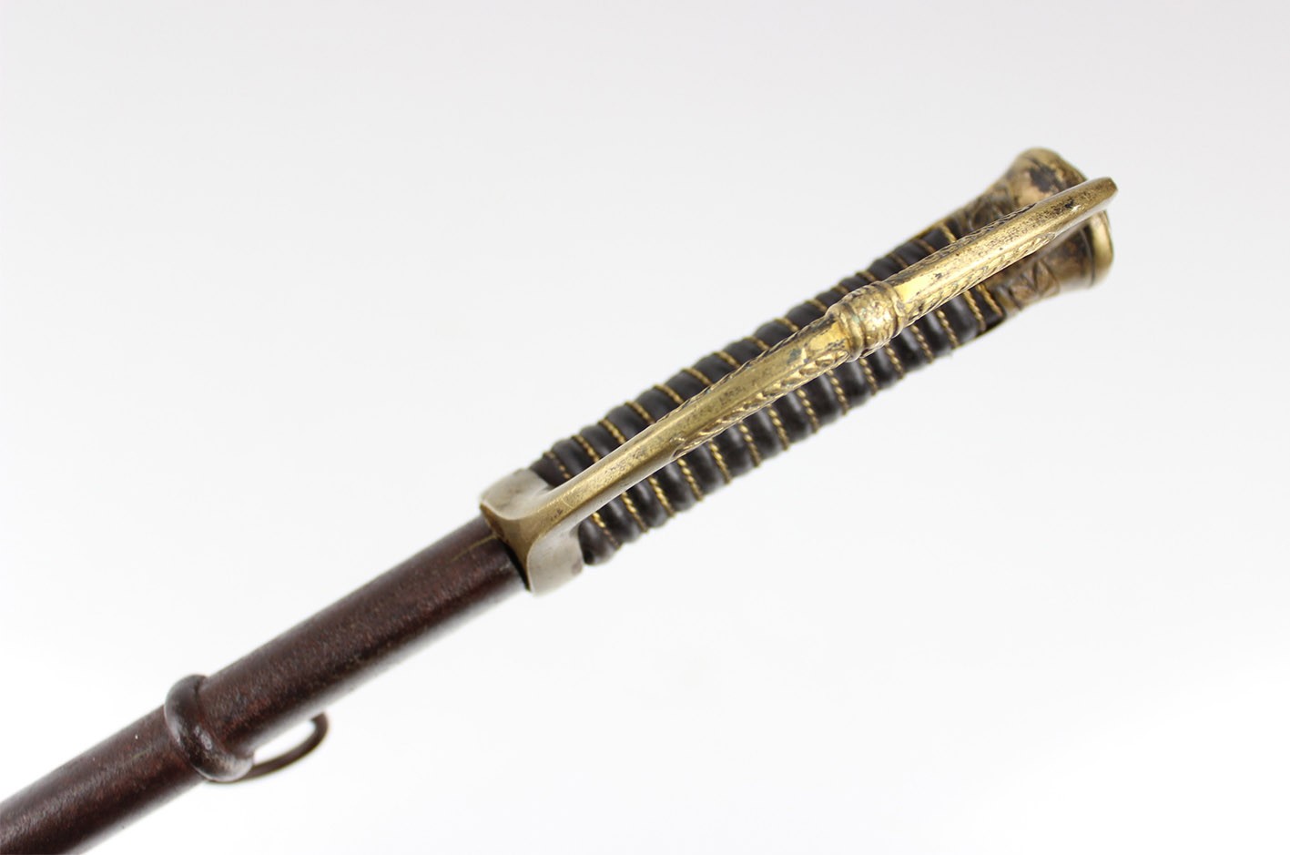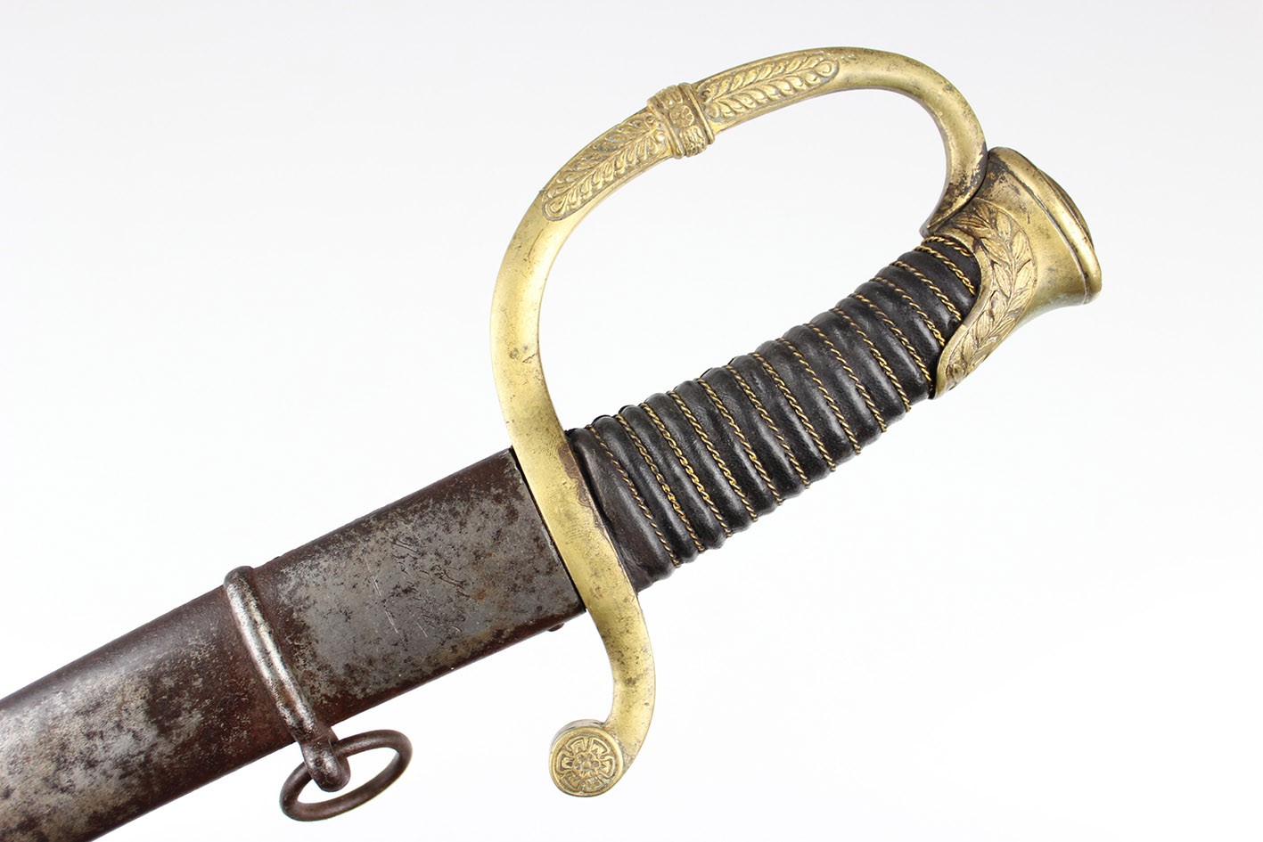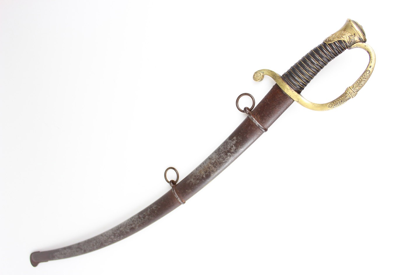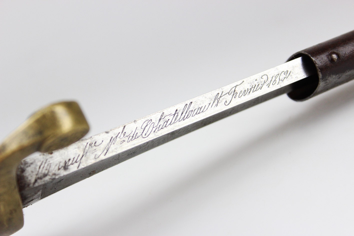 Bojowa francuska szabla oficera artylerii konnej wz. 1829, tzw "taborowa". Głownia obustronnie wklęsło szlifowana z płaskim grzbietem i obosiecznym piórem o sztychu przygrzbietowym. Na głowni widoczne wygrawerowane tabele artyleryjskie do ostrzałów armatami 12 funtowymi, 8 funtowymi oraz mniejszymi, Rękojeść zamknięta z jelcem mosiężnym, jednokabłąkowym. Kabłąk jelca tworzy regularny łuk, u góry połączony zamkiem z głowicą. Całość bogato zdobiona. Tylne ramię jelca odgięte ku dołowi i zakończone zdobioną łezką. Głowica owalna, lekko pochylona ku przodowi. Uchwyt drewniany, nacinany w drobne karby, obciągnięty czarną skórą i owinięty plecionym mosiężnym drutem. Na głowni widnieją cechy odbioru technicznego. Na grzbiecie widoczna sygnatura wytwórni oraz rok: Chatellerault 1852. Głownia w bardzo dobrym stanie zachowania. Pochwa z blachy stalowej w przekroju lekko owalna uzbrojona w dwie ryfki z nałożonych półokrągłych pierścieni, w których umieszczone są ruchome kółka nośne. Ostroga z przednim ramieniem dłuższym, zakończonym wydatnym wybrzuszeniem. Całość nie rozbierana, w oryginalnym stanie zachowania.