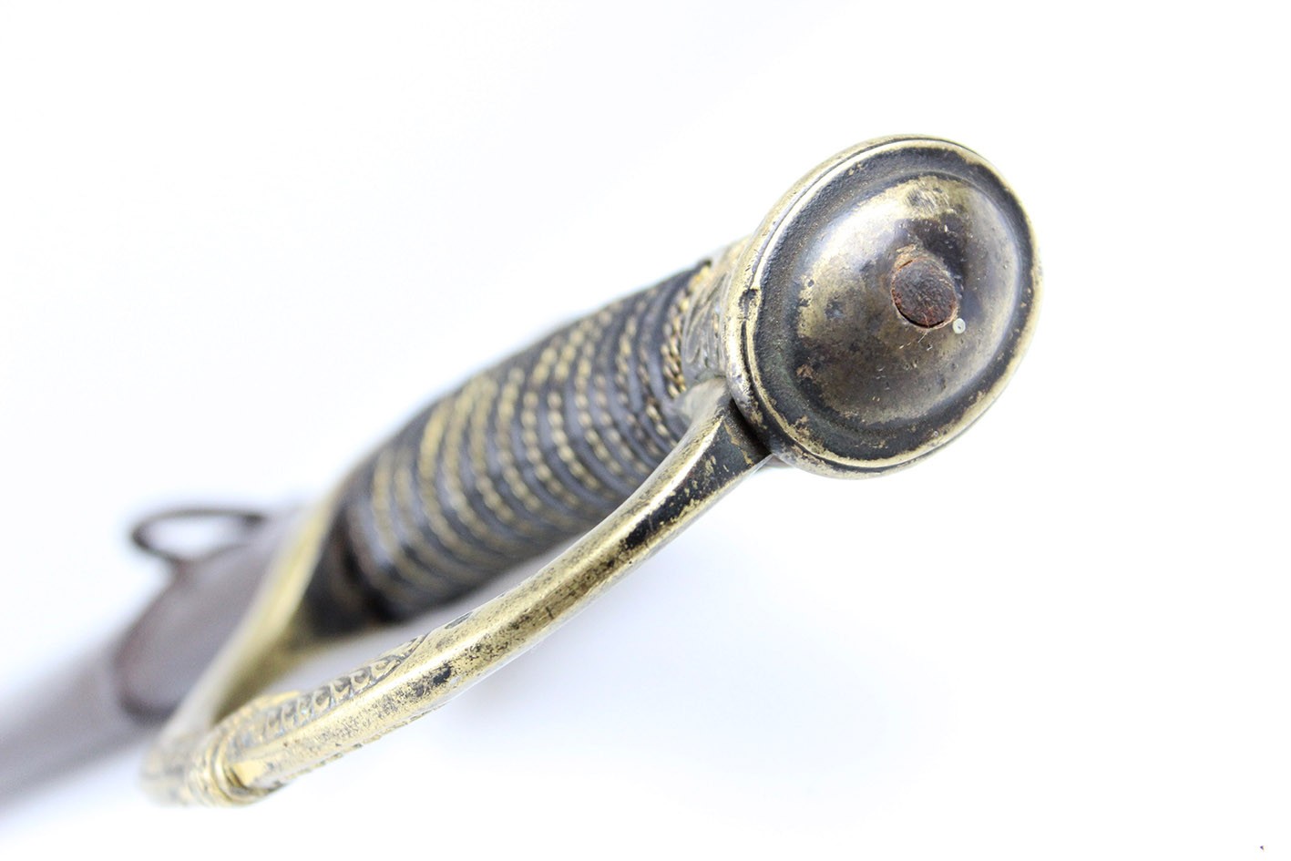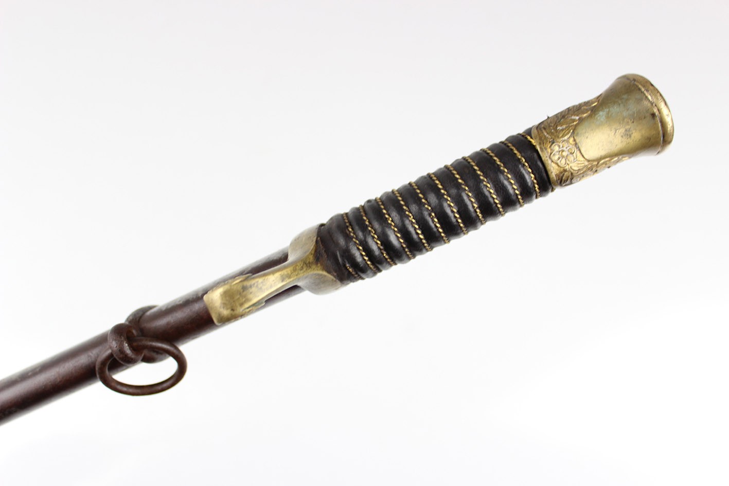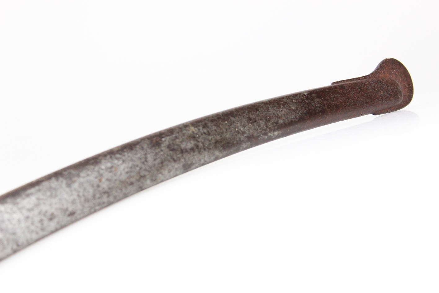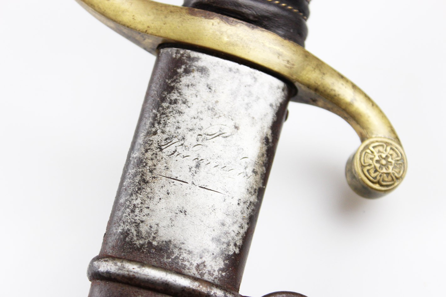 Bojowa francuska szabla oficera artylerii konnej wz. 1829, tzw "taborowa". Głownia obustronnie wklęsło szlifowana z płaskim grzbietem i obosiecznym piórem o sztychu przygrzbietowym. Na głowni widoczne wygrawerowane tabele artyleryjskie do ostrzałów armatami 12 funtowymi, 8 funtowymi oraz mniejszymi, Rękojeść zamknięta z jelcem mosiężnym, jednokabłąkowym. Kabłąk jelca tworzy regularny łuk, u góry połączony zamkiem z głowicą. Całość bogato zdobiona. Tylne ramię jelca odgięte ku dołowi i zakończone zdobioną łezką. Głowica owalna, lekko pochylona ku przodowi. Uchwyt drewniany, nacinany w drobne karby, obciągnięty czarną skórą i owinięty plecionym mosiężnym drutem. Na głowni widnieją cechy odbioru technicznego. Na grzbiecie widoczna sygnatura wytwórni oraz rok: Chatellerault 1852. Głownia w bardzo dobrym stanie zachowania. Pochwa z blachy stalowej w przekroju lekko owalna uzbrojona w dwie ryfki z nałożonych półokrągłych pierścieni, w których umieszczone są ruchome kółka nośne. Ostroga z przednim ramieniem dłuższym, zakończonym wydatnym wybrzuszeniem. Całość nie rozbierana, w oryginalnym stanie zachowania.