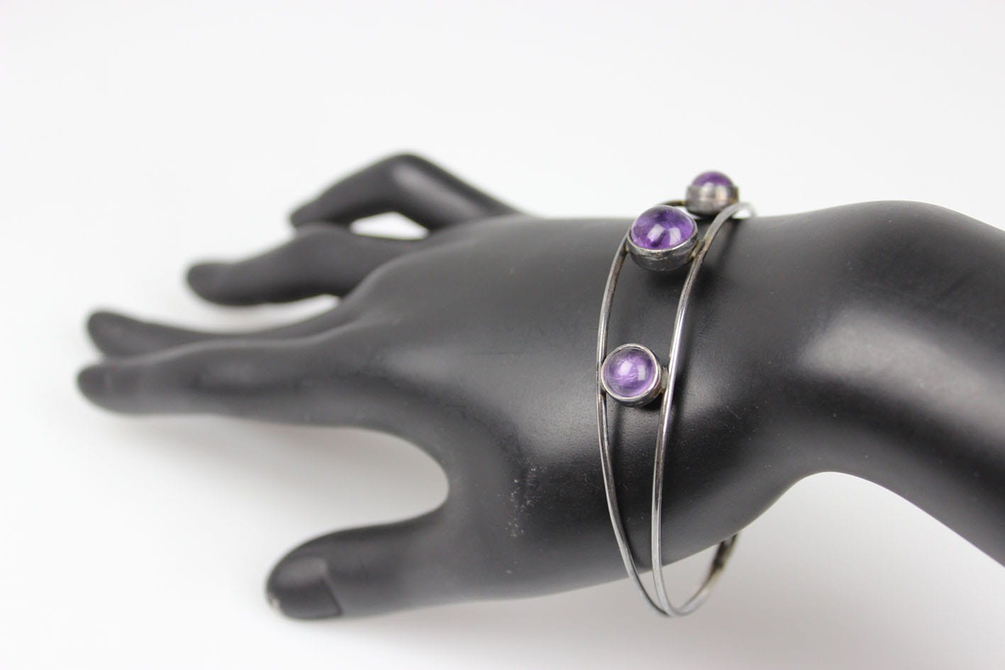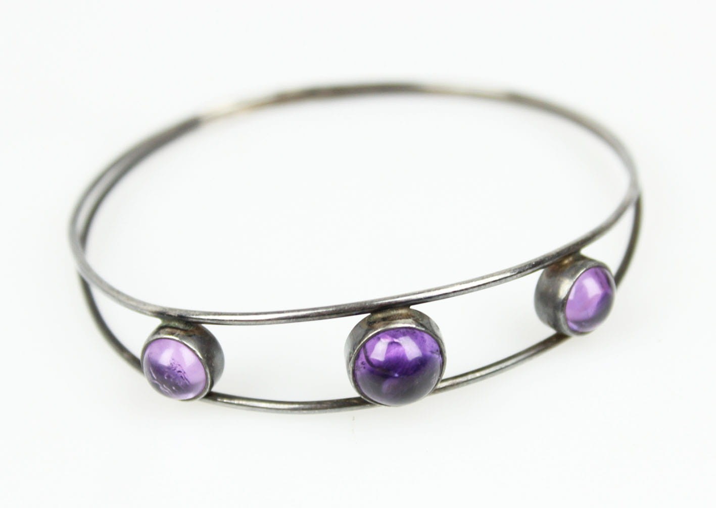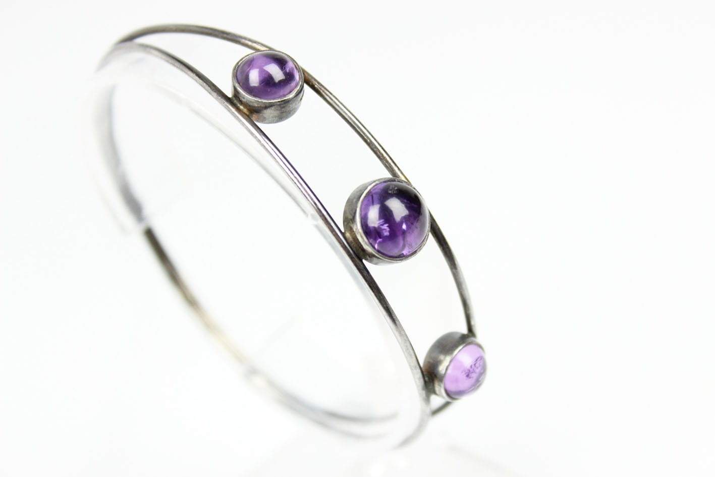 Oryginalna bransoletka w formie koła kameryzowana ametystami w szlife kaboszonowym. Bransoletka pochodzi ze starej, renomowanej wytwórni założonej w 1771 roku przez Georga Kramera. Bransoletkę wykonano w srebrze próby 835. Sygnatura od spodu: punca artysty, próbą i numerem modelu. Bardzo dobry stan zachowania z delikatną wiekową patynką. Wymiary: