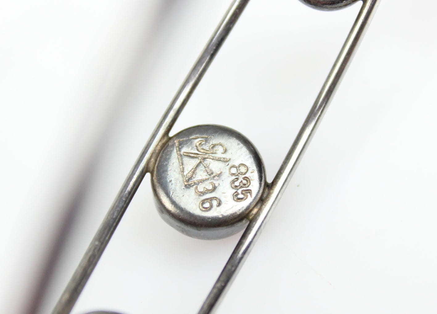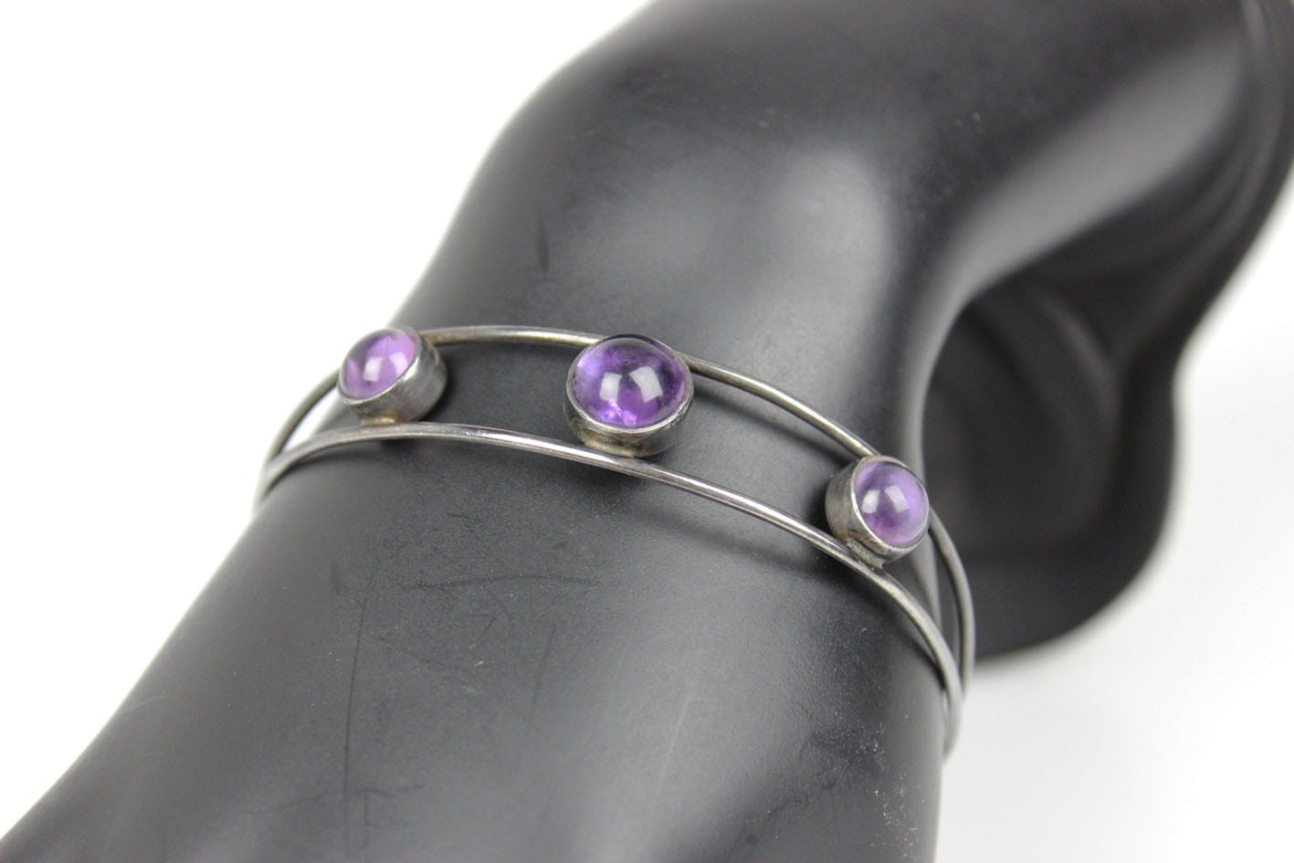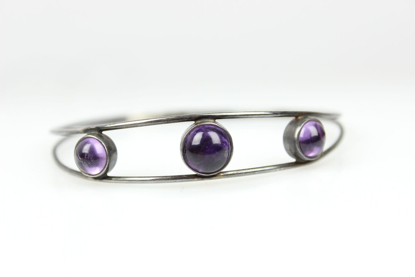 Oryginalna bransoletka w formie koła kameryzowana ametystami w szlife kaboszonowym. Bransoletka pochodzi ze starej, renomowanej wytwórni założonej w 1771 roku przez Georga Kramera. Bransoletkę wykonano w srebrze próby 835. Sygnatura od spodu: punca artysty, próbą i numerem modelu. Bardzo dobry stan zachowania z delikatną wiekową patynką. Wymiary: