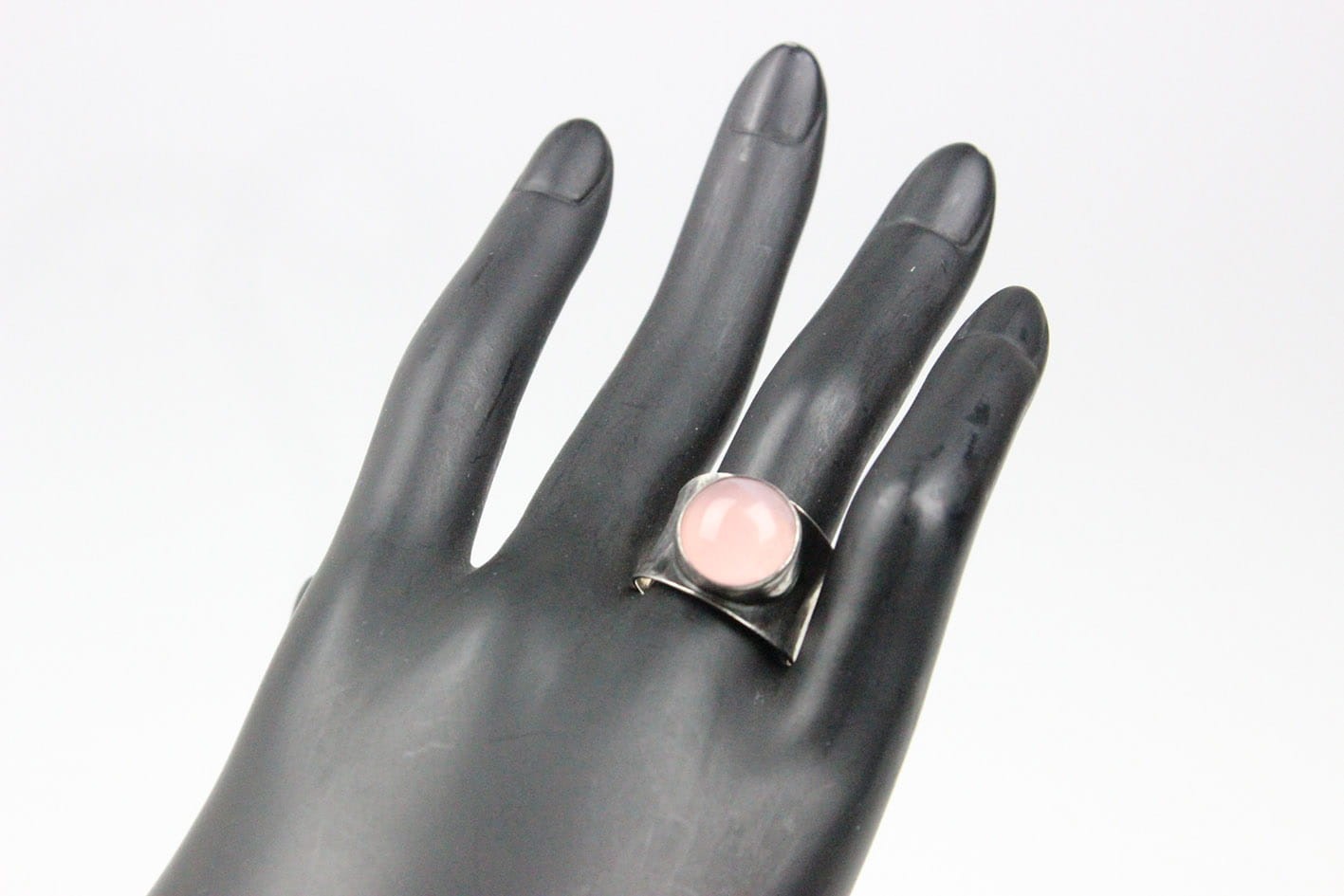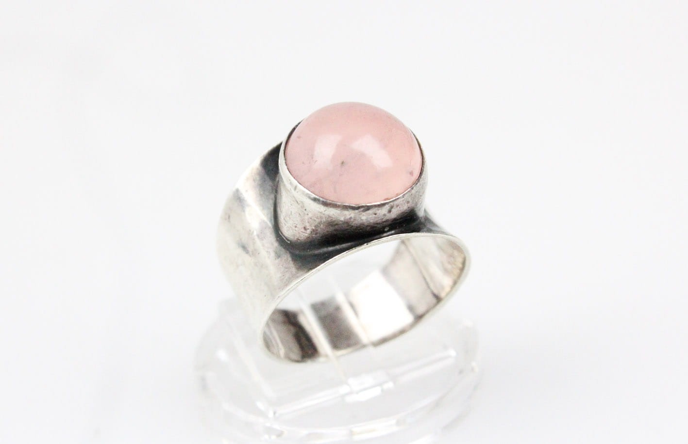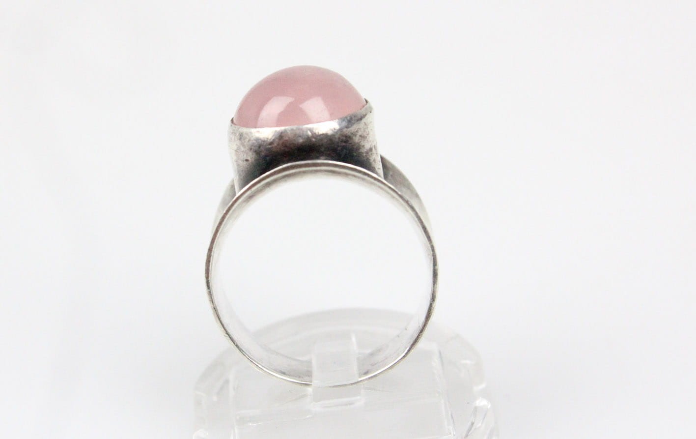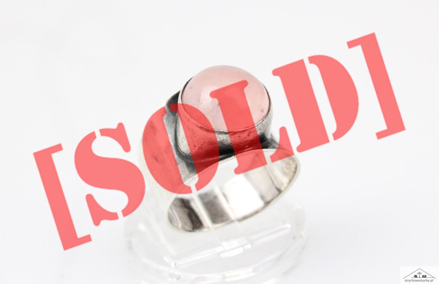 Autorski pierścionek z różowym kwarcem pochodzący z lat 50/60-tych XX wieku. Przedmiot wykonany z pracowni złotniczej Georga Kramera. Pierścionek wykonano w srebrze próby 835. Sygnatura od spodu: punca artysty, próbą i numerem modelu. Bardzo dobry stan zachowania z delikatną wiekową patynką. Wymiary: