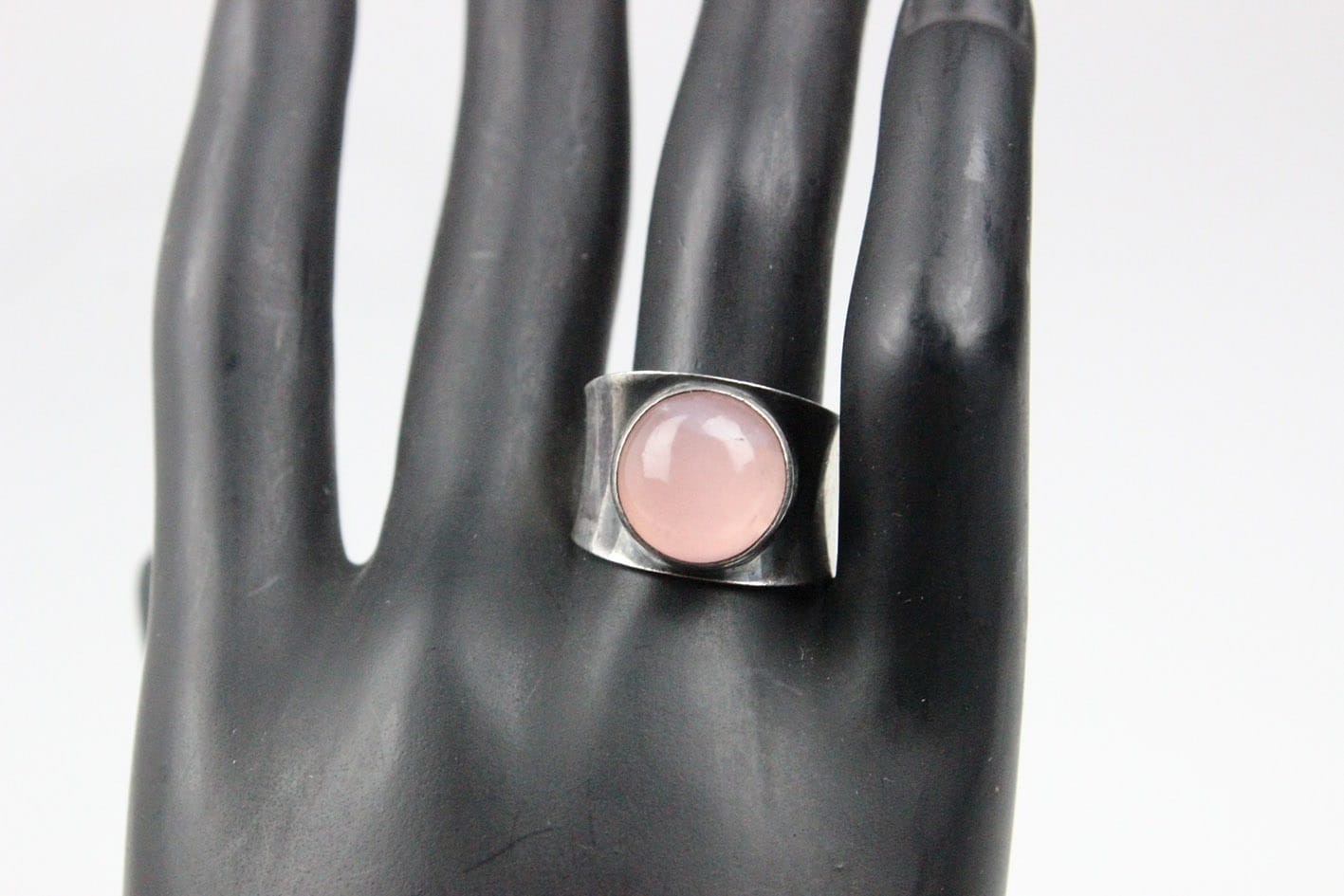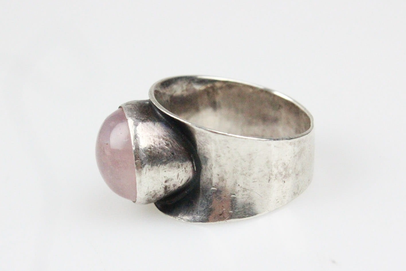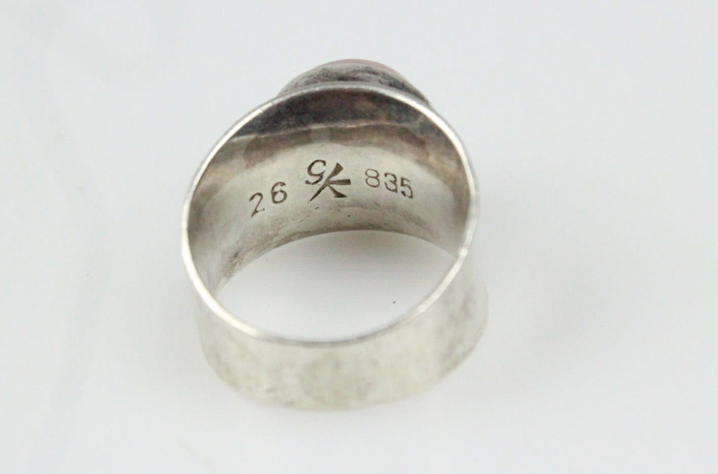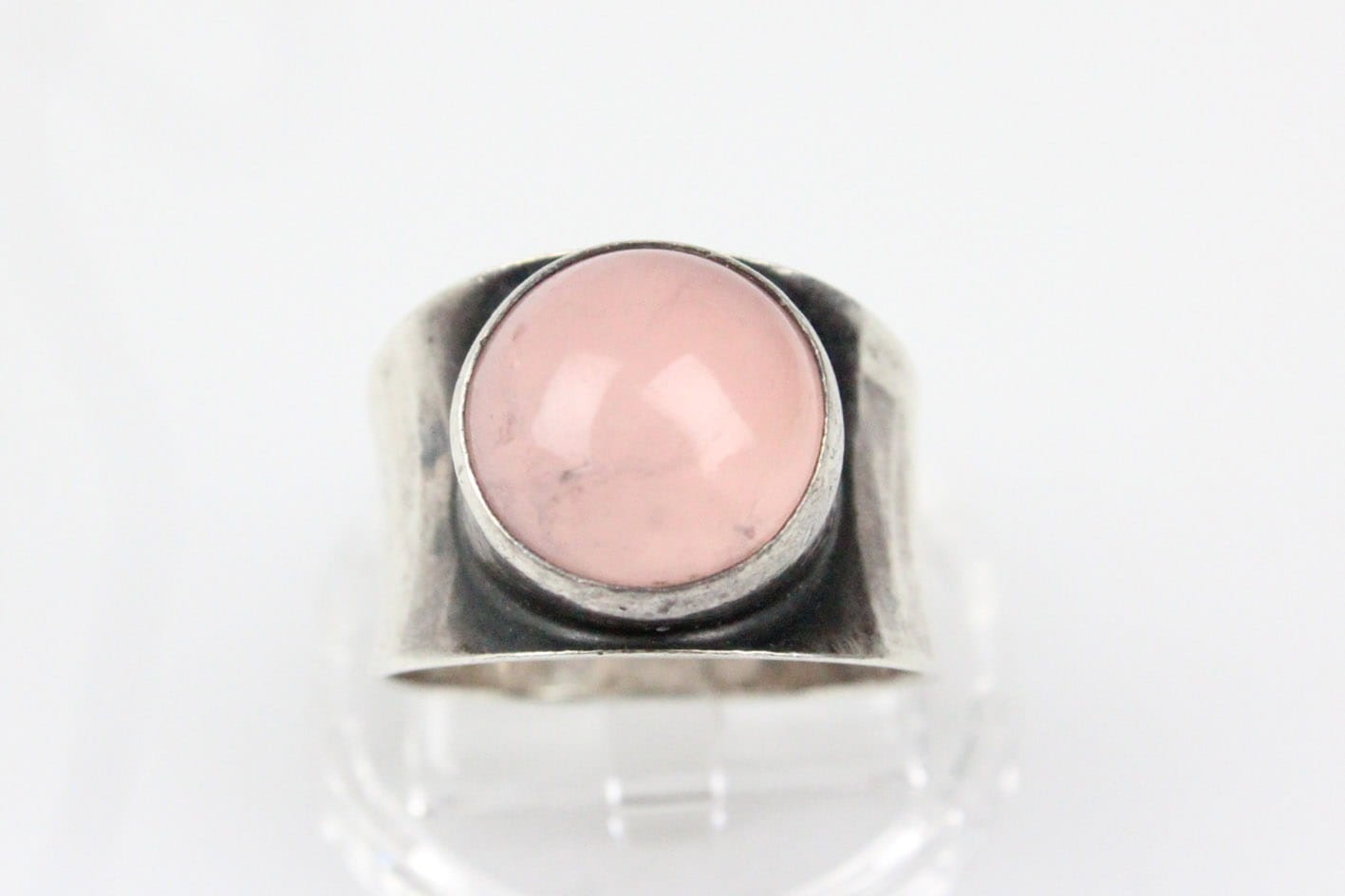 Autorski pierścionek z różowym kwarcem pochodzący z lat 50/60-tych XX wieku. Przedmiot wykonany z pracowni złotniczej Georga Kramera. Pierścionek wykonano w srebrze próby 835. Sygnatura od spodu: punca artysty, próbą i numerem modelu. Bardzo dobry stan zachowania z delikatną wiekową patynką. Wymiary: