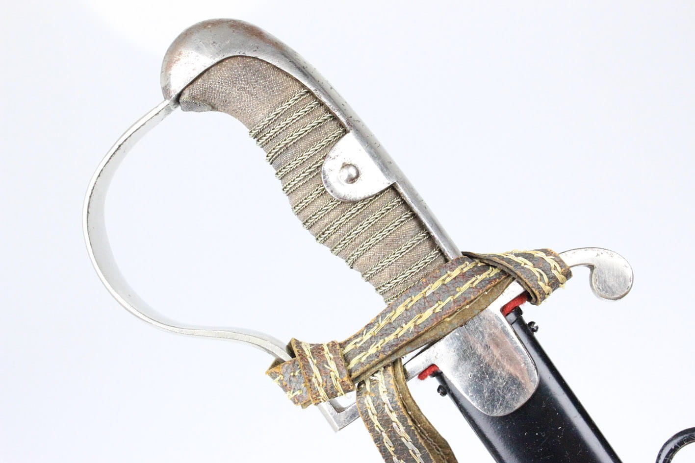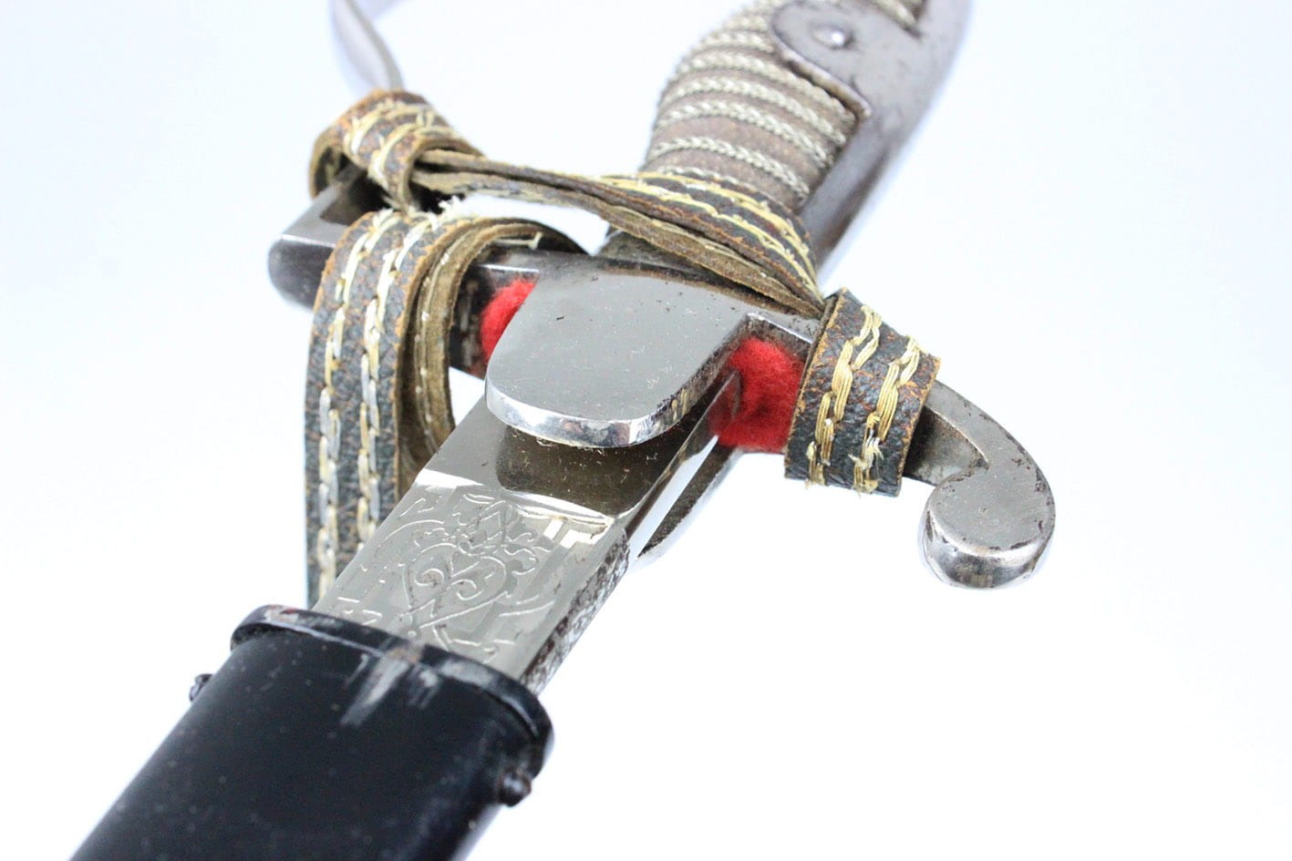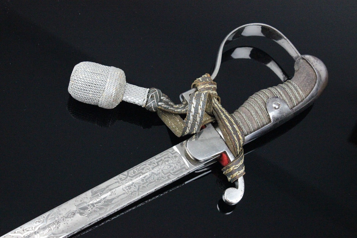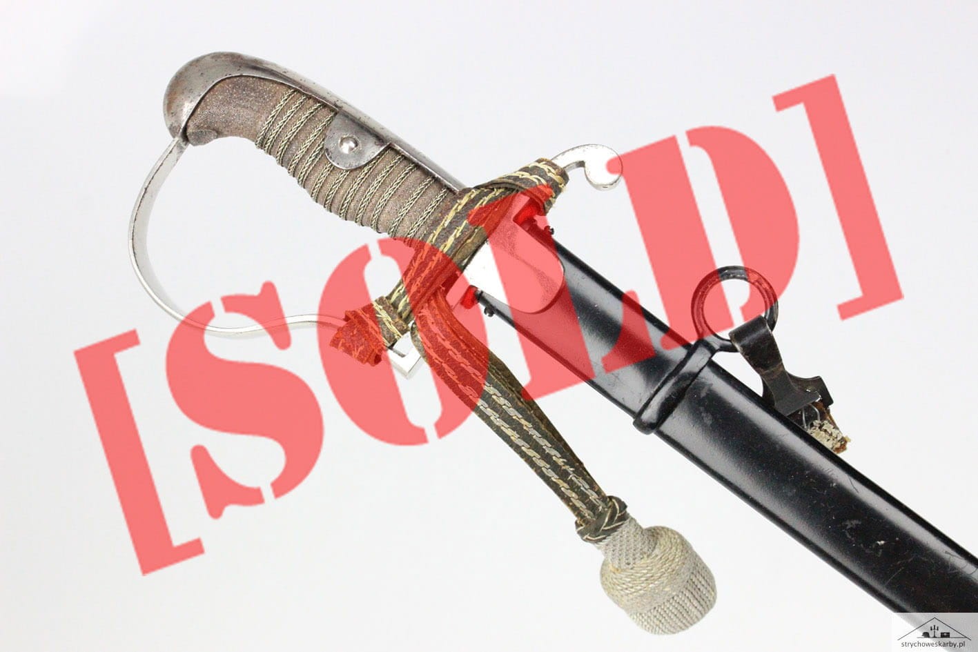 Szabla oficera 61 Pułku Artylerii Polowej ( 2 Wlk. Ks. Hesji )- (2. Großherzoglich Hessisches Feldartillerie-Regiment Nr.61). Głownia stalowa, niklowana, jednosieczna z bruzdą na przygrzbieciu na obu płazach zakończona długim, obusiecznym piórem z centrycznym spiczastym sztychem. U nasady wewnętrznego płazu wybita cecha firmy: Weyersberg Kirschbaum & Cie. Firma ta powstała w 1883 roku z połączenia dwóch bardzo starych wytwórni z Solingen. Obie firmy miały własny znak towarowy. Dla Weyersbergu była to głowa króla, a dla Kirschbauma-głowa rycerza. Zastawa zdobiona jest trawioną, bogatą dekoracją i umieszczonego w kartuszu skrótu nazwy jednostki alfabetem gotyckim. Strona wewnętrza również trawiona i bogato zdobiona armatami. Oprawa rękojeści zamknięta, stalowa, niklowana. Jelec krzyżowo- kabłakowy. Wąsy płaskie, szerokie zaokrąglone u dołu. Trzon rękojeści drewniany, karbowany, pokryty szarym jaszczurem i opleciony skręconym drutem. Pochwa z blachy stalowej lakierowana na czarno. Jedna ryfka z ruchomym kółkiem. Dławik mocny. Na rękojeści opleciony oryginalny temblak. Dokładnie to co na zdjęciach.