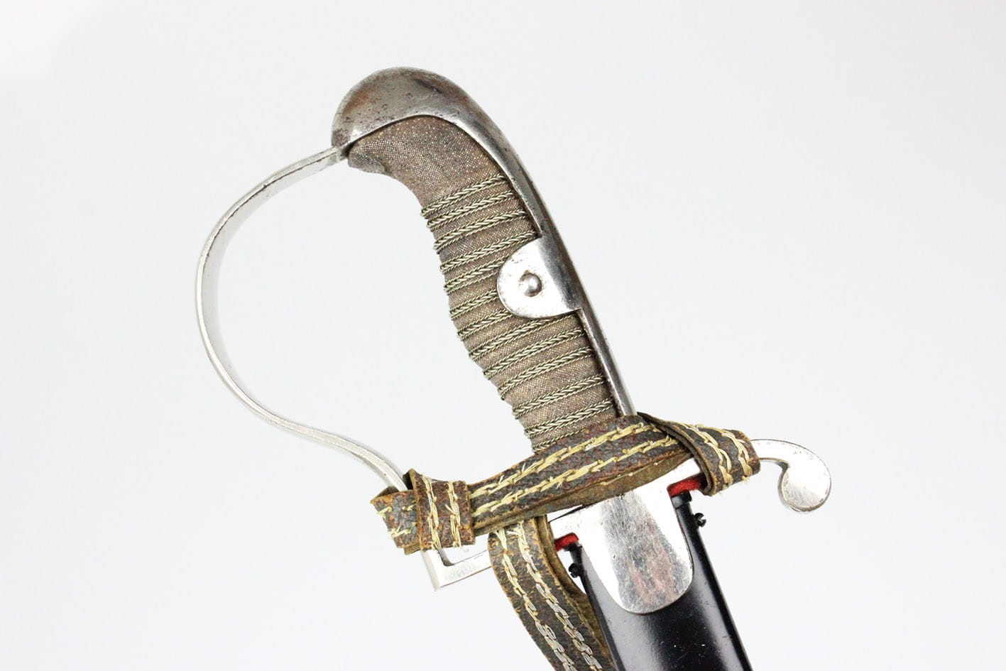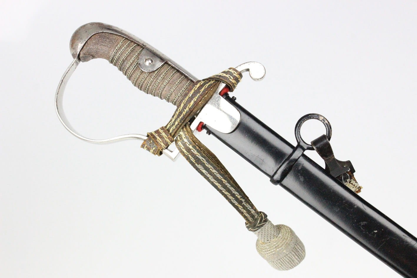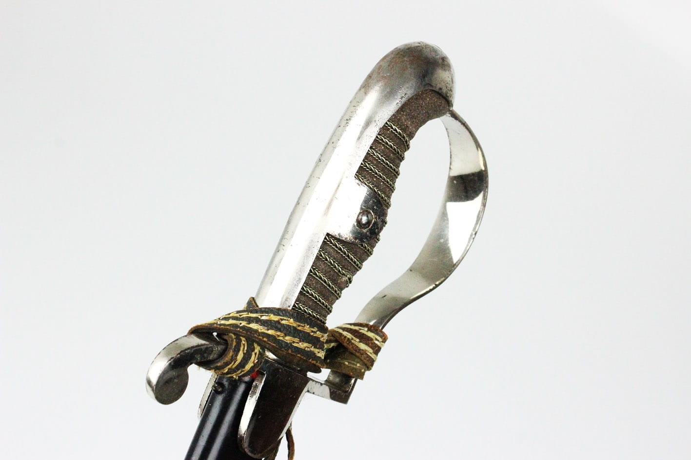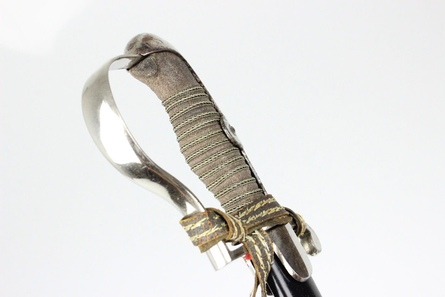 Szabla oficera 61 Pułku Artylerii Polowej ( 2 Wlk. Ks. Hesji )- (2. Großherzoglich Hessisches Feldartillerie-Regiment Nr.61). Głownia stalowa, niklowana, jednosieczna z bruzdą na przygrzbieciu na obu płazach zakończona długim, obusiecznym piórem z centrycznym spiczastym sztychem. U nasady wewnętrznego płazu wybita cecha firmy: Weyersberg Kirschbaum & Cie. Firma ta powstała w 1883 roku z połączenia dwóch bardzo starych wytwórni z Solingen. Obie firmy miały własny znak towarowy. Dla Weyersbergu była to głowa króla, a dla Kirschbauma-głowa rycerza. Zastawa zdobiona jest trawioną, bogatą dekoracją i umieszczonego w kartuszu skrótu nazwy jednostki alfabetem gotyckim. Strona wewnętrza również trawiona i bogato zdobiona armatami. Oprawa rękojeści zamknięta, stalowa, niklowana. Jelec krzyżowo- kabłakowy. Wąsy płaskie, szerokie zaokrąglone u dołu. Trzon rękojeści drewniany, karbowany, pokryty szarym jaszczurem i opleciony skręconym drutem. Pochwa z blachy stalowej lakierowana na czarno. Jedna ryfka z ruchomym kółkiem. Dławik mocny. Na rękojeści opleciony oryginalny temblak. Dokładnie to co na zdjęciach.