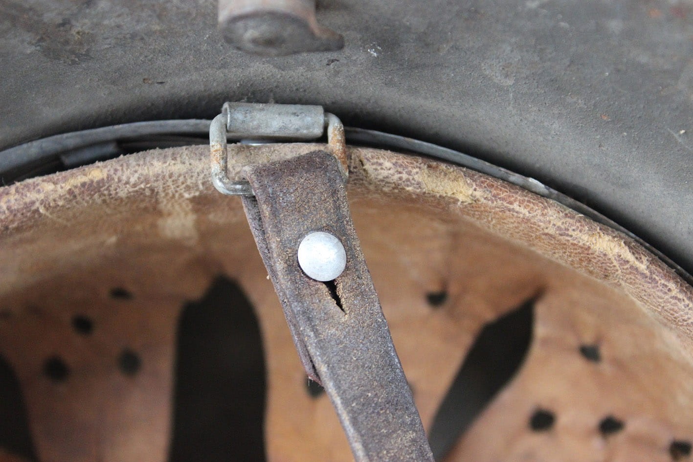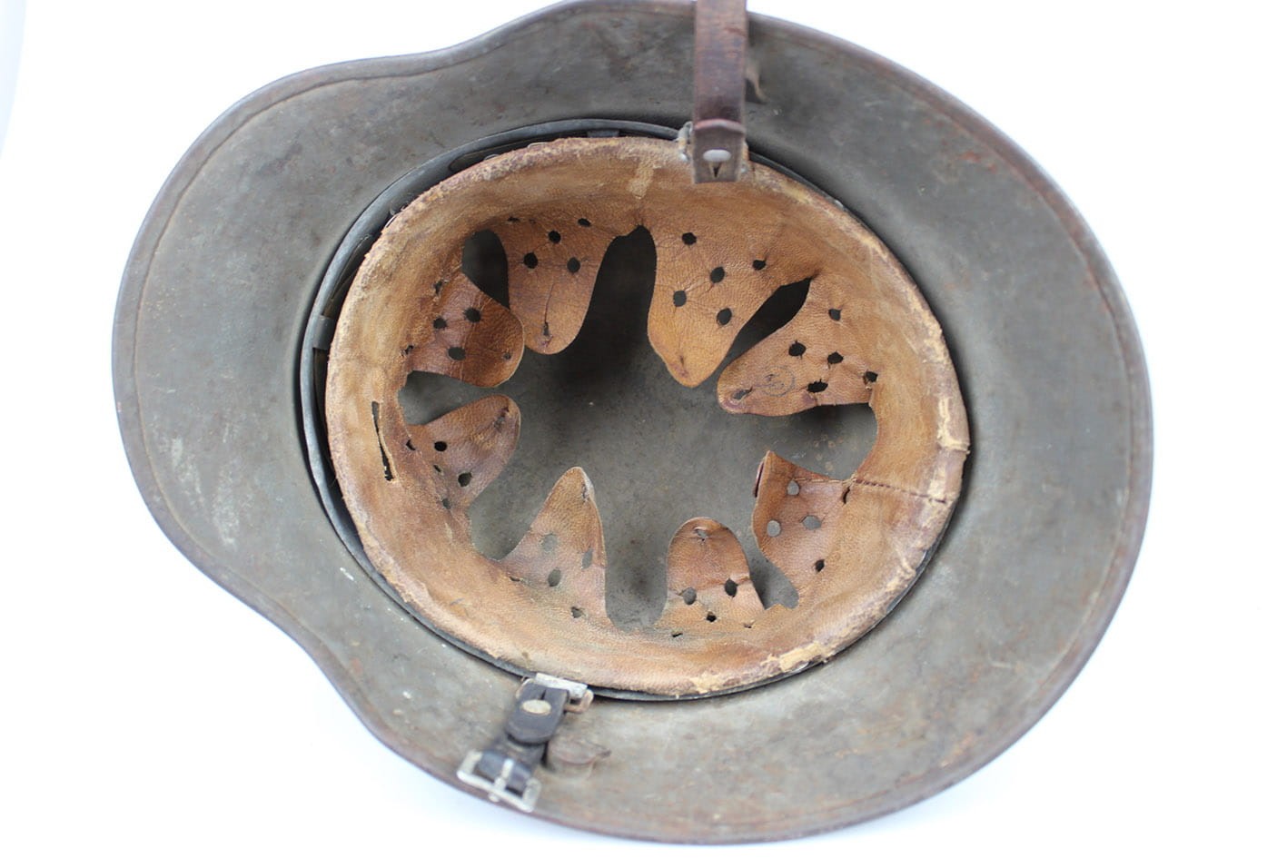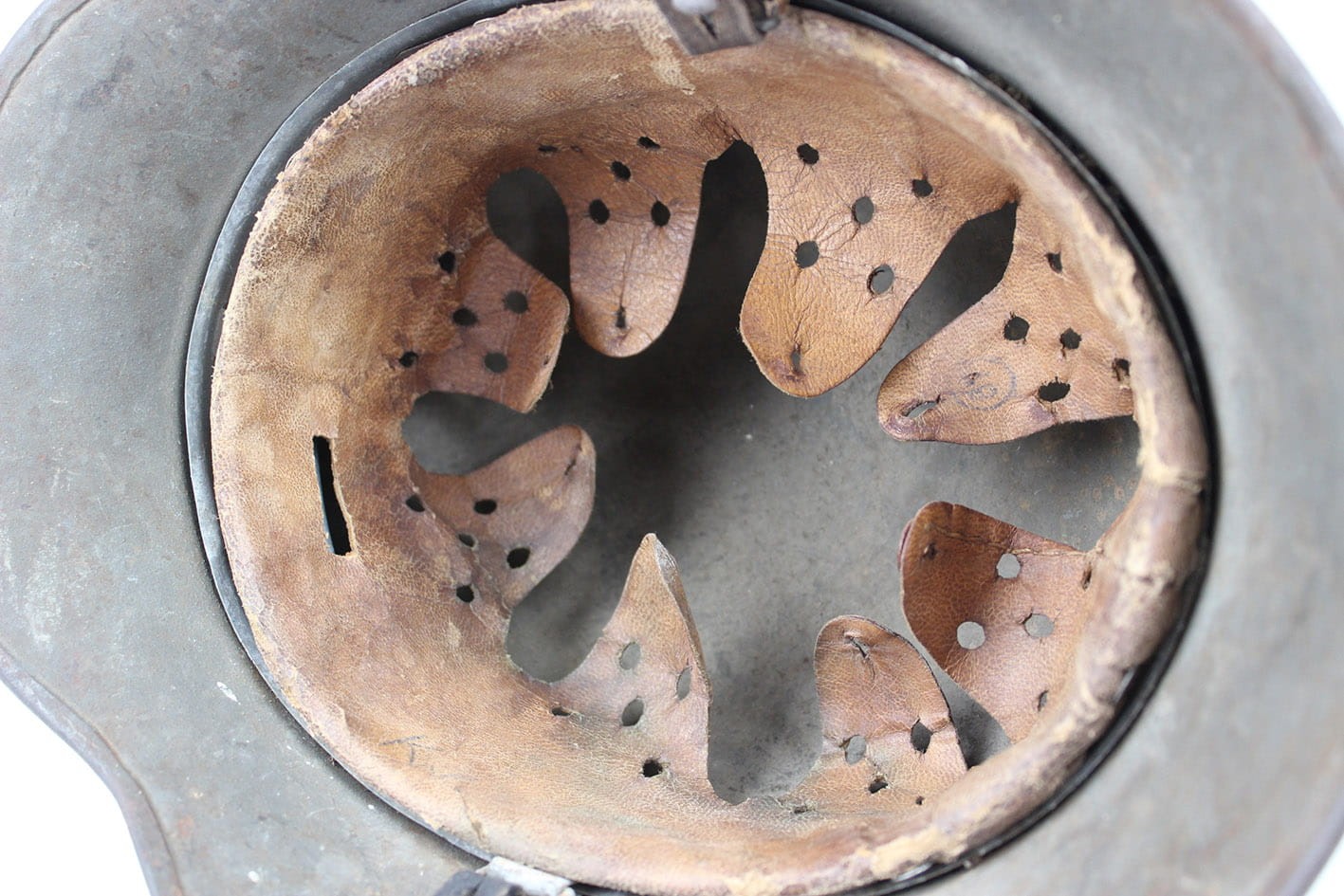 Oryginalny hełm niemiecki wz.1916 znany wśród kolekcjonerów jako " transitional" czyli hełm przejściowy. Egzemplarz "dozbrajany" około 1940/41 roku, malowany grubą warstwą matowej farby z fakturą pod którą miejscami widać oryginalną farbę z okresu I wojny światowej. Hełm z pojedynczą kalkomanią Wehrmachtu w stylu ET. We wnętrzu fasunek na ocynkowanej obręczy w rozmiarze 62. Skóra stosunkowo miękka i kompletna ( jedynie z małym ubytkiem w części czołowej). Pasek podbródkowy z aluminiową klamerką i aluminiowymi nitami. Długi pasek kompletny, nie skracany, sygnowany ....BERLIN 1938. Sygnatura producenta na skorupie hełmu nieczytelna, przykryta grubą warstwą farby. Rozmiar mierzony po nitach.