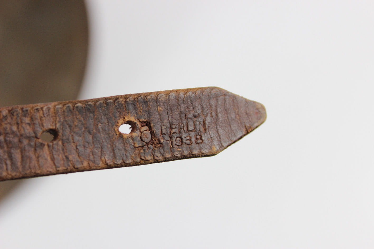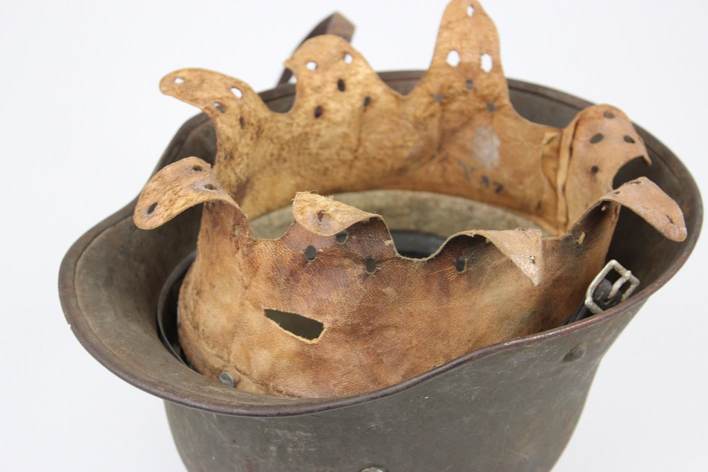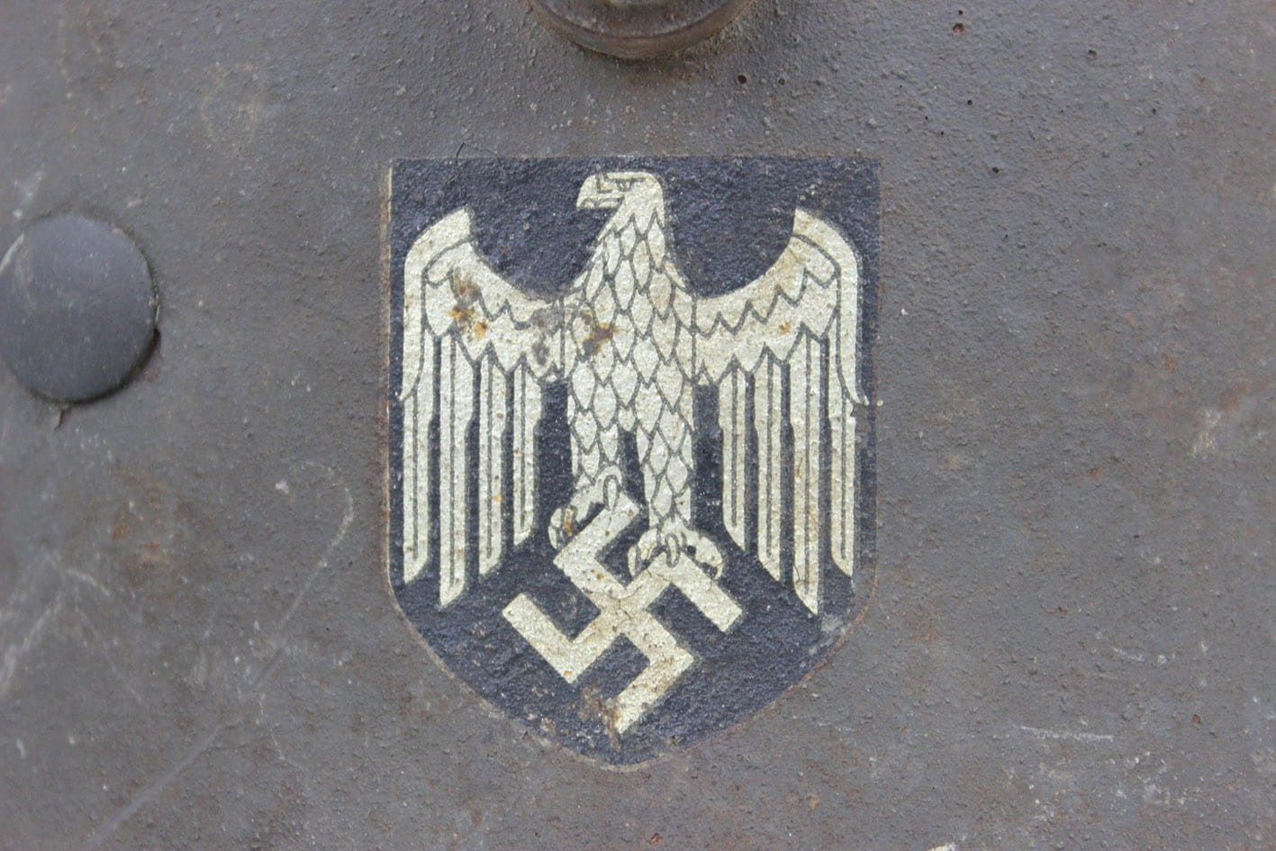 Oryginalny hełm niemiecki wz.1916 znany wśród kolekcjonerów jako " transitional" czyli hełm przejściowy. Egzemplarz "dozbrajany" około 1940/41 roku, malowany grubą warstwą matowej farby z fakturą pod którą miejscami widać oryginalną farbę z okresu I wojny światowej. Hełm z pojedynczą kalkomanią Wehrmachtu w stylu ET. We wnętrzu fasunek na ocynkowanej obręczy w rozmiarze 62. Skóra stosunkowo miękka i kompletna ( jedynie z małym ubytkiem w części czołowej). Pasek podbródkowy z aluminiową klamerką i aluminiowymi nitami. Długi pasek kompletny, nie skracany, sygnowany ....BERLIN 1938. Sygnatura producenta na skorupie hełmu nieczytelna, przykryta grubą warstwą farby. Rozmiar mierzony po nitach.