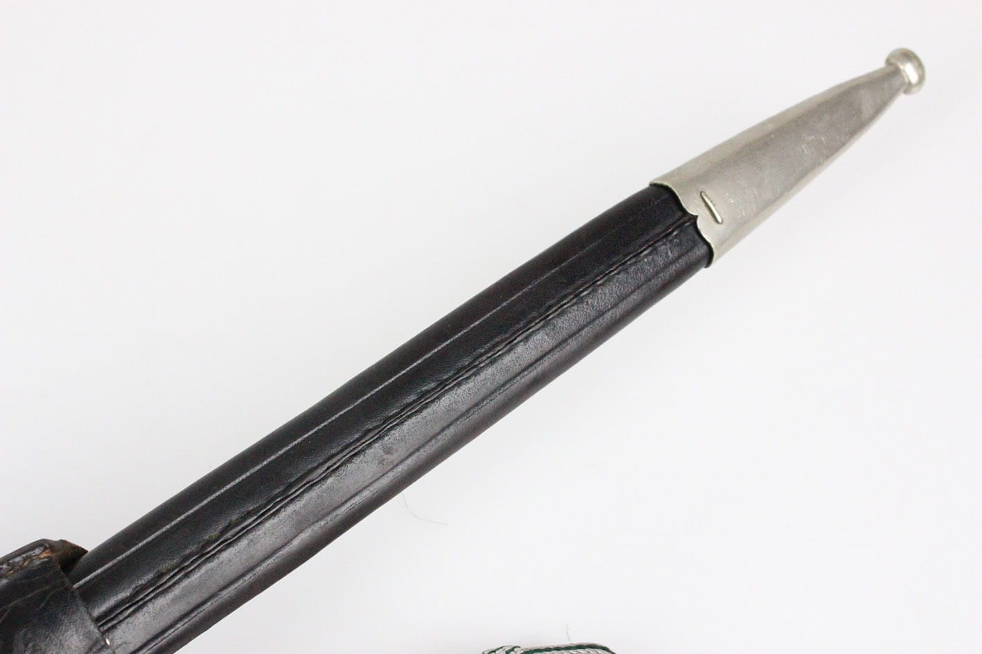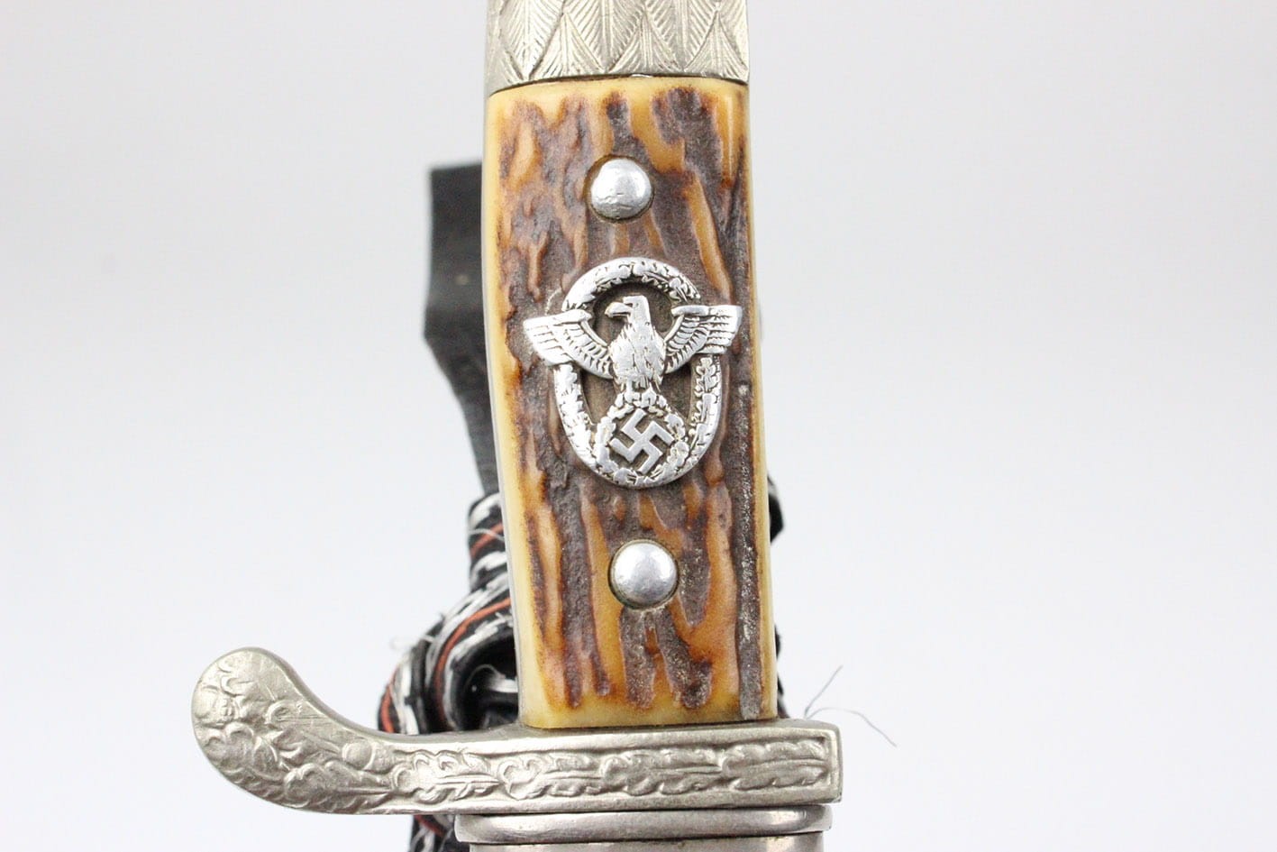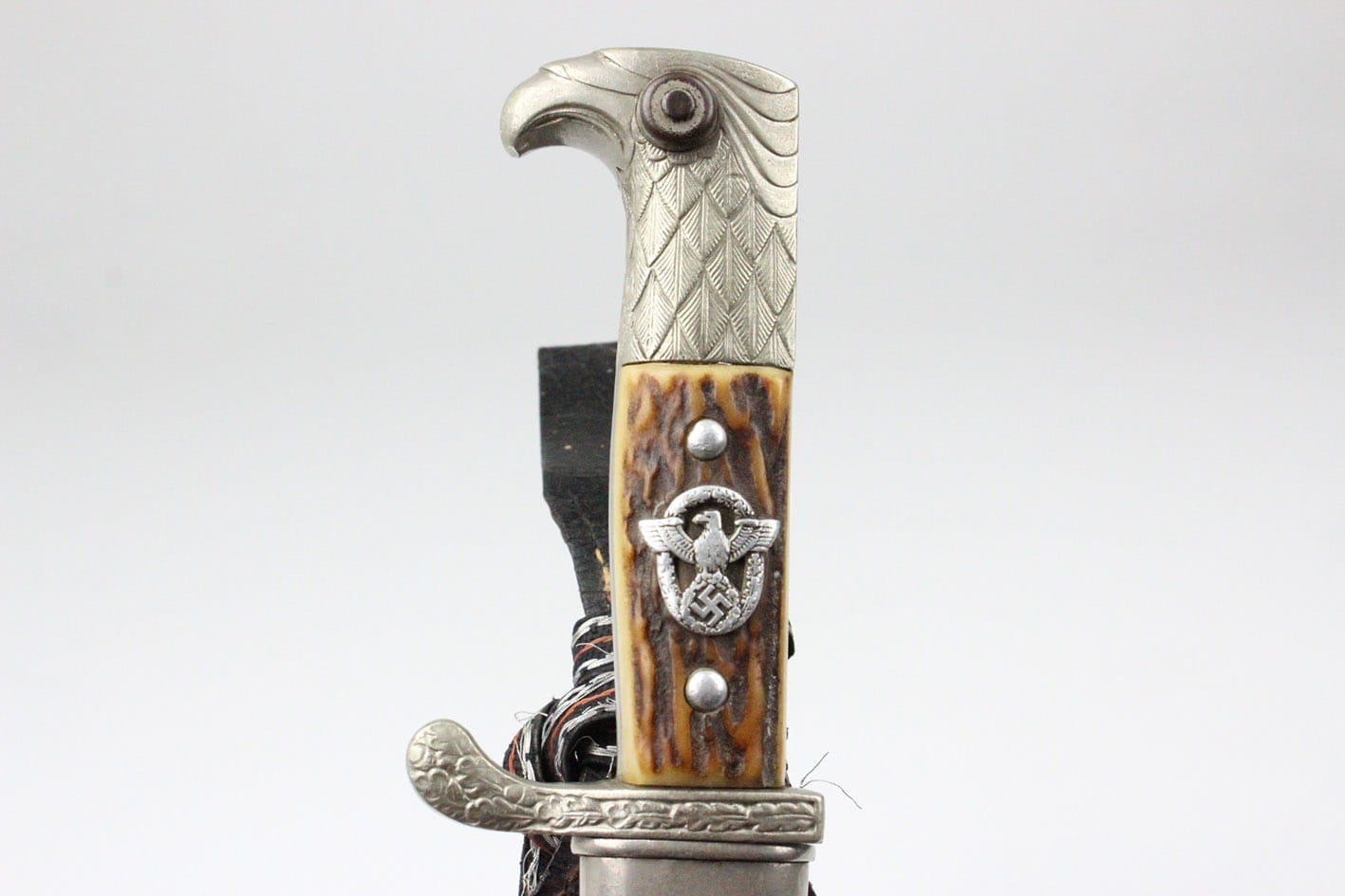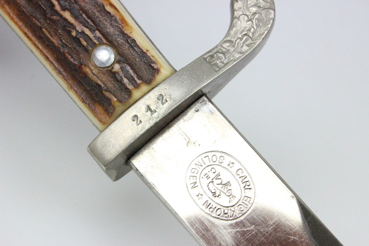 Pięknie zachowany niemiecki bagnet przeznaczony dla policji miejskiej z okresu III Rzeszy. Znany wśród kolekcjonerów jako " Cut-down police bayonet " lub jak kto woli "przycięty". Głowica z dobrze zaprojektowaną głową orła. W miejscu oka ruchomy sprawny przycisk zamka, umożliwiający założenie bagnetu na karabin k.98 i jego odmiany. Okładziny rękojeści wykonane z poroża jelenia i przymocowane za pomocą aluminiowych nitów. Na zewnętrznej okładzinie widoczny policyjny emblemat III Rzeszy, również wykonany w aluminium. Jelec jak i reszta głowicy wykonane w platerowanym mosiądzu. Jelec bogato zdobiony symboliką liści dębu. Na wewnętrznej stronie jelca widoczny numer 212- zgodny z numerem na pochwie. Głownia stalowa, niklowana, jednosieczna z obustronnym progiem i dwustronnym, wklęsłym zbroczem. Na wewnętrznym progu głowni dobrze widoczna sygnatura producenta CARL EICKHORN SOLINGEN z logiem wiewiórki. Pochwa skórzana, szwy mocne, okucia alpakowe. Na wewnętrznej stronie górnego okucia widoczne punce SD.VI.212 (Schutzpolizei Düsseldorf ). W komplecie oryginalna żabka i temblak.