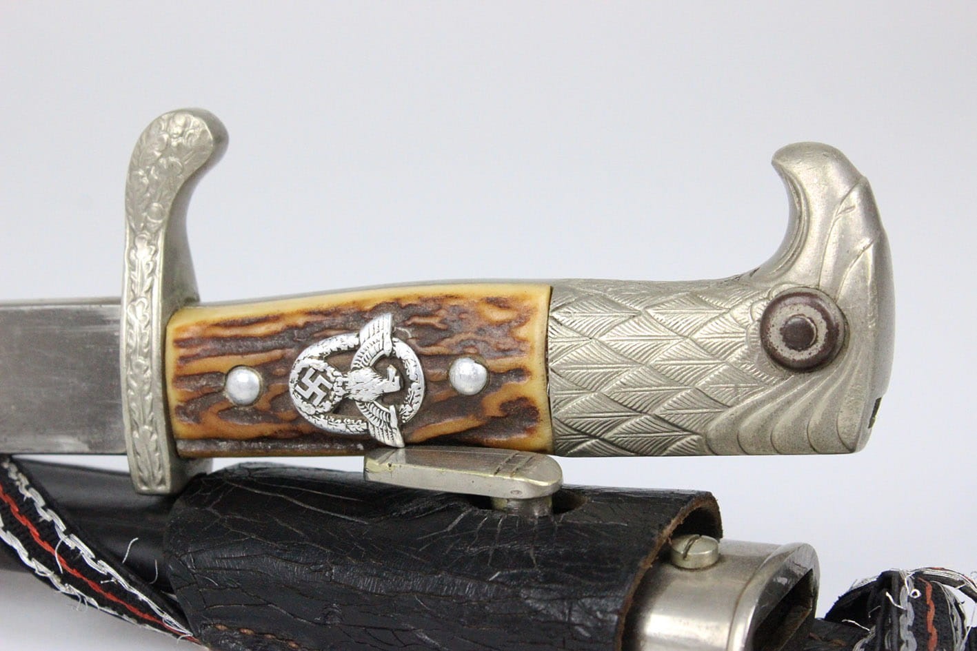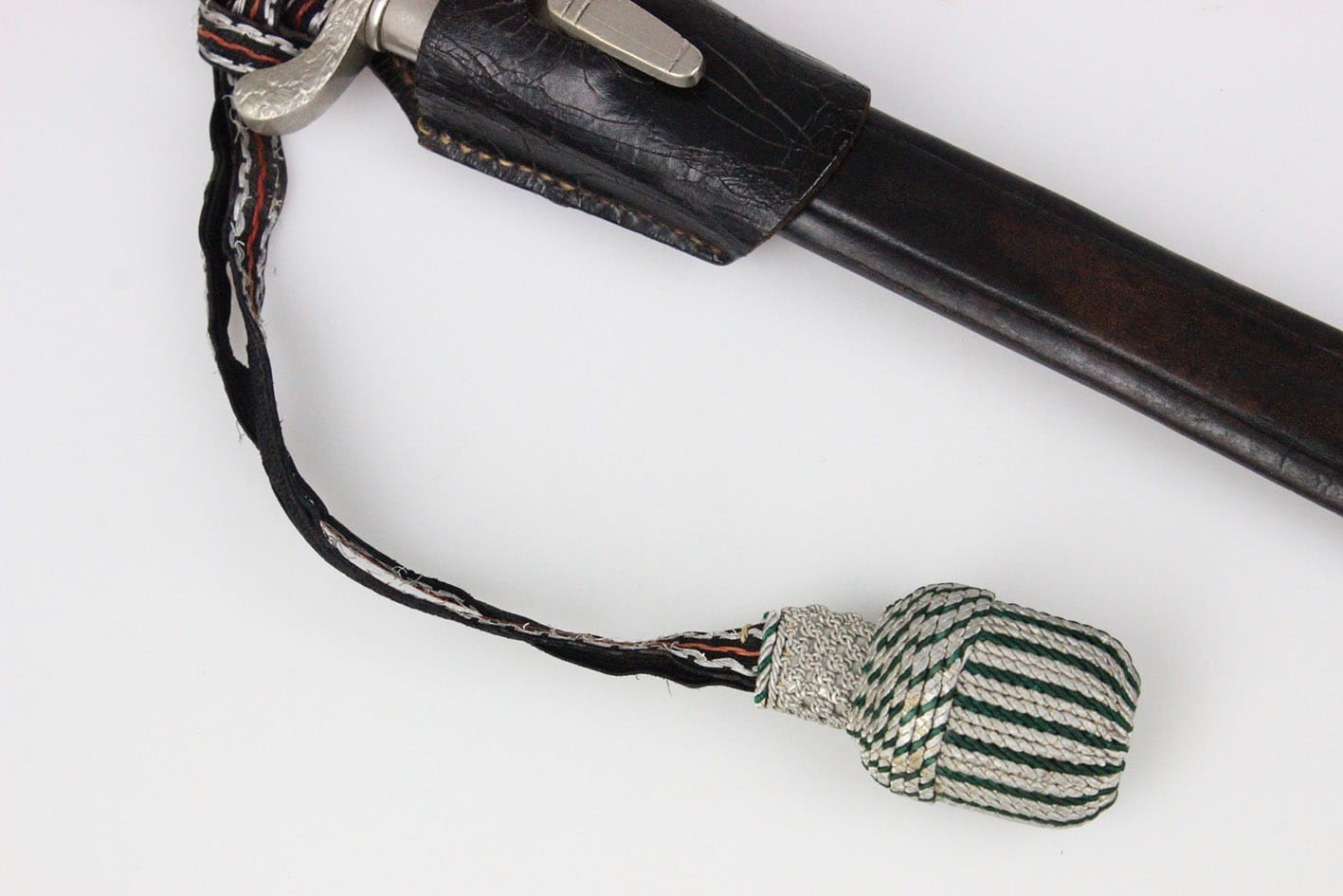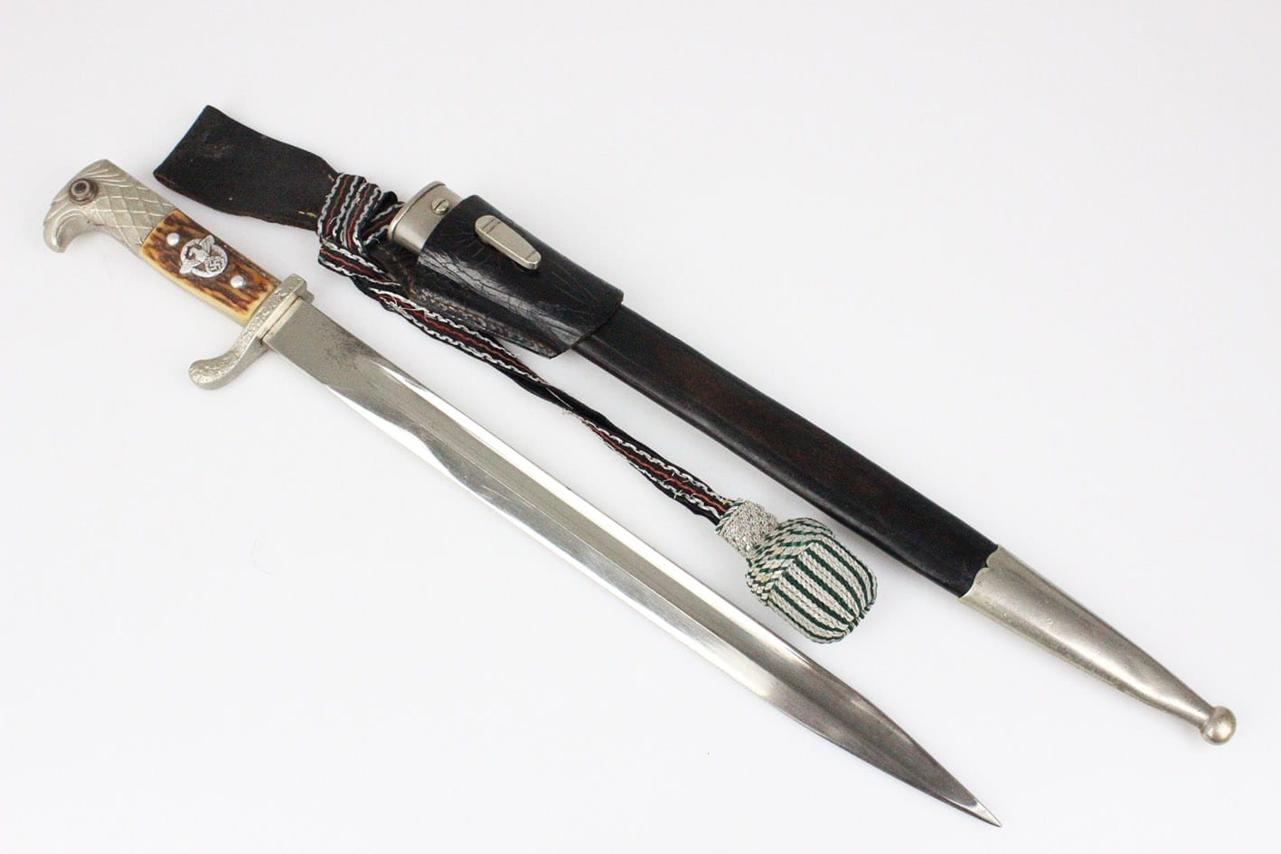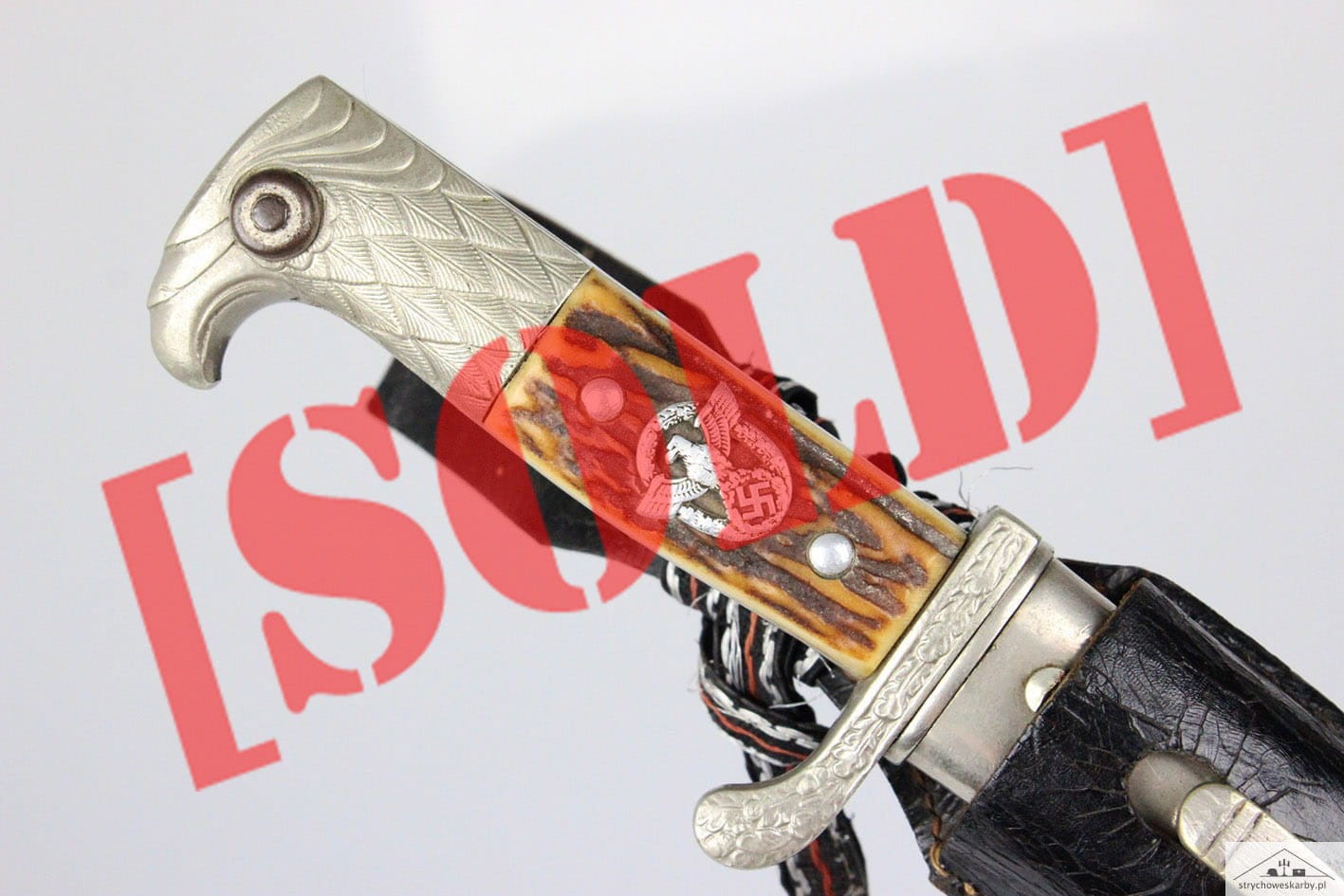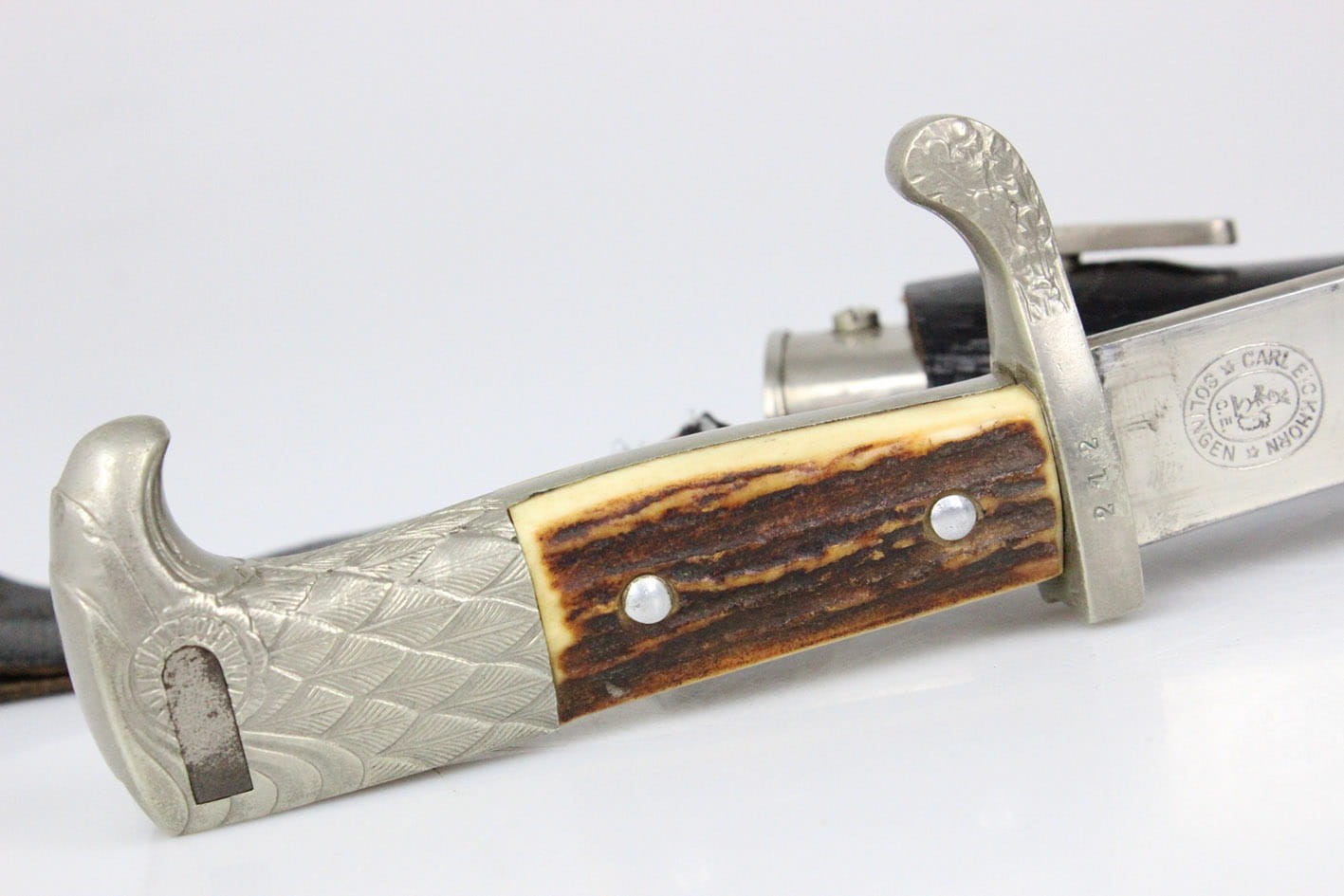 Pięknie zachowany niemiecki bagnet przeznaczony dla policji miejskiej z okresu III Rzeszy. Znany wśród kolekcjonerów jako " Cut-down police bayonet " lub jak kto woli "przycięty". Głowica z dobrze zaprojektowaną głową orła. W miejscu oka ruchomy sprawny przycisk zamka, umożliwiający założenie bagnetu na karabin k.98 i jego odmiany. Okładziny rękojeści wykonane z poroża jelenia i przymocowane za pomocą aluminiowych nitów. Na zewnętrznej okładzinie widoczny policyjny emblemat III Rzeszy, również wykonany w aluminium. Jelec jak i reszta głowicy wykonane w platerowanym mosiądzu. Jelec bogato zdobiony symboliką liści dębu. Na wewnętrznej stronie jelca widoczny numer 212- zgodny z numerem na pochwie. Głownia stalowa, niklowana, jednosieczna z obustronnym progiem i dwustronnym, wklęsłym zbroczem. Na wewnętrznym progu głowni dobrze widoczna sygnatura producenta CARL EICKHORN SOLINGEN z logiem wiewiórki. Pochwa skórzana, szwy mocne, okucia alpakowe. Na wewnętrznej stronie górnego okucia widoczne punce SD.VI.212 (Schutzpolizei Düsseldorf ). W komplecie oryginalna żabka i temblak.
