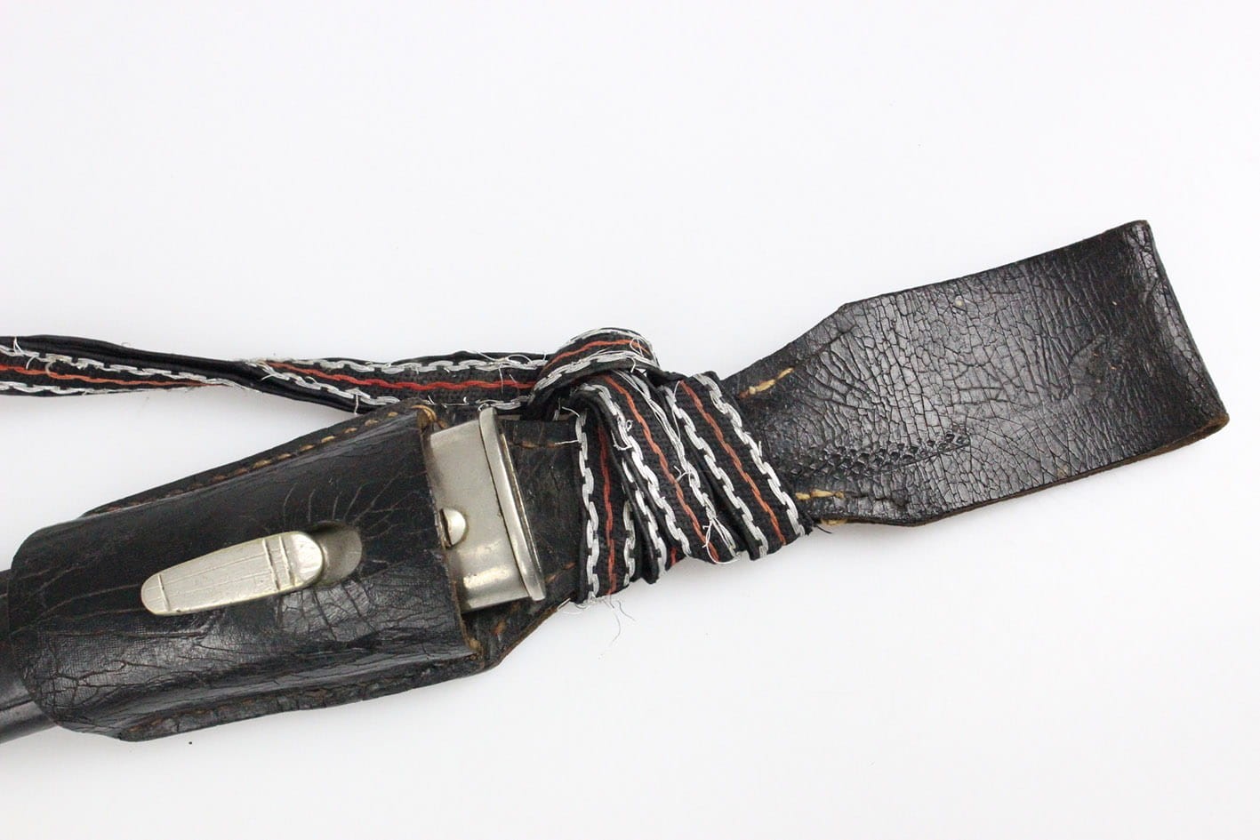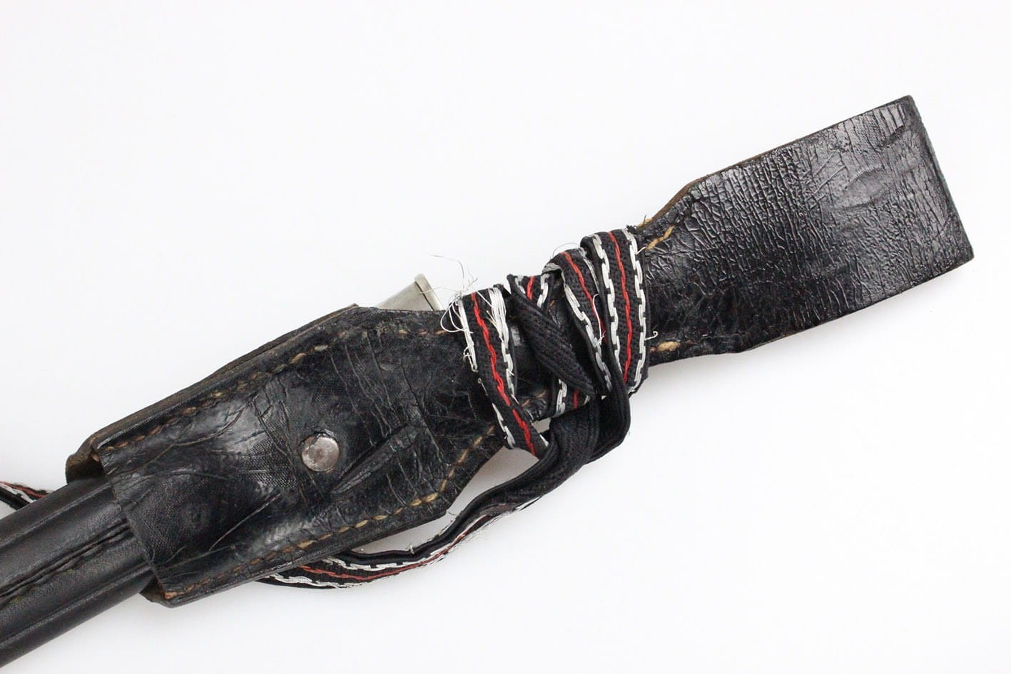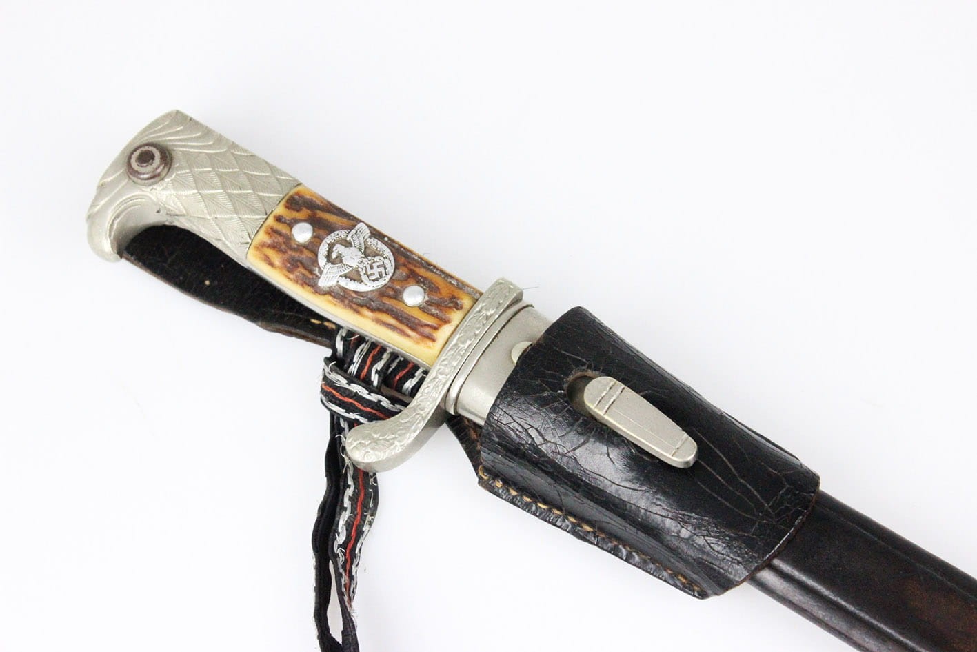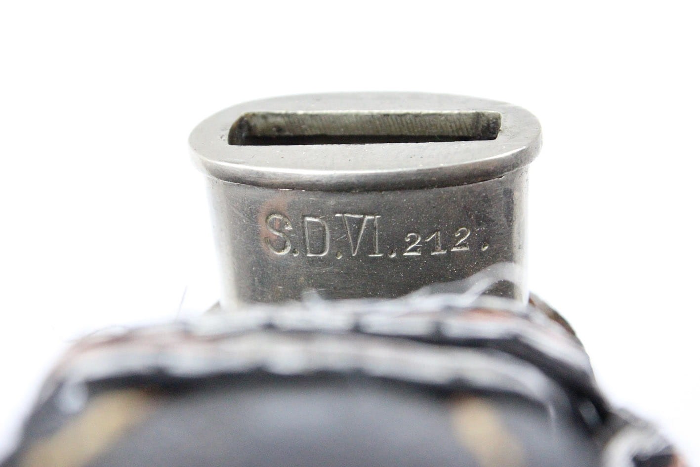 Pięknie zachowany niemiecki bagnet przeznaczony dla policji miejskiej z okresu III Rzeszy. Znany wśród kolekcjonerów jako " Cut-down police bayonet " lub jak kto woli "przycięty". Głowica z dobrze zaprojektowaną głową orła. W miejscu oka ruchomy sprawny przycisk zamka, umożliwiający założenie bagnetu na karabin k.98 i jego odmiany. Okładziny rękojeści wykonane z poroża jelenia i przymocowane za pomocą aluminiowych nitów. Na zewnętrznej okładzinie widoczny policyjny emblemat III Rzeszy, również wykonany w aluminium. Jelec jak i reszta głowicy wykonane w platerowanym mosiądzu. Jelec bogato zdobiony symboliką liści dębu. Na wewnętrznej stronie jelca widoczny numer 212- zgodny z numerem na pochwie. Głownia stalowa, niklowana, jednosieczna z obustronnym progiem i dwustronnym, wklęsłym zbroczem. Na wewnętrznym progu głowni dobrze widoczna sygnatura producenta CARL EICKHORN SOLINGEN z logiem wiewiórki. Pochwa skórzana, szwy mocne, okucia alpakowe. Na wewnętrznej stronie górnego okucia widoczne punce SD.VI.212 (Schutzpolizei Düsseldorf ). W komplecie oryginalna żabka i temblak.