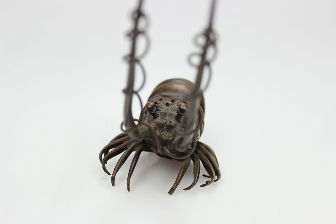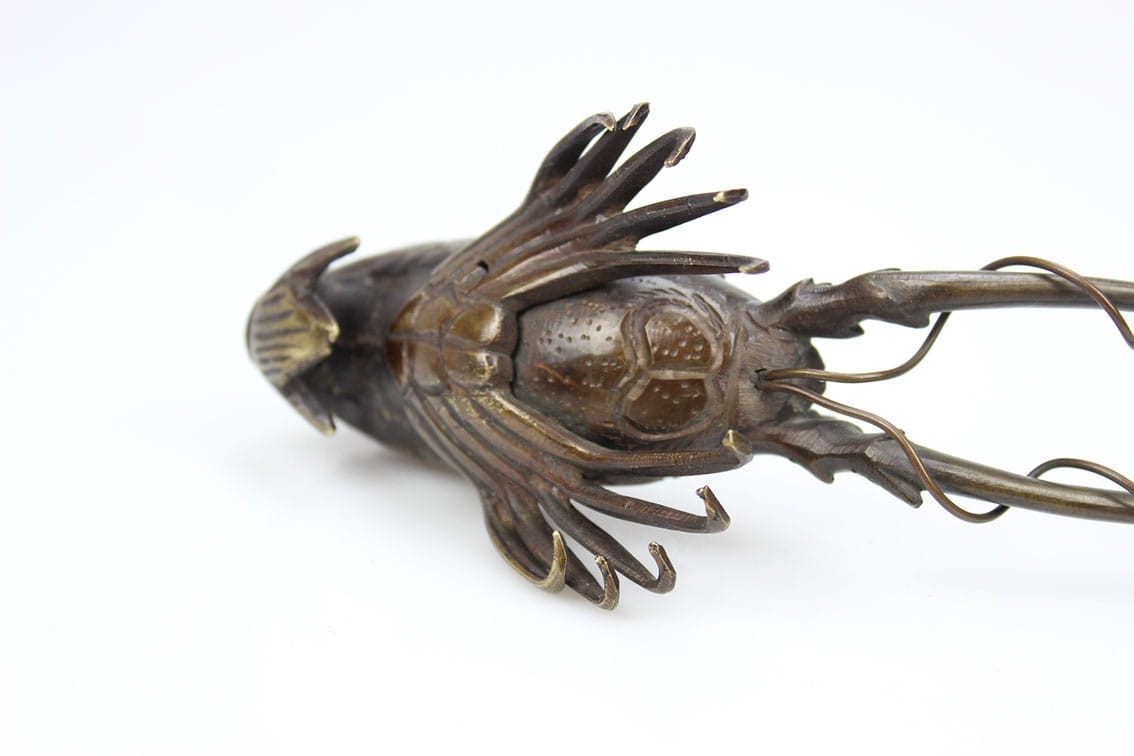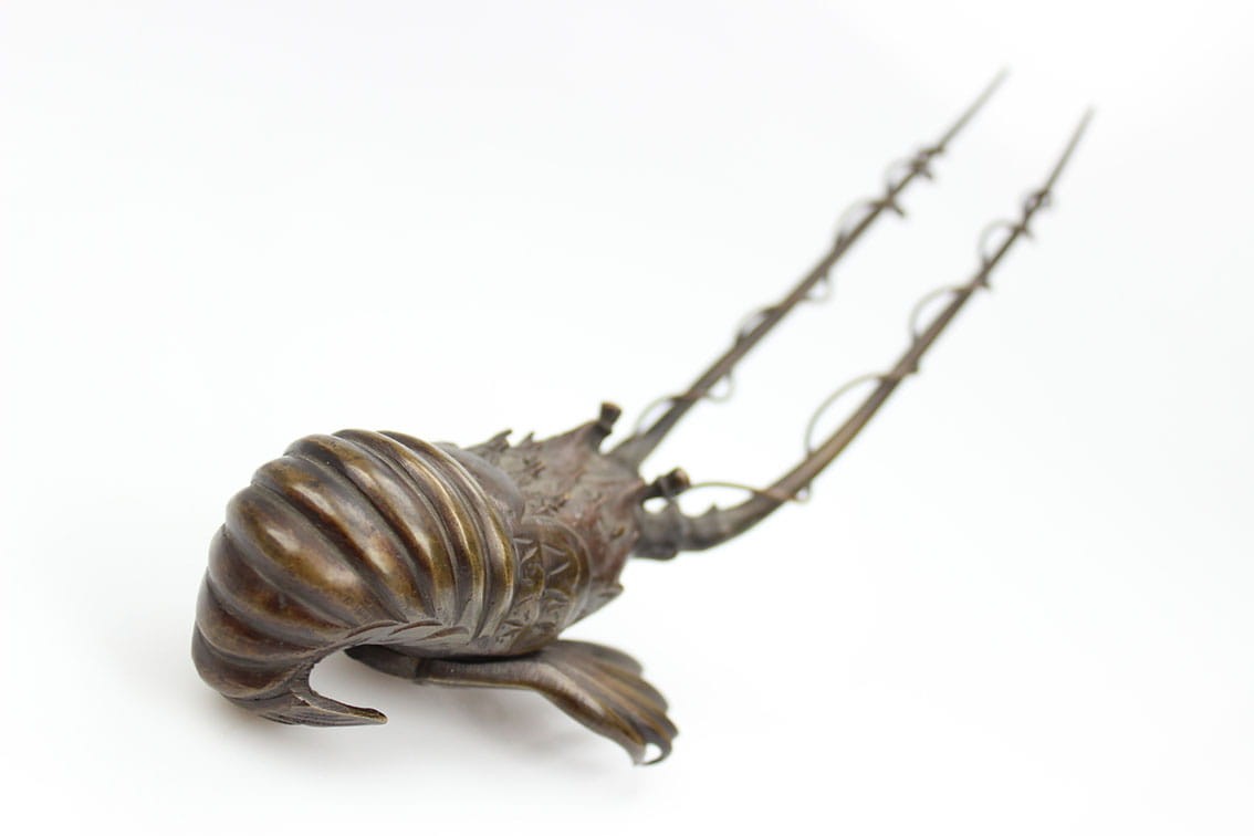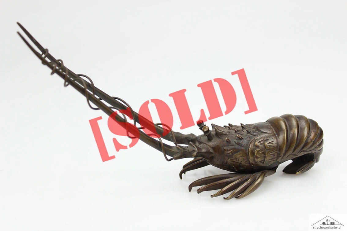 Skorupiak z rodziny homarowatych wykonany na przełomie XIX i XX wieku w Japonii. Konstrukcja w brązie. Rzeźba kompletna bez ubytków. Wymiary: