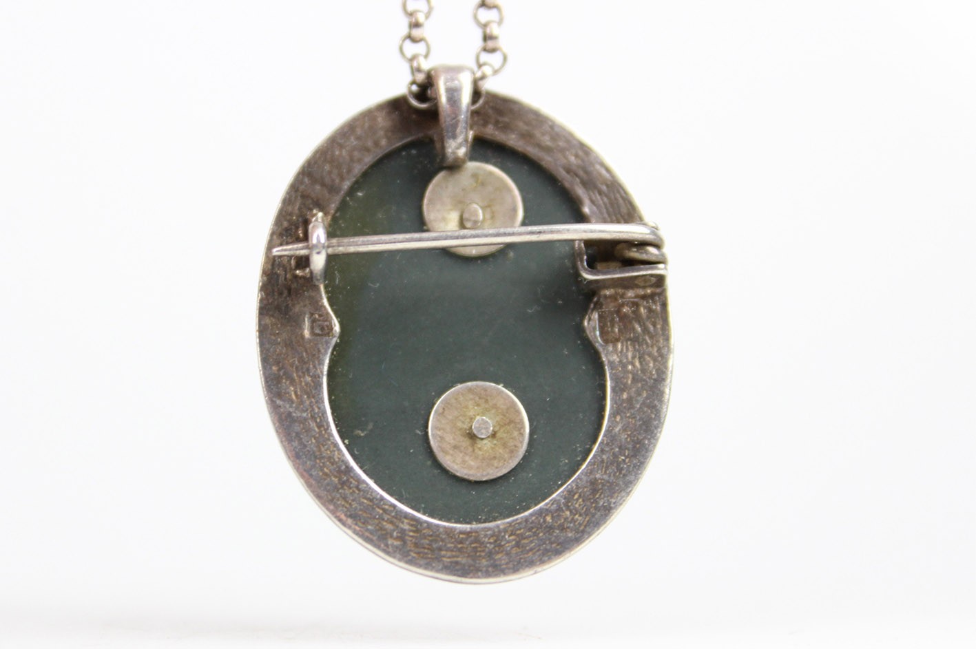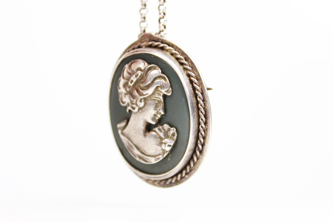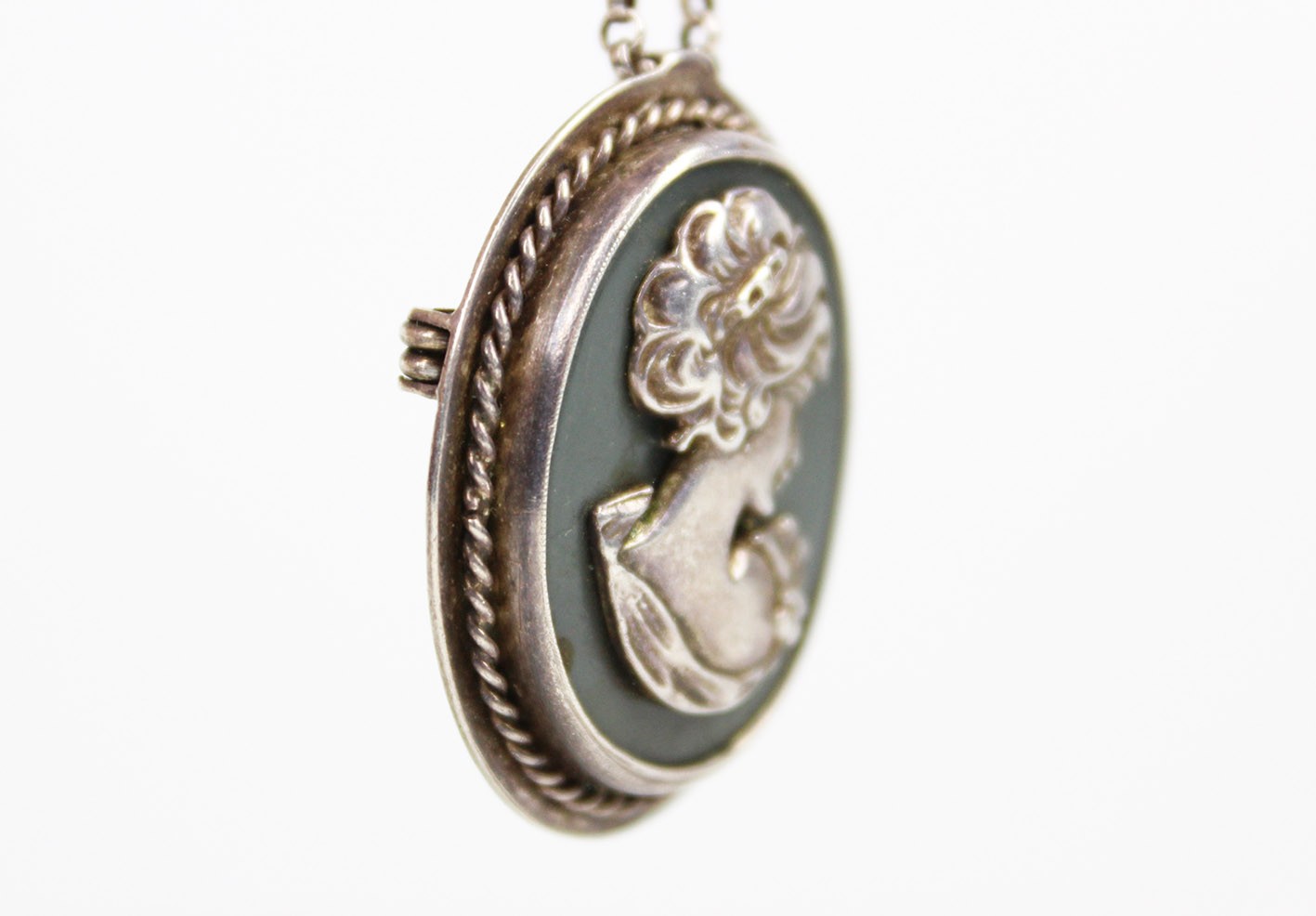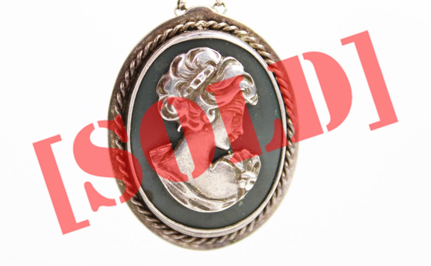 Kamea w formie broszki z funkcją zawieszki wykonana po 1986 roku wykonana w Zakładzie Wyrobów z Metali Szlachetnych AGAT w Kłodzku . Owalny element kamienny stanowi ciemnozielone podłoże z nefrytu, na którym osadzono srebrny, plastyczny relief przedstawiający profil kobiety w ujęciu bocznym. Kompozycja utrzymana jest w eleganckim, ponadczasowym duchu – kontrast chłodnego srebra z głęboką zielenią kamienia daje efekt bardzo „jubilerski”, wyraźnie nawiązujący do tradycji kamei i medalionów portretowych. Całość oprawiona w srebrną ramę z dekoracyjnym, skręcanym warkoczem dookoła, co dodatkowo podkreśla klasyczny charakter wyrobu. Zapięcie na szpilę pozwala nosić ją jako broszkę, a obecność uszka umożliwia wykorzystanie także jako zawieszki na łańcuszku – to praktyczne rozwiązanie, które w codziennym użytkowaniu daje dużą swobodę stylizacji. Wyrób sygnowany puncą wytwórni oraz próbą srebra z probiernią wrocławską. Wymiary:
