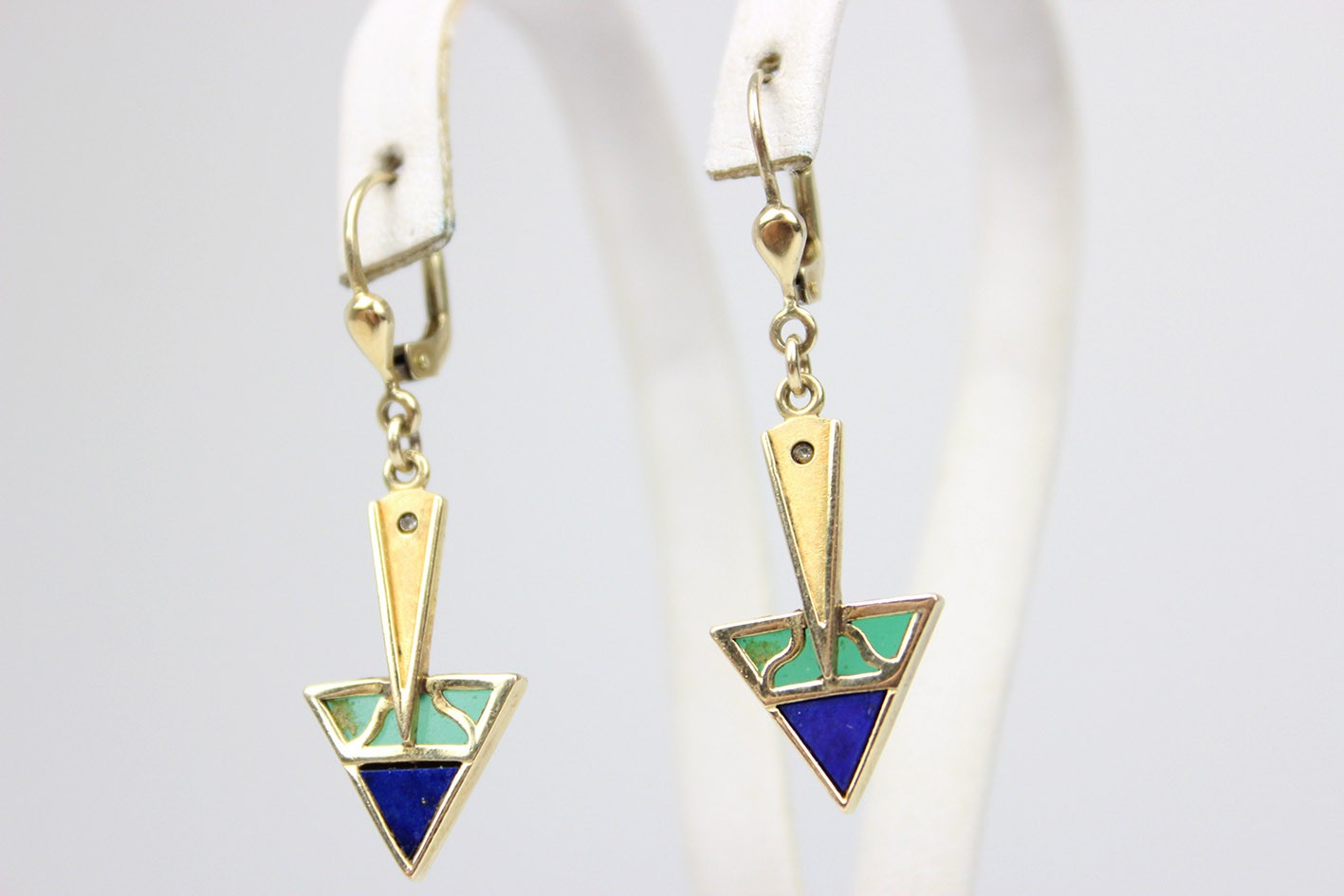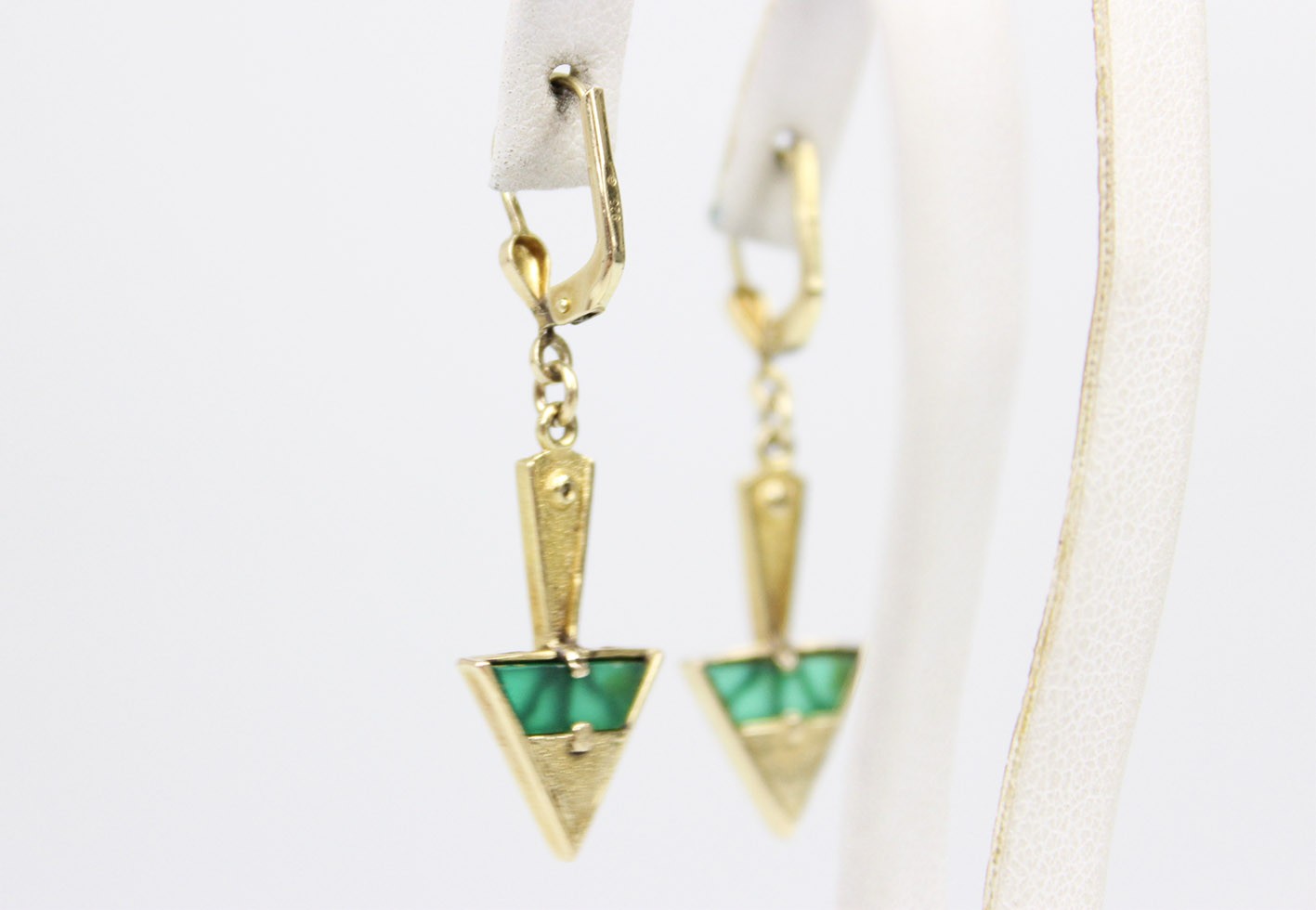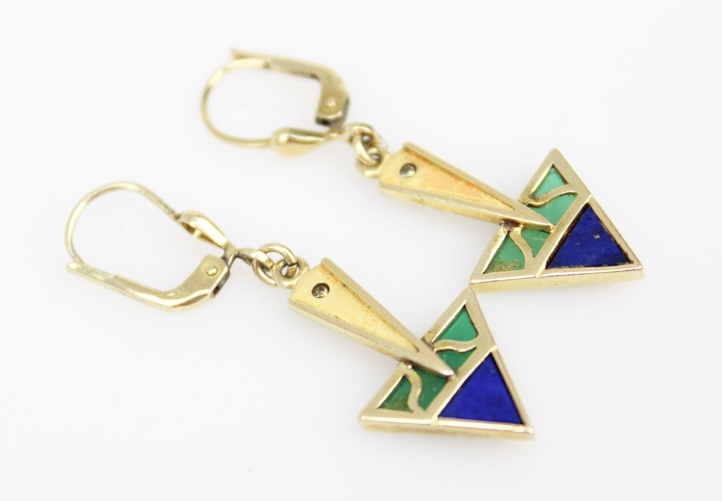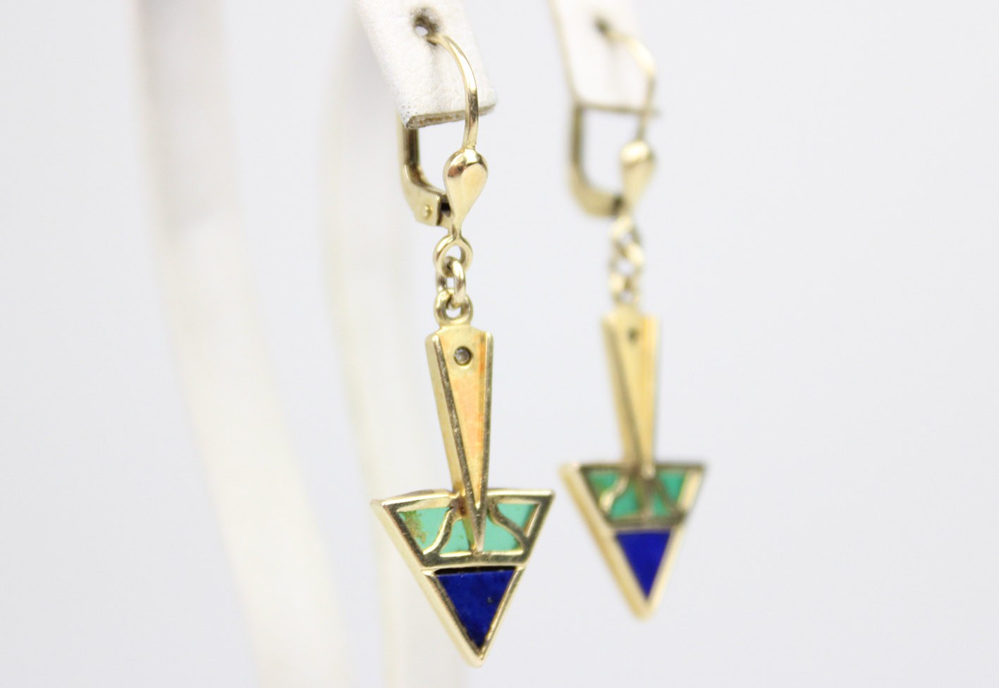 Efektowne kolczyki utrzymane w stylistyce Art Deco, wykonane w złoconym srebrze. Forma biżuterii opiera się na charakterystycznej dla okresu międzywojennego kompozycji geometrycznej – wyraźnych, ostrych trójkątach oraz smukłych, wydłużonych elementach, które nadają całości elegancką, niemal architektoniczną linię. Część dekoracyjna kolczyków zbudowana została z trójkątnego motywu zdobionego naturalnym lapisem lazuli o głębokiej, intensywnie kobaltowej barwie. Kamień pięknie kontrastuje z jasnym, półtransparentnym zielonym szkłem, które wypełnia górną część kompozycji, tworząc charakterystyczny dla biżuterii Art Deco zestaw kolorystyczny. Szklane elementy przepuszczają światło, dzięki czemu w zależności od jego natężenia i kąta padania ujawniają subtelne przejścia tonów i delikatną głębię barwy. Całość osadzona została w starannie wykonanej oprawie ze złoconego srebra o gładko polerowanych powierzchniach. W górnej części kompozycji umieszczono drobny kryształek, który stanowi subtelny akcent świetlny i dodatkowo podkreśla dekoracyjny charakter kolczyków. Kolczyki zawieszone są na klasycznych biglach. Stan zachowania bardzo dobry – konstrukcja stabilna, kamienie oraz elementy szklane dobrze zachowane, bigle sprawne. Wymiary: