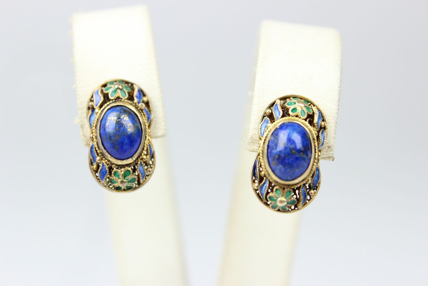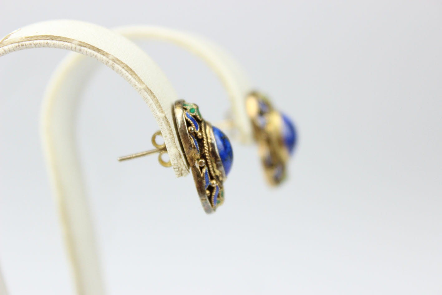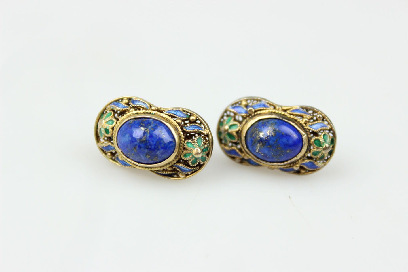 Kolorowe chińskie kolczyki z lat 50/60 XX wieku. Konstrukcja filigranowa w złoconym srebrze próby 925, zdobiona emalią. Kolczyki kameryzowane lapisem lazuli w szlifie kaboszonowym. Zapięcie typu sztyft. Bardzo dobry stan zachowania, bez przetarć z kompletną emalią. Wymiary: