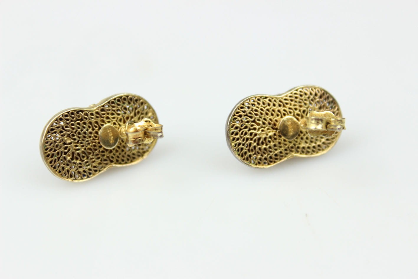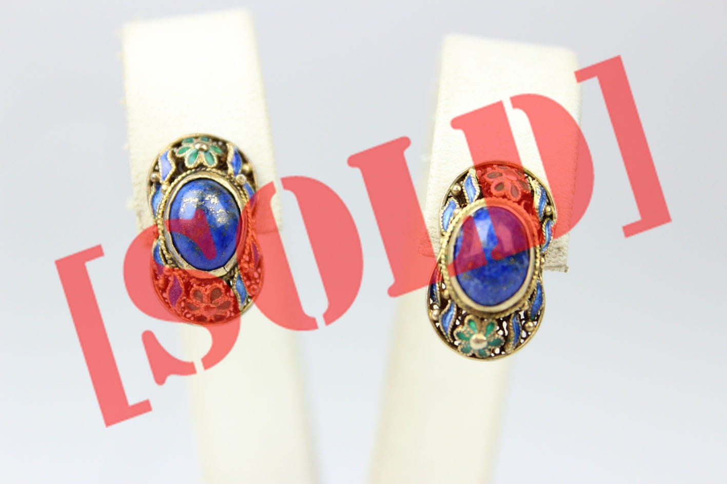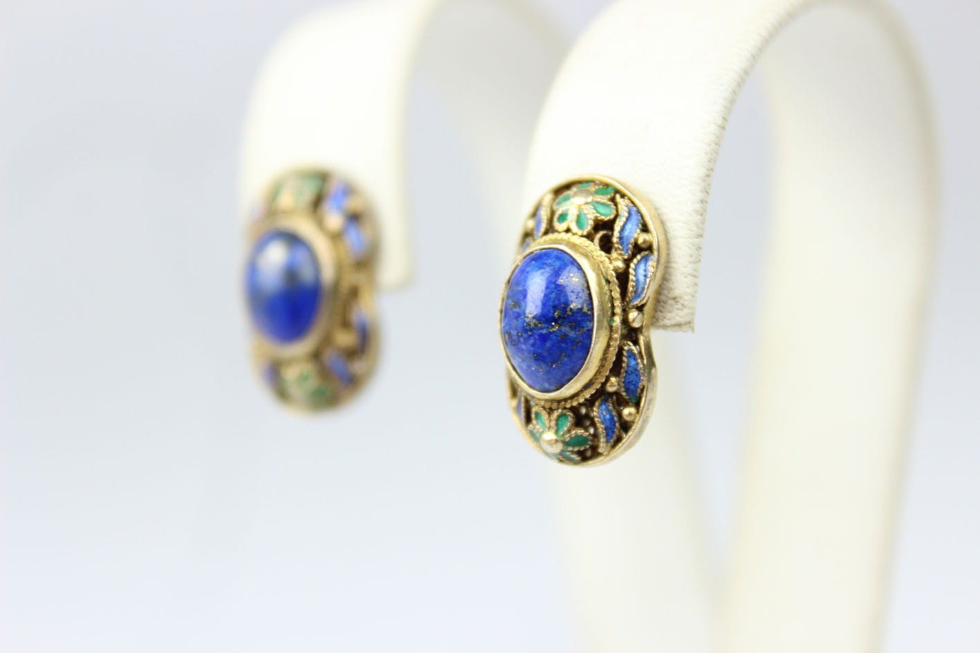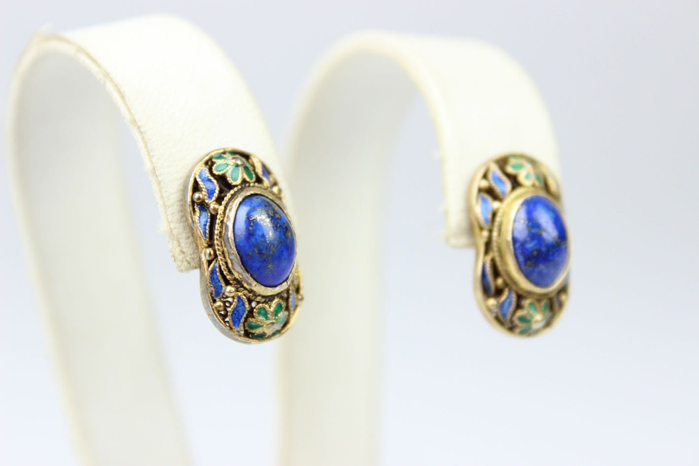 Kolorowe chińskie kolczyki z lat 50/60 XX wieku. Konstrukcja filigranowa w złoconym srebrze próby 925, zdobiona emalią. Kolczyki kameryzowane lapisem lazuli w szlifie kaboszonowym. Zapięcie typu sztyft. Bardzo dobry stan zachowania, bez przetarć z kompletną emalią. Wymiary: