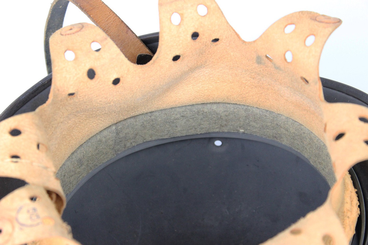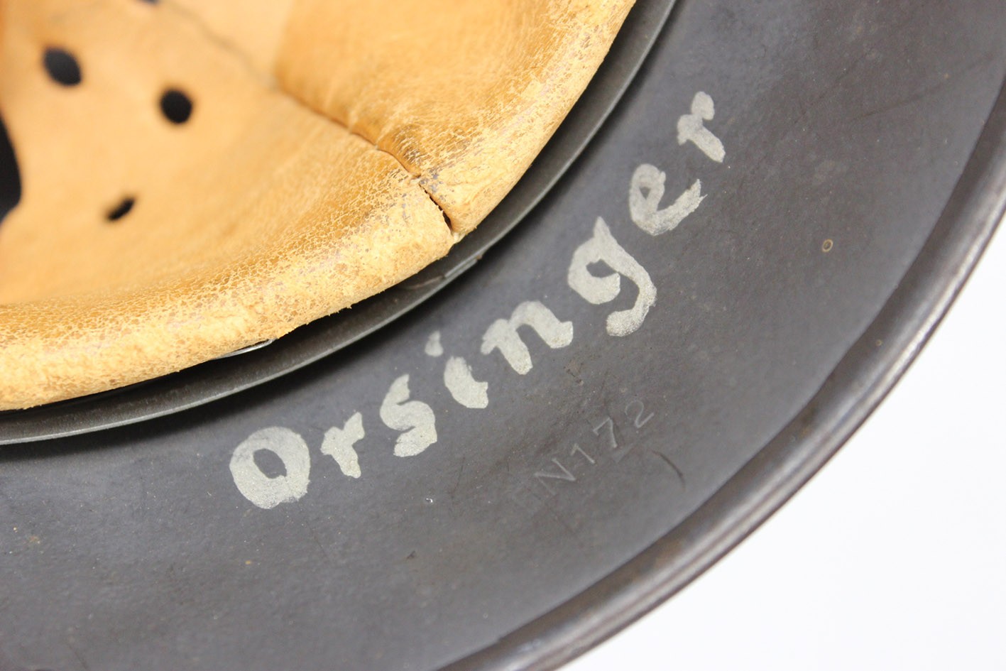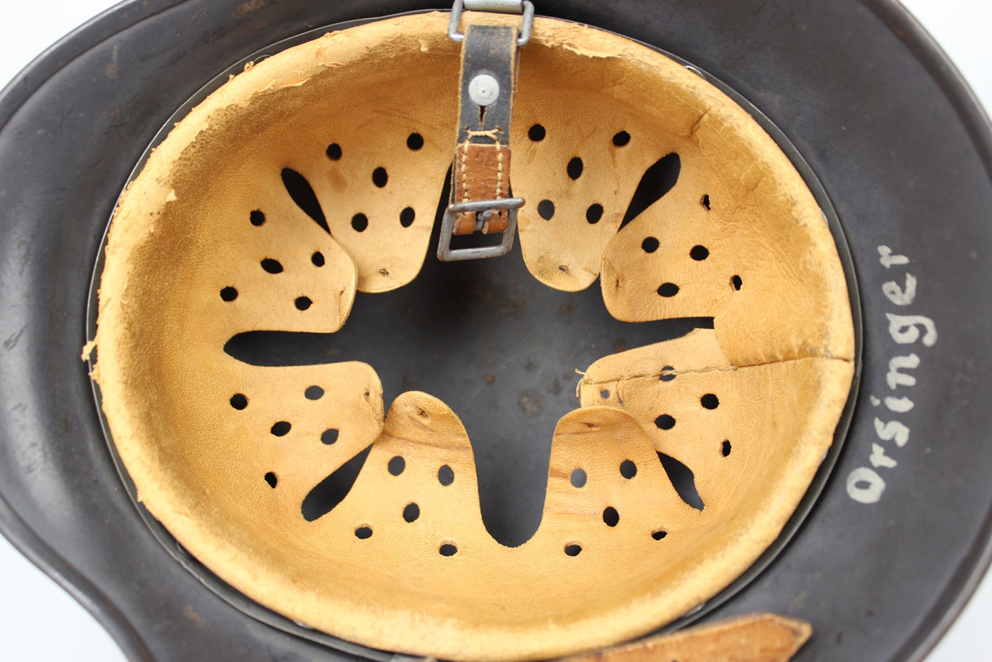 Wnętrze kompletne i w pełni oryginalne. Skórzany fasunek zachowany w naturalnej barwie, miękki i elastyczny, z pierścieniem stalowym typowym dla okresu po 1940 roku. Pasek podbródkowy w stanie dobrym, z klamrą stalową i zachowanymi przeszyciami. Na rancie widoczny odręczny napis nazwiska użytkownika: „Orsinger”.
