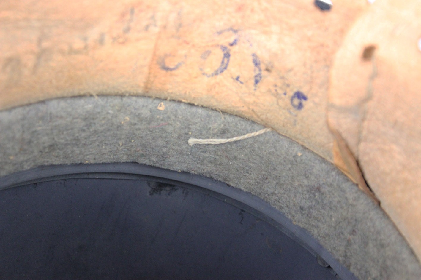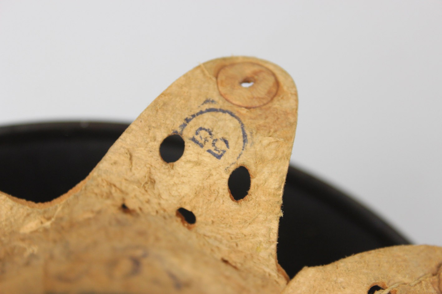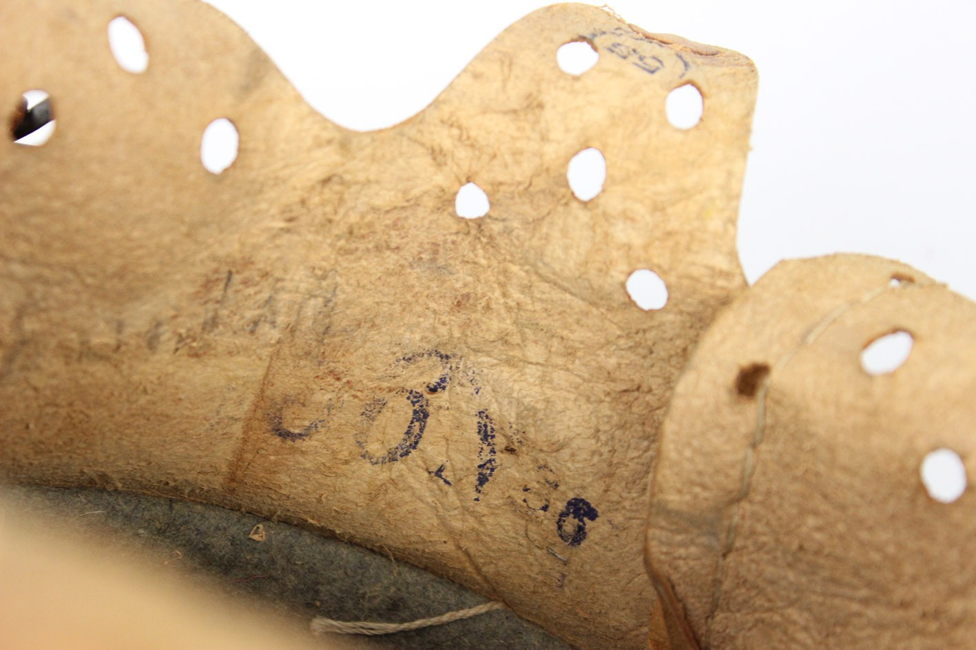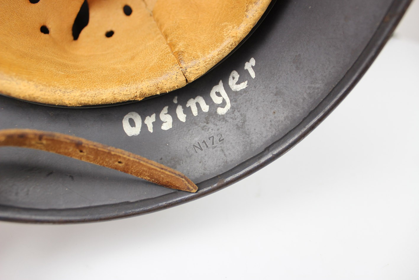 Wnętrze kompletne i w pełni oryginalne. Skórzany fasunek zachowany w naturalnej barwie, miękki i elastyczny, z pierścieniem stalowym typowym dla okresu po 1940 roku. Pasek podbródkowy w stanie dobrym, z klamrą stalową i zachowanymi przeszyciami. Na rancie widoczny odręczny napis nazwiska użytkownika: „Orsinger”.