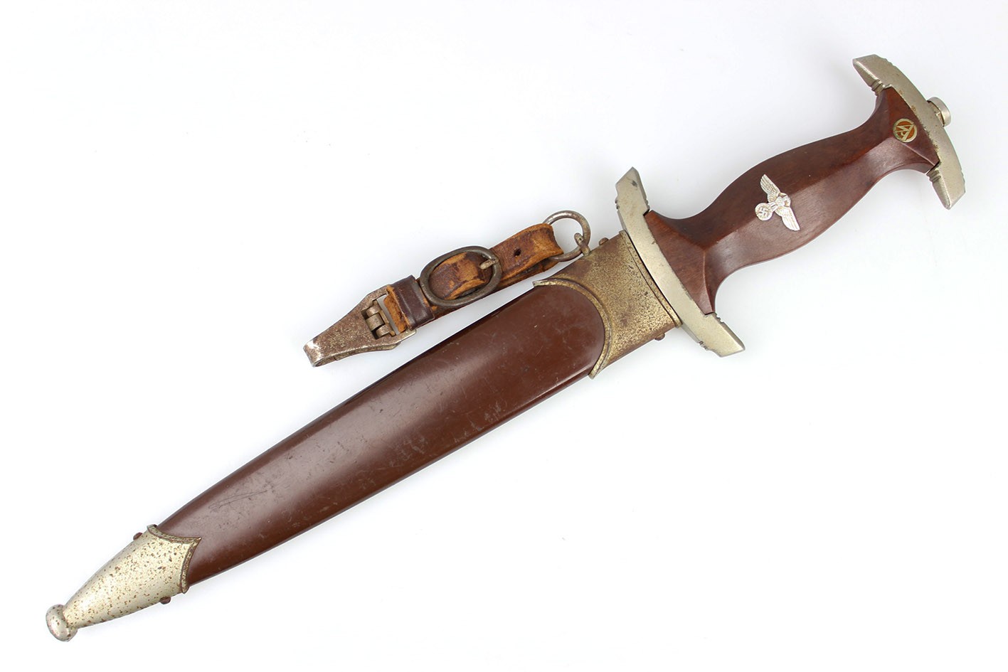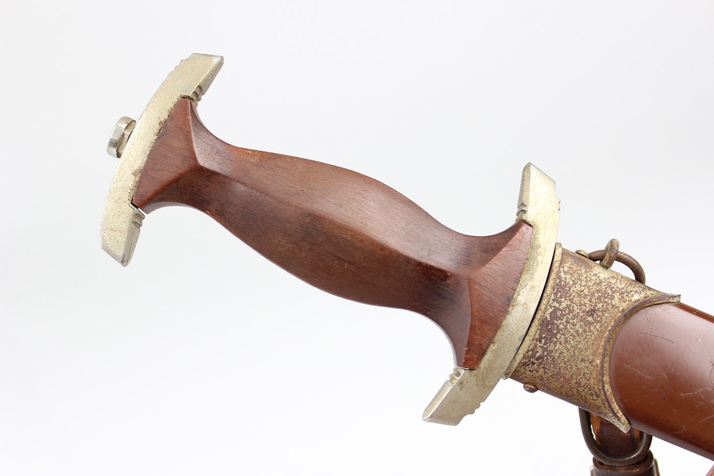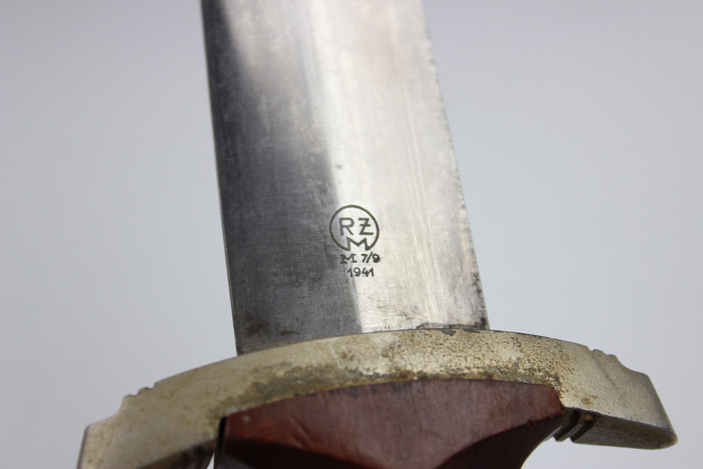 Głownia prezentuje się bardzo dobrze z wyraźnie zachowanym, trawionym mottem „Alles für Deutschland” oraz sygnaturą producenta „RZM M7/9 1941” na wewnętrznej stronie. Precyzyjne dopasowanie głowni do dolnego konturu jelca świadczy o dobrej jakości wykonania. Chwyt z orzecha z pierwotnym, głębokim kolorem drewna. Odznaka SA jest idealnie umiejscowiona, z zachowaną kompletną emalią. Aluminiowy orzeł, osadzony precyzyjnie—wyraźnie widoczne są pióra głowy, skrzydeł i piersi, ostre szpony oraz dobrze widoczna swastyka. Jelce z niklowanego cynku nie noszą śladów przetarć czy ubytków a jedynie pozostają przypruszone kilkudziesięcioletną patyną. Górna śruba, również niklowana, bez śladów ingerencji.
