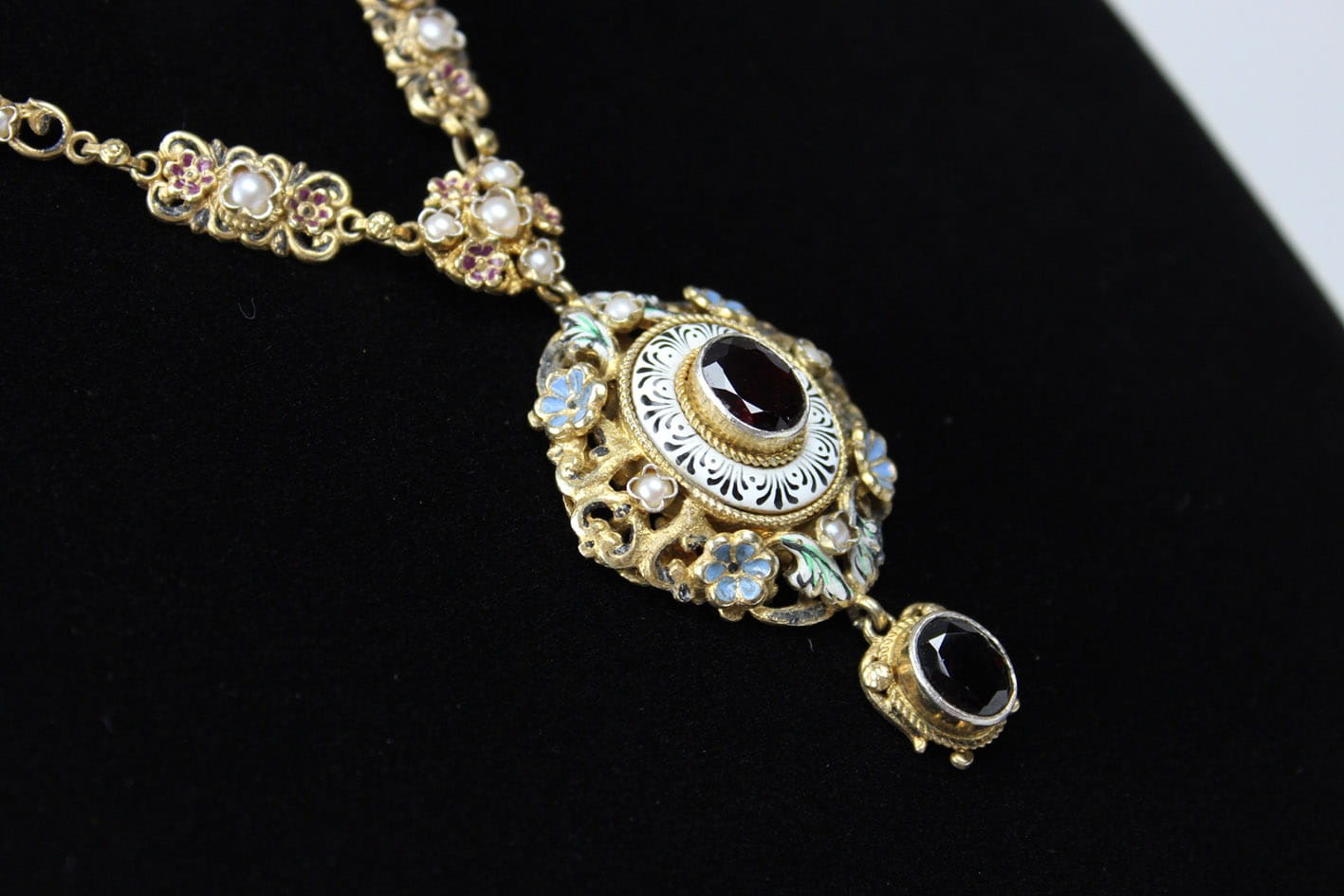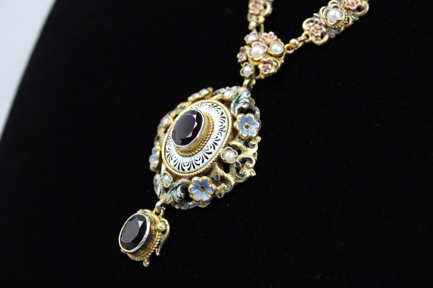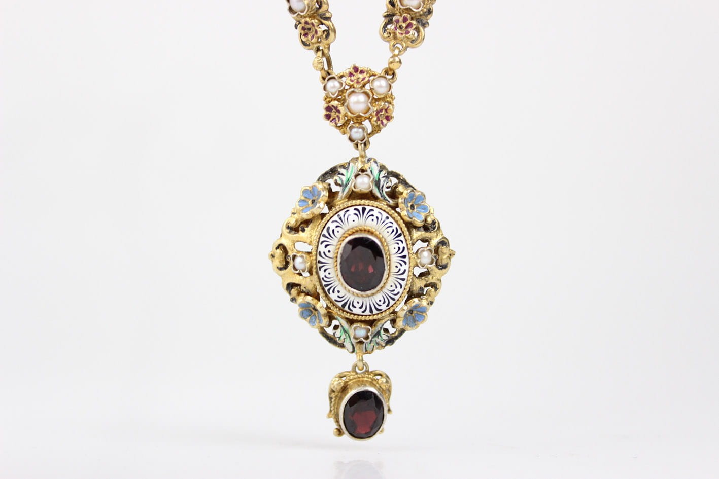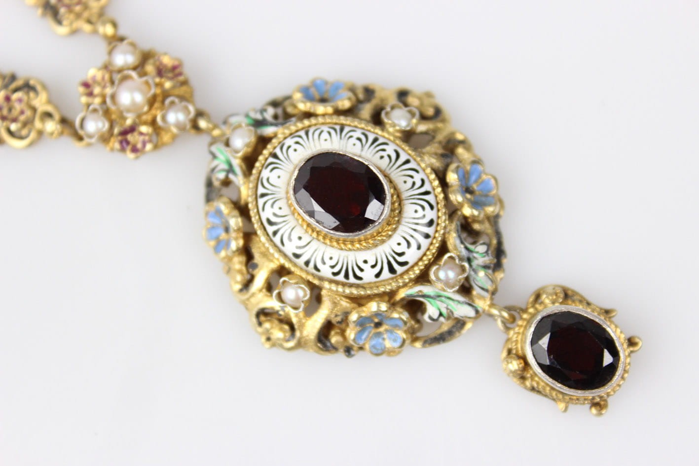 Wyjątkowo bogaty i niezwykle okazały naszyjnik z lat 20-30 tych XX wieku. Stylistyka historyzująca nawiązująca do wyrobów austro-węgierskich z końca XIX wieku. Wyrób w złoconym srebrze kameryzowany fasetowanym naturalnymi granatami, perłami oraz kolorową emalią. Zapięcie szufladkowe. Stan zachowania bardzo dobry. Wymiary: