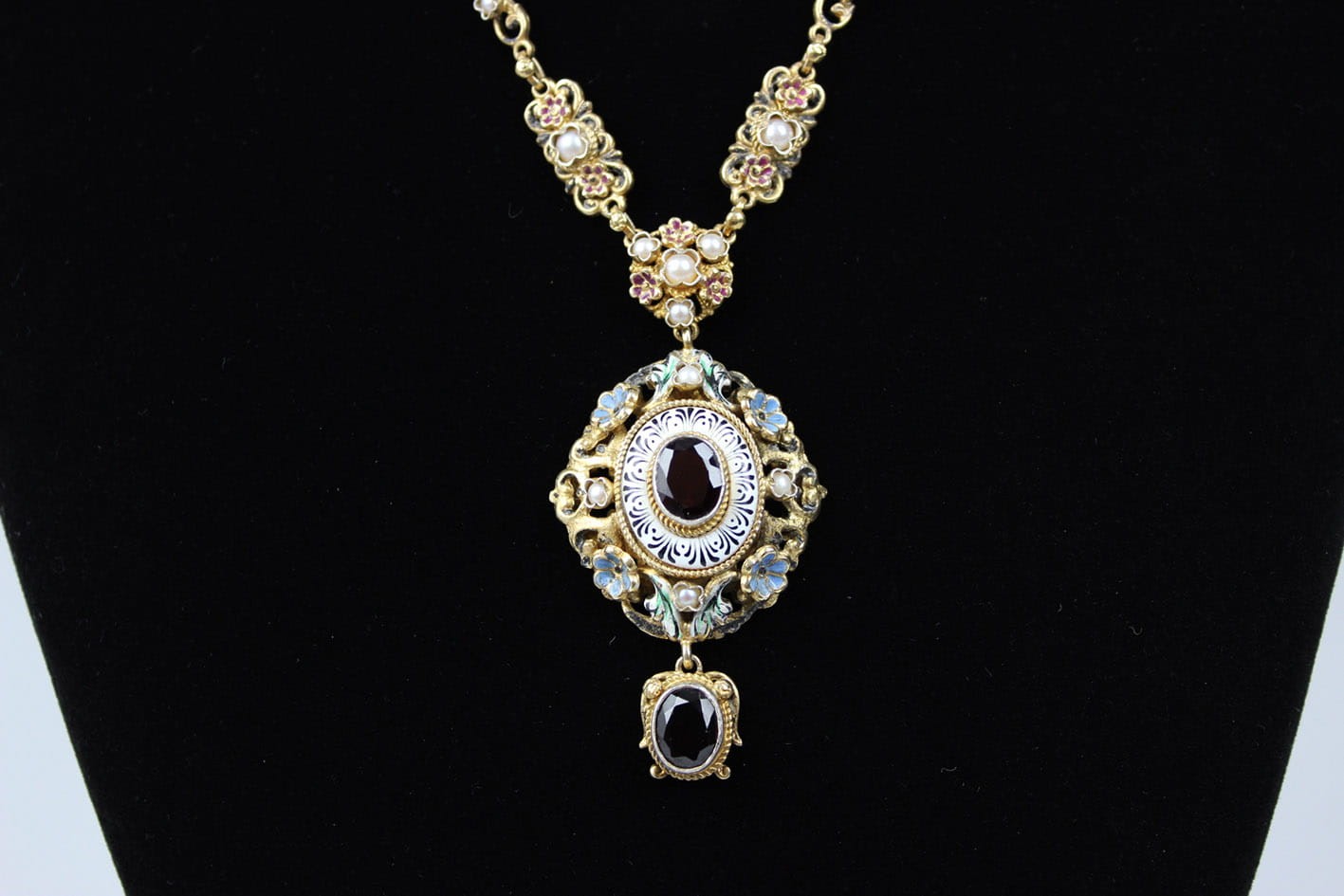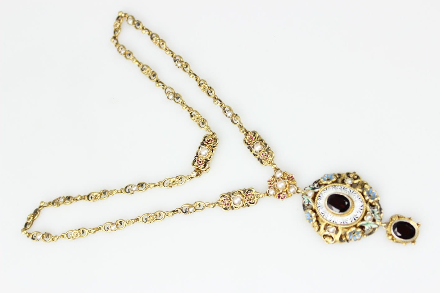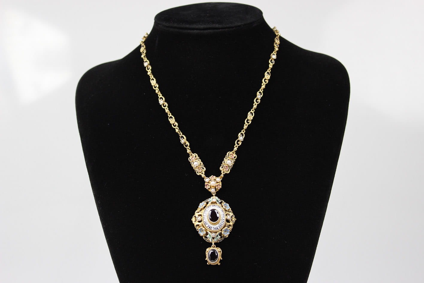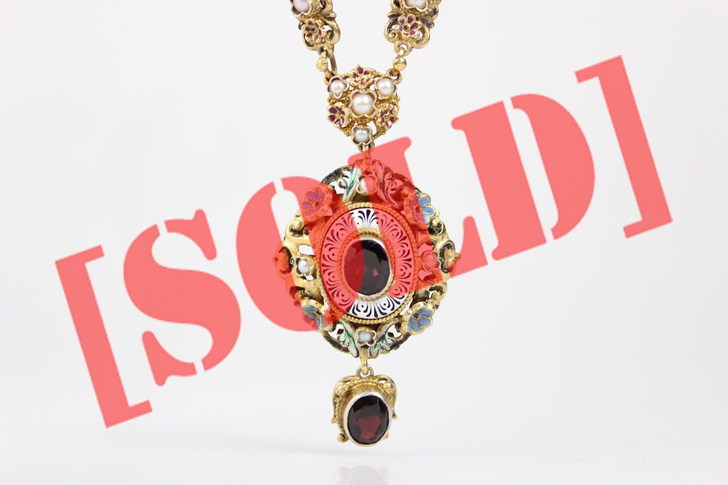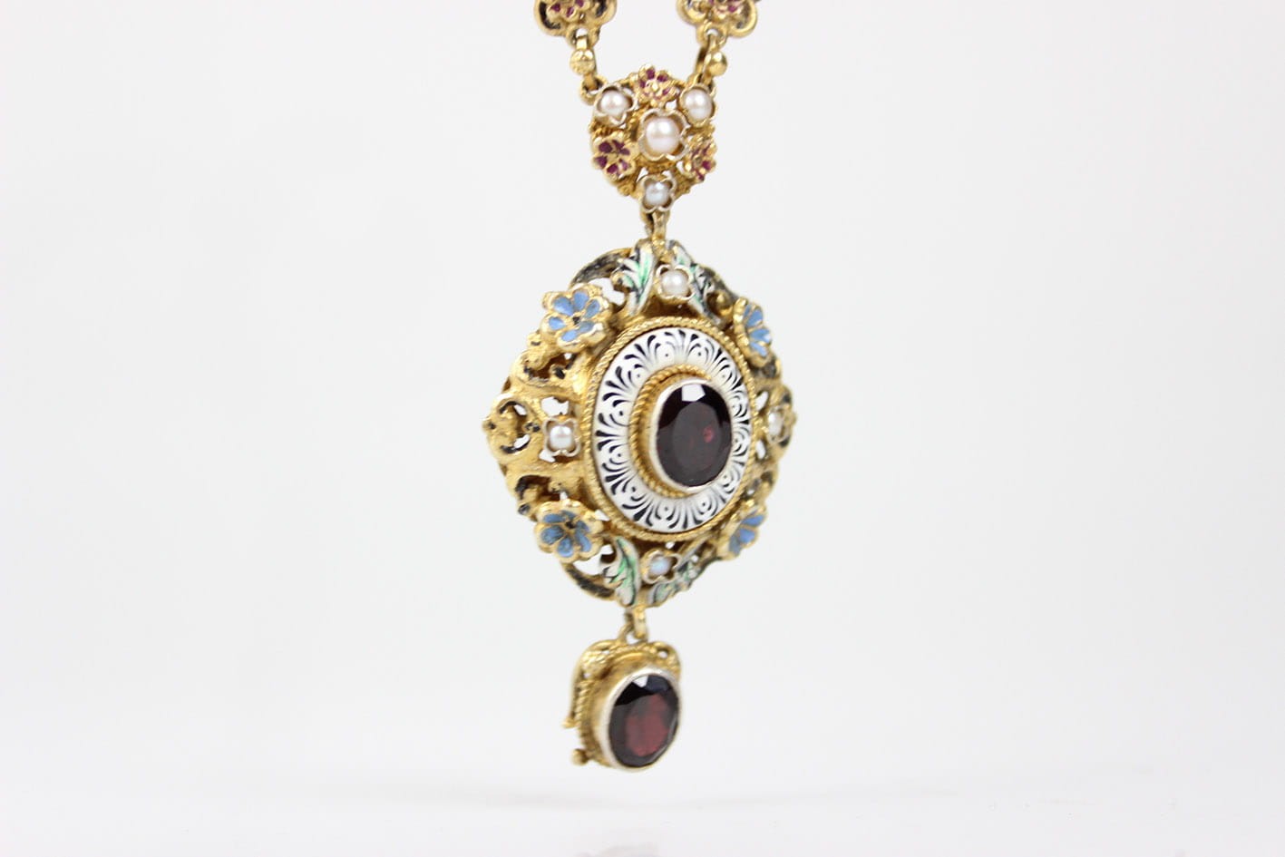 Wyjątkowo bogaty i niezwykle okazały naszyjnik z lat 20-30 tych XX wieku. Stylistyka historyzująca nawiązująca do wyrobów austro-węgierskich z końca XIX wieku. Wyrób w złoconym srebrze kameryzowany fasetowanym naturalnymi granatami, perłami oraz kolorową emalią. Zapięcie szufladkowe. Stan zachowania bardzo dobry. Wymiary: