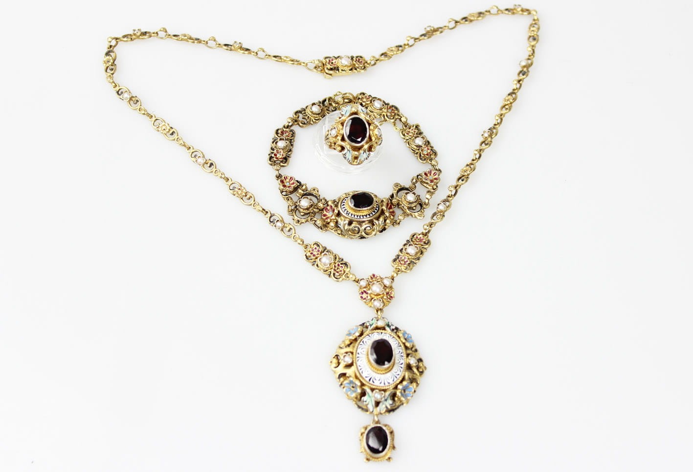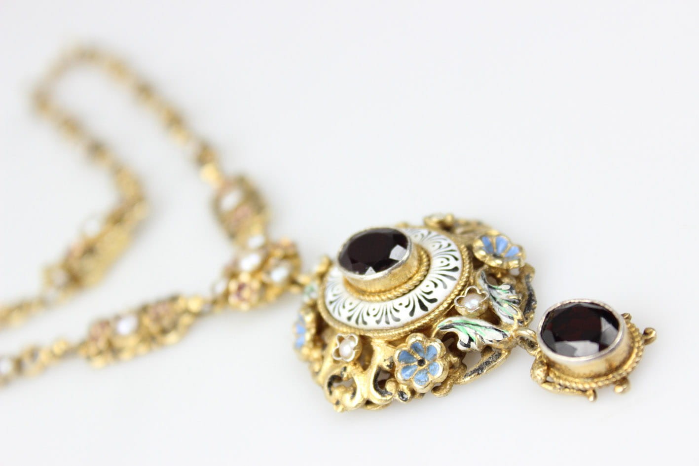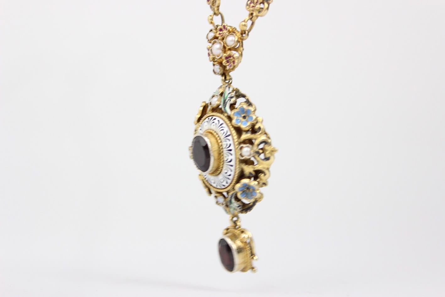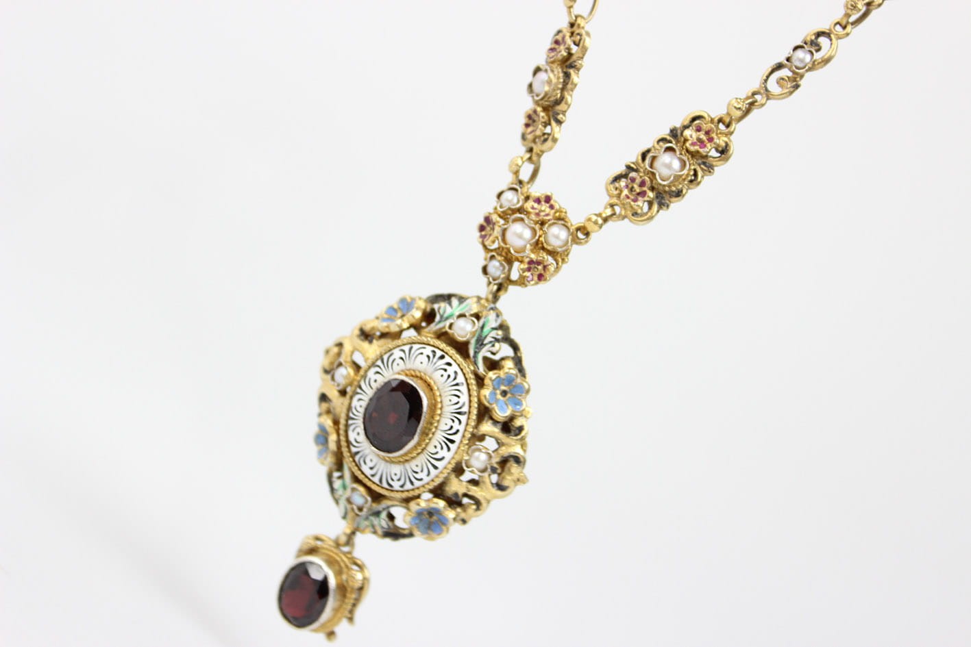 Wyjątkowo bogaty i niezwykle okazały naszyjnik z lat 20-30 tych XX wieku. Stylistyka historyzująca nawiązująca do wyrobów austro-węgierskich z końca XIX wieku. Wyrób w złoconym srebrze kameryzowany fasetowanym naturalnymi granatami, perłami oraz kolorową emalią. Zapięcie szufladkowe. Stan zachowania bardzo dobry. Wymiary: