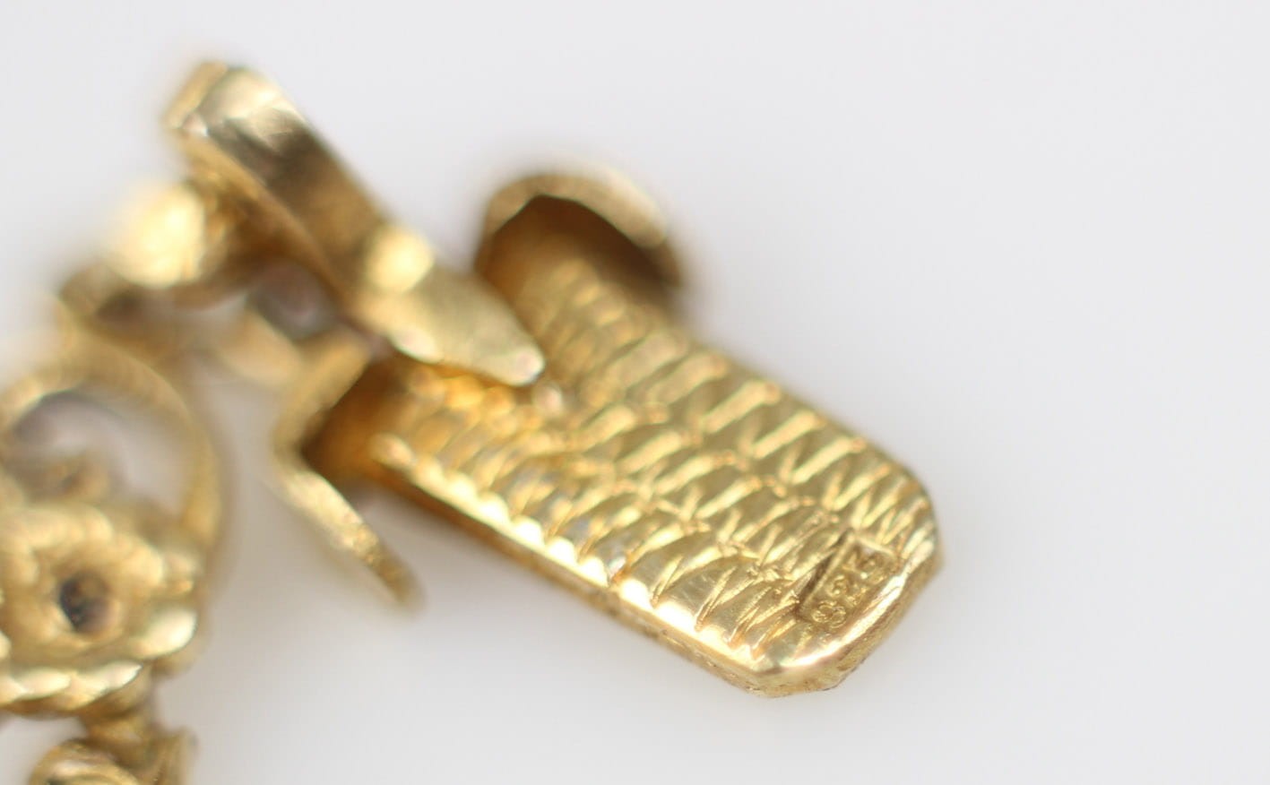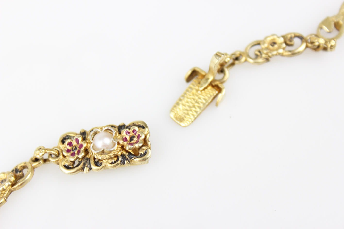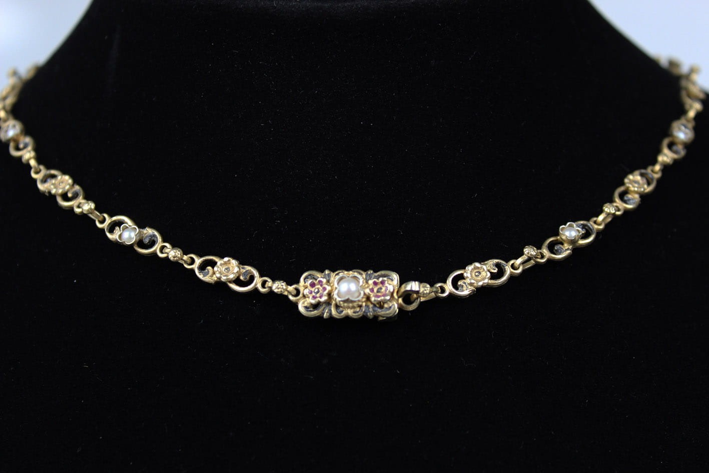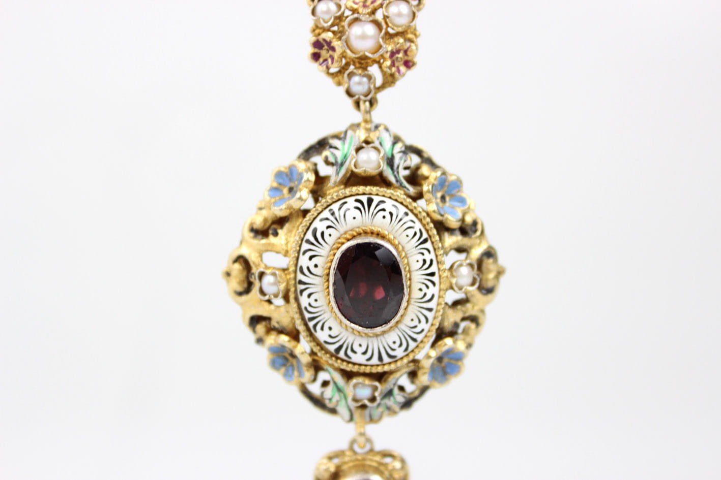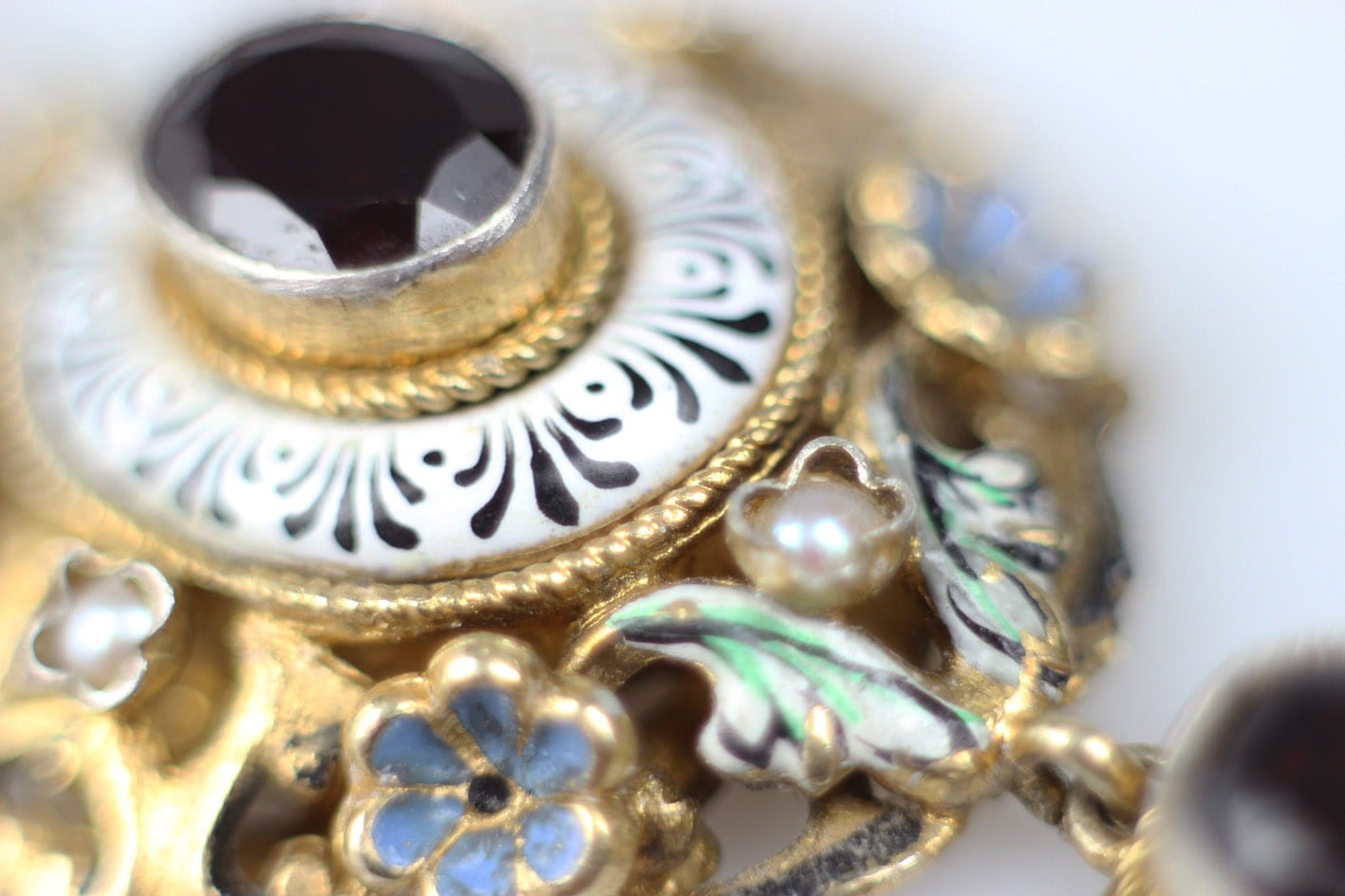 Wyjątkowo bogaty i niezwykle okazały naszyjnik z lat 20-30 tych XX wieku. Stylistyka historyzująca nawiązująca do wyrobów austro-węgierskich z końca XIX wieku. Wyrób w złoconym srebrze kameryzowany fasetowanym naturalnymi granatami, perłami oraz kolorową emalią. Zapięcie szufladkowe. Stan zachowania bardzo dobry. Wymiary: