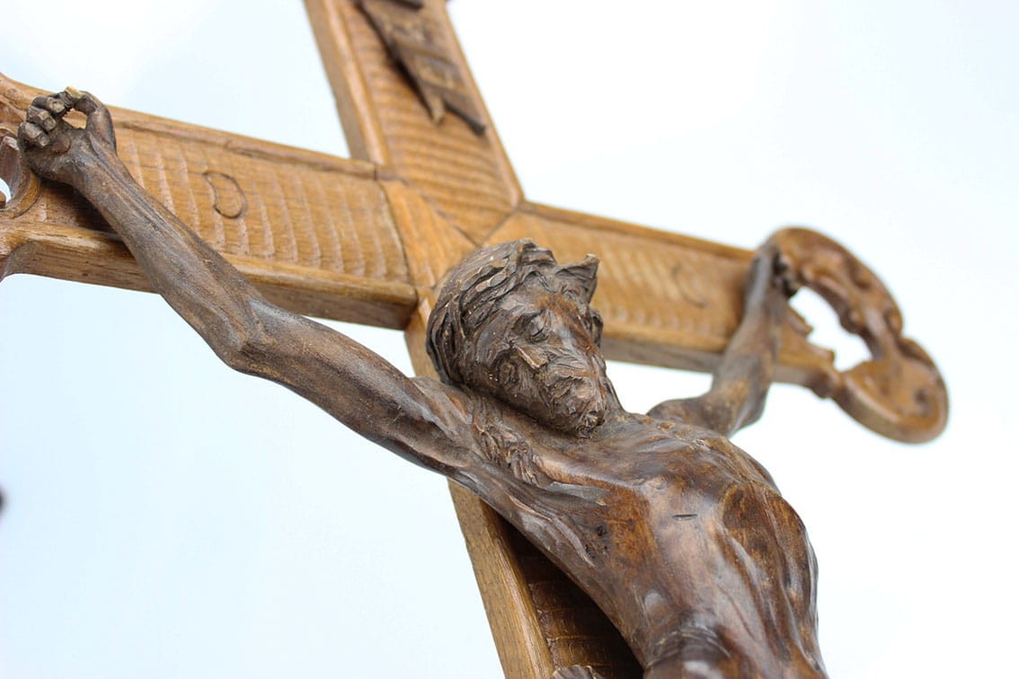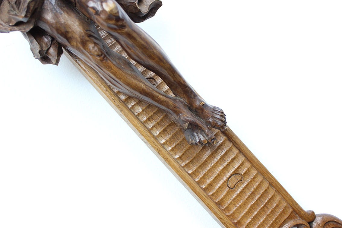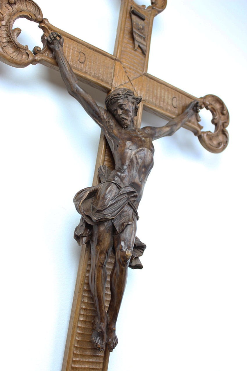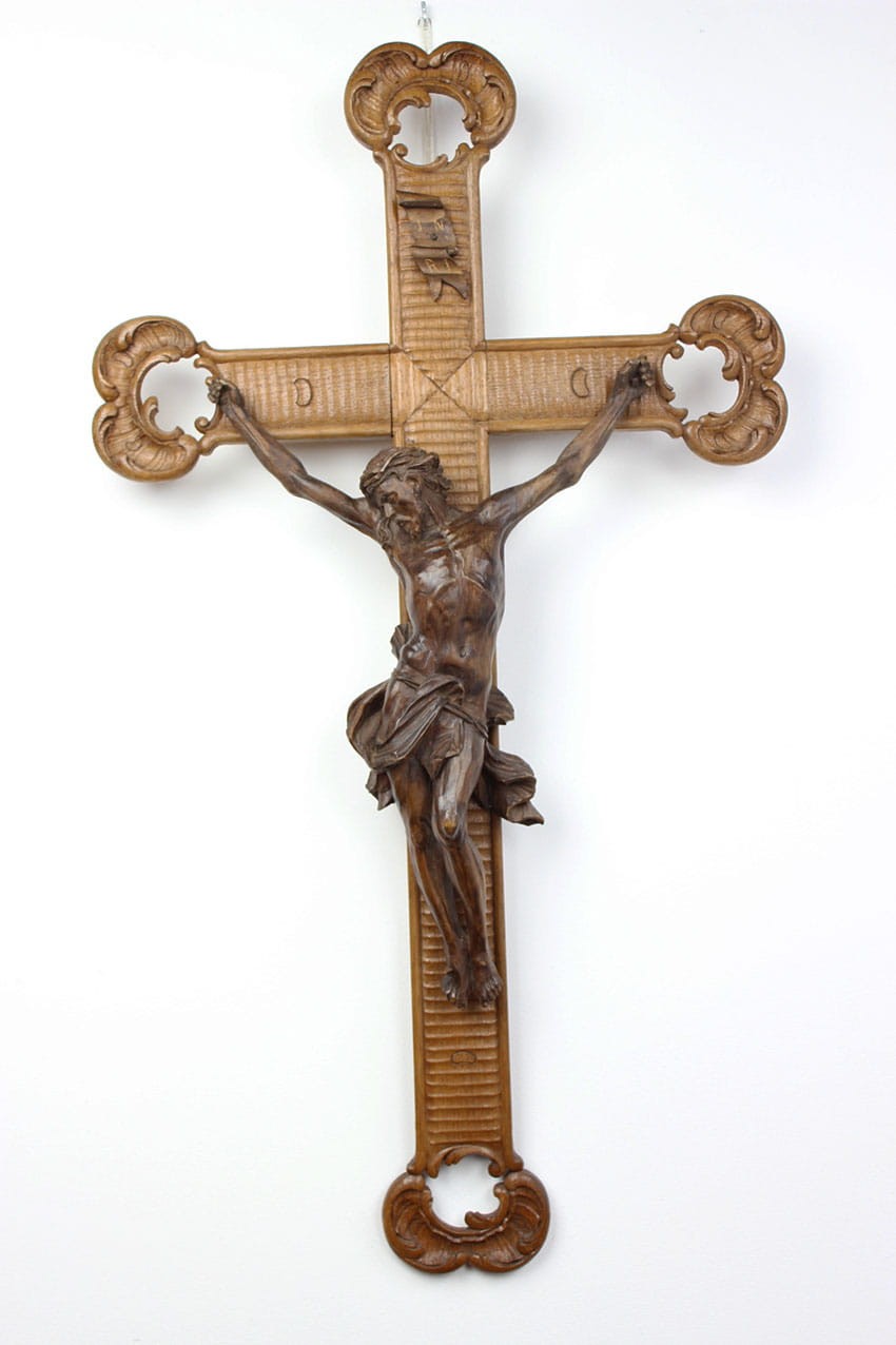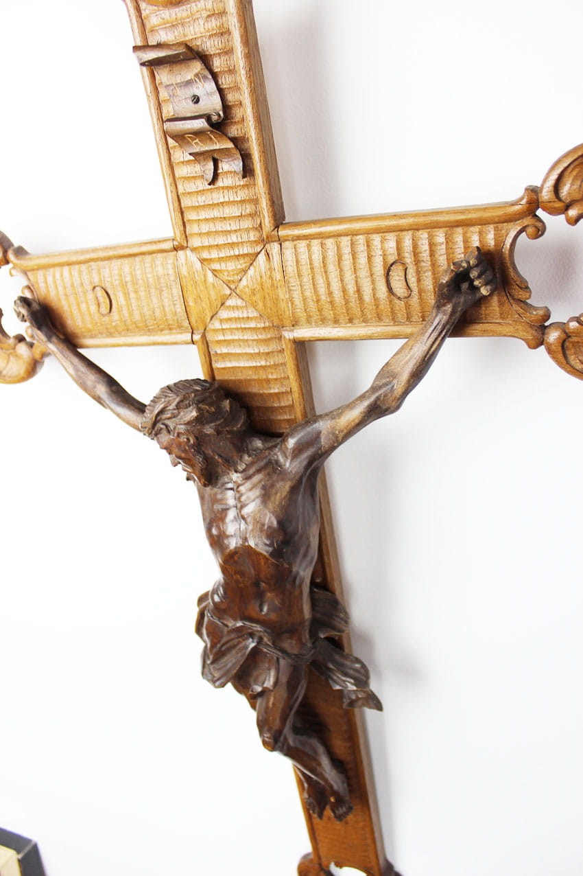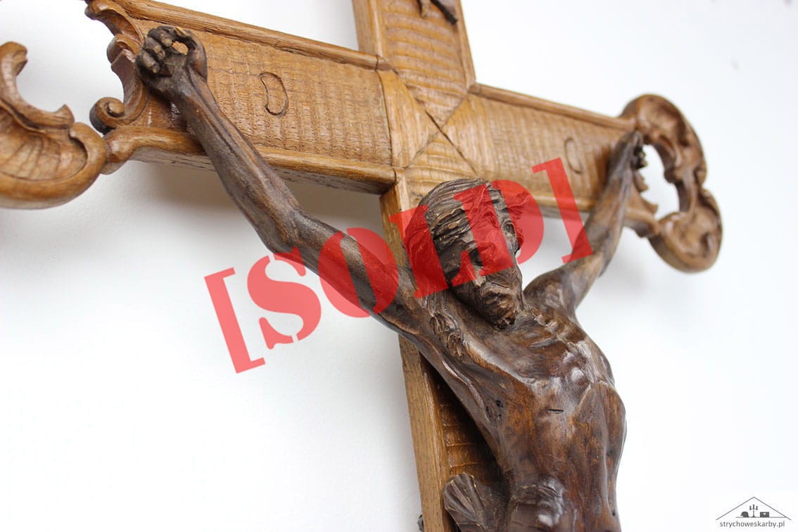 Przepiękny niezwykle okazały krucyfiks z II poł. XIX wieku wykonany na terenie południowych Niemiec. Figura Chrystusa z drewna lipowego, natomiast krzyż wykonany w dębie. Awers krzyża sygnowany podpisem artysty Edmund Rack. Stan zachowania bardzo dobry.