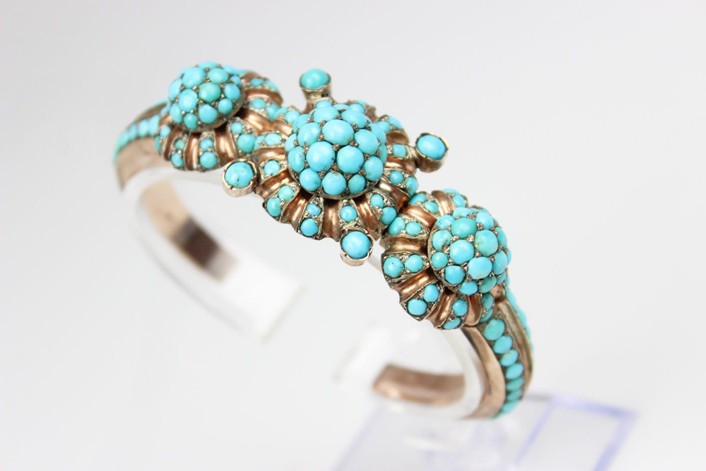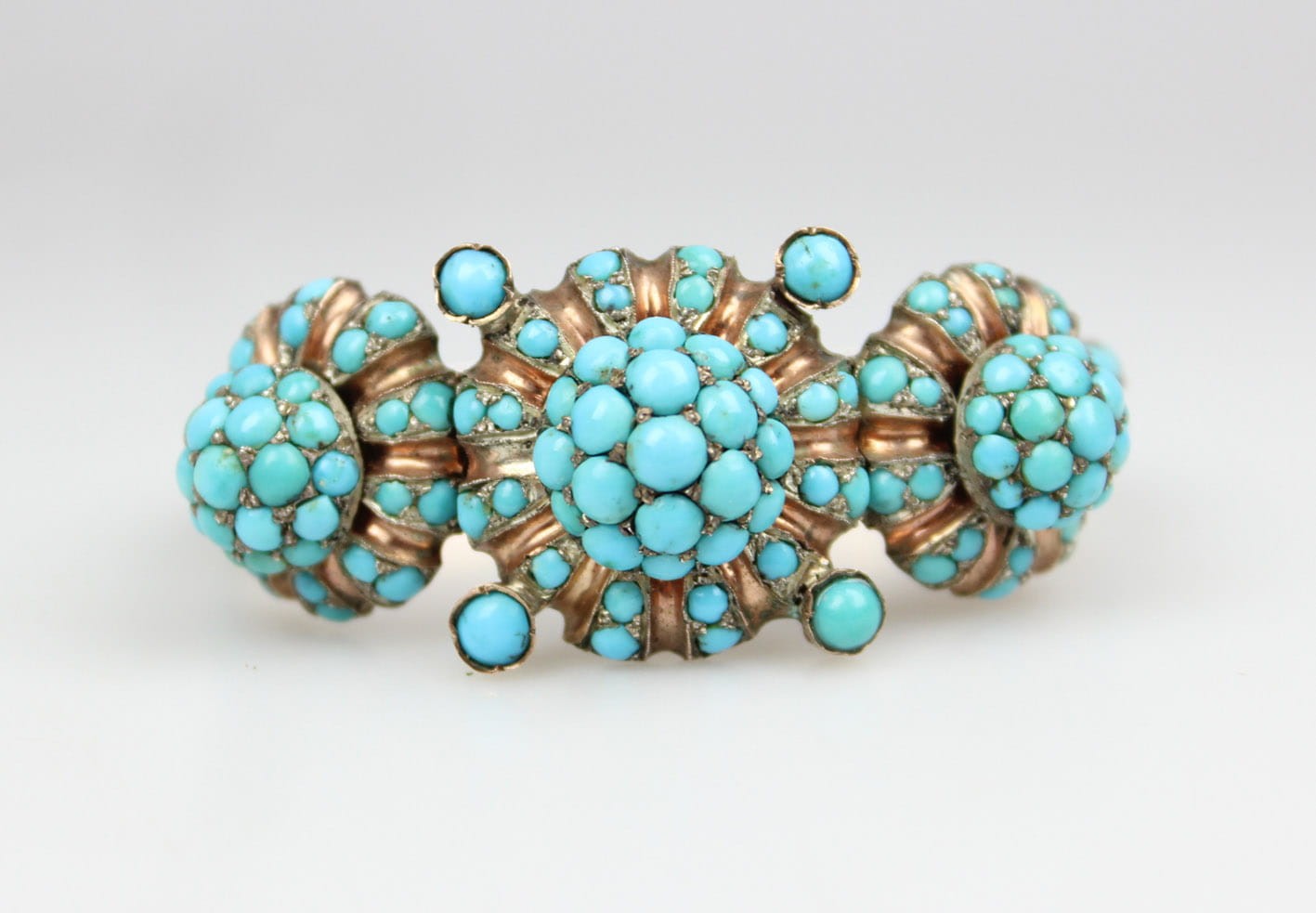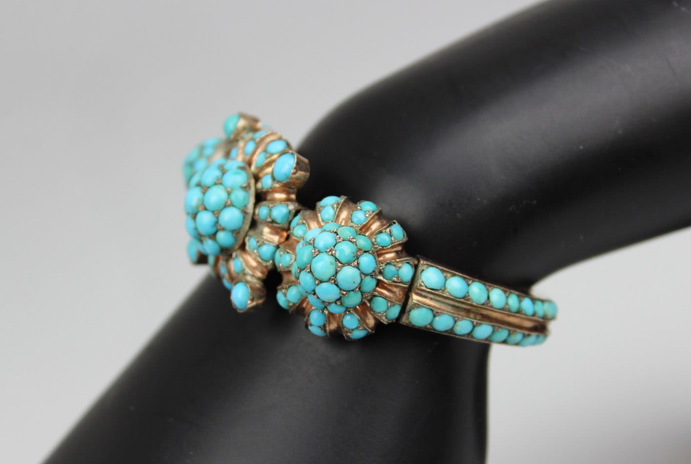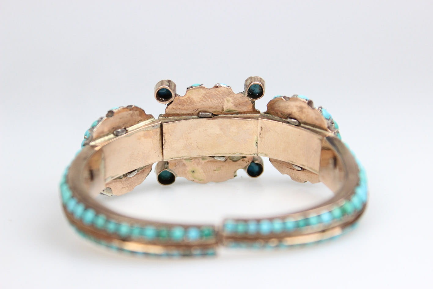 Przepiękna, sztywna bransoletka typu otwartego pochodząca z II połowy XIX wieku. Materiał z jakiego wykonano bransoletkę to 17% złoto, 33% srebro i 50% miedź. Konstrukcja eliptyczna, składająca się z pięciu elementów. Przedmiot na wewnętrznych sprężynach umożliwiających zakładanie i noszenie na szerszym nadgarstku niż obwód bransoletki. Całość bogato zdobiona naturalnym turkusem w szlifie kaboszonowym. Bransoletka w oryginalnym stanie zachowania. Idealna dla kobiety o nadgarstku 15,5 cm. Wymiary: