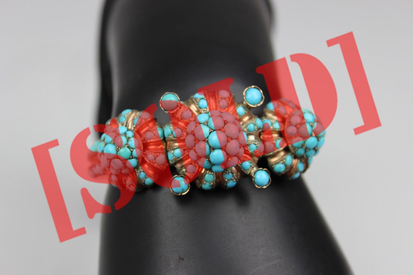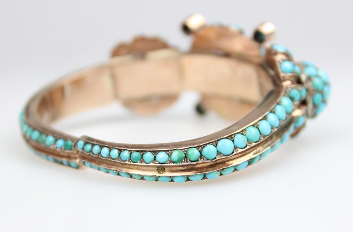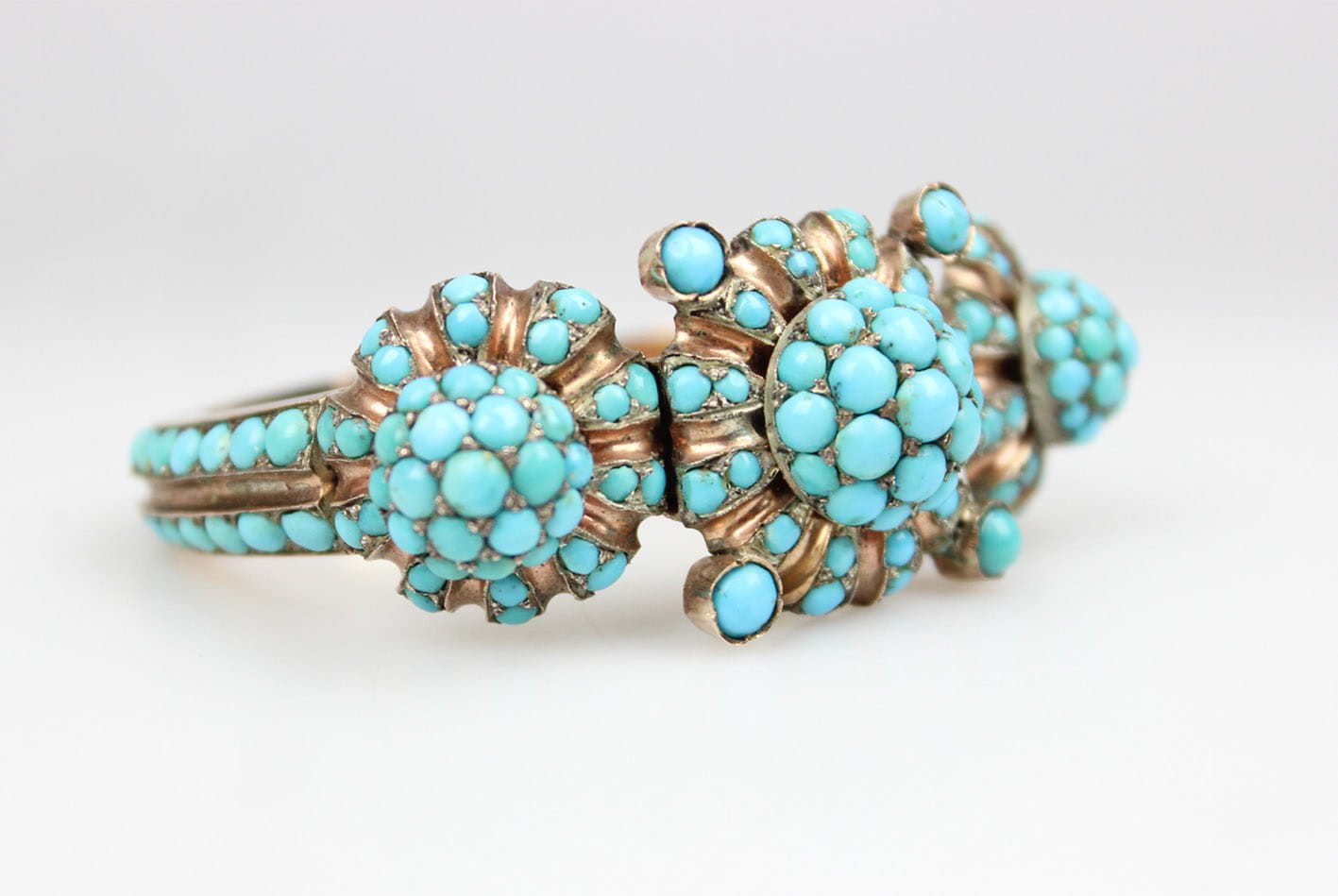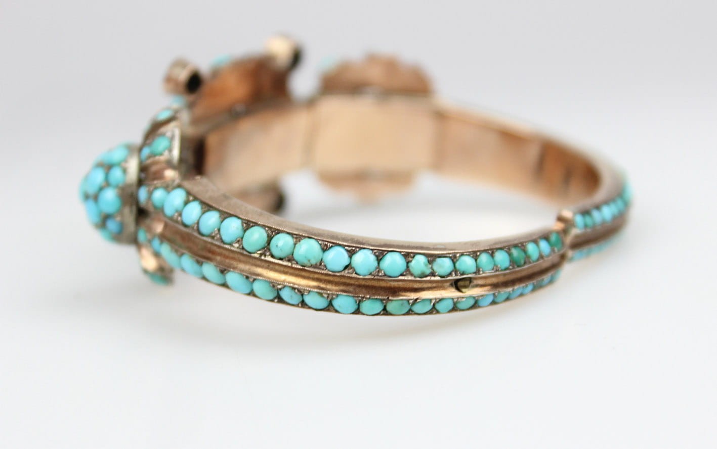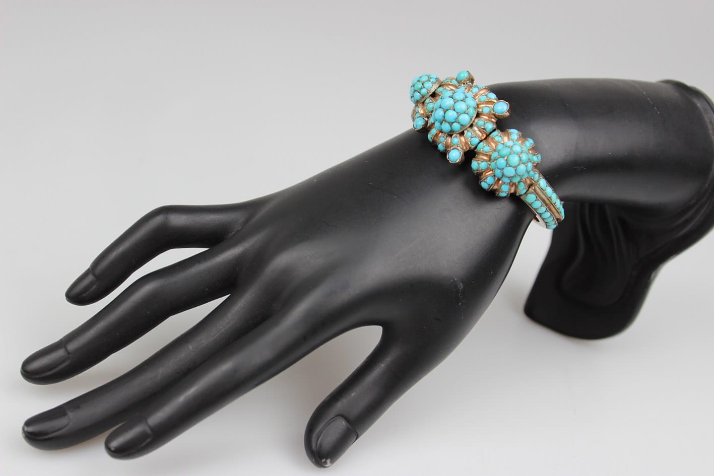 Przepiękna, sztywna bransoletka typu otwartego pochodząca z II połowy XIX wieku. Materiał z jakiego wykonano bransoletkę to 17% złoto, 33% srebro i 50% miedź. Konstrukcja eliptyczna, składająca się z pięciu elementów. Przedmiot na wewnętrznych sprężynach umożliwiających zakładanie i noszenie na szerszym nadgarstku niż obwód bransoletki. Całość bogato zdobiona naturalnym turkusem w szlifie kaboszonowym. Bransoletka w oryginalnym stanie zachowania. Idealna dla kobiety o nadgarstku 15,5 cm. Wymiary: