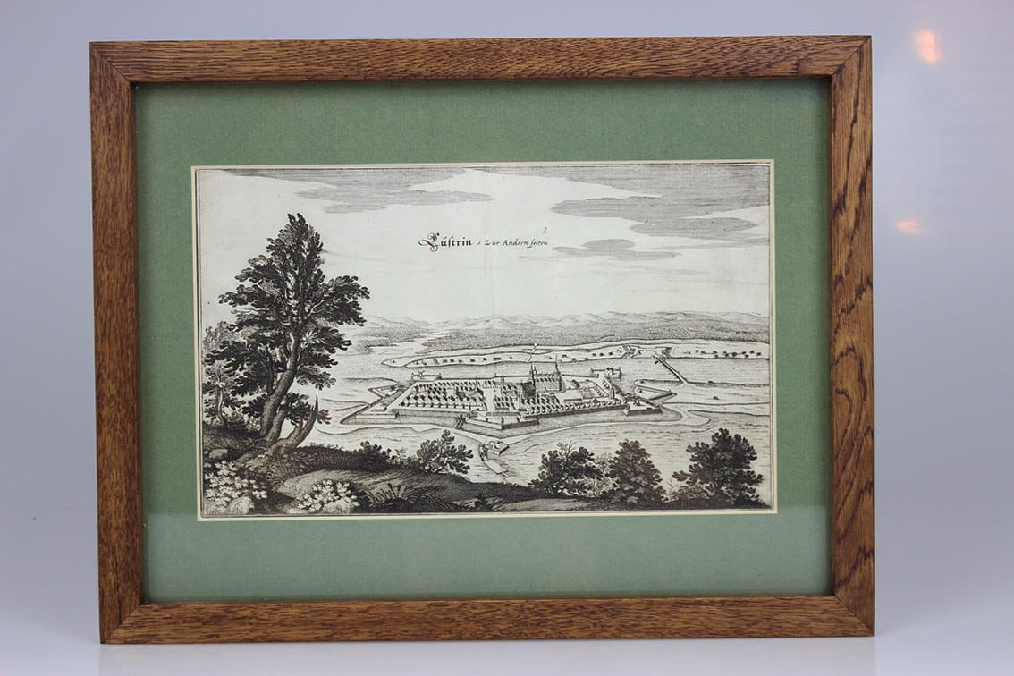 Oryginalny miedzioryt przedstawiający plan twierdzy Kostrzyn nad Odrą ( Custrin ) wykonany przez Matthausa Merian ( 1593-1650) a pochodzący z dziela J.G. Tielckego " Beytrage zur Kriegs-Kunst und Geschichte des Krieges..." wydany w latach 1775-1786. Wymiary planu 19,3 cm x 31,7 cm (odbitka na dwóch połączonych arkuszach papieru). Całość w passe partout, za szkłem w drewnianej ramie. Wymiary ramy 42,5cm x 33 cm.