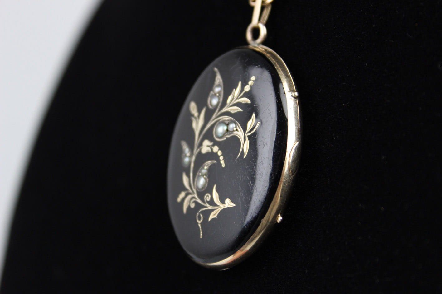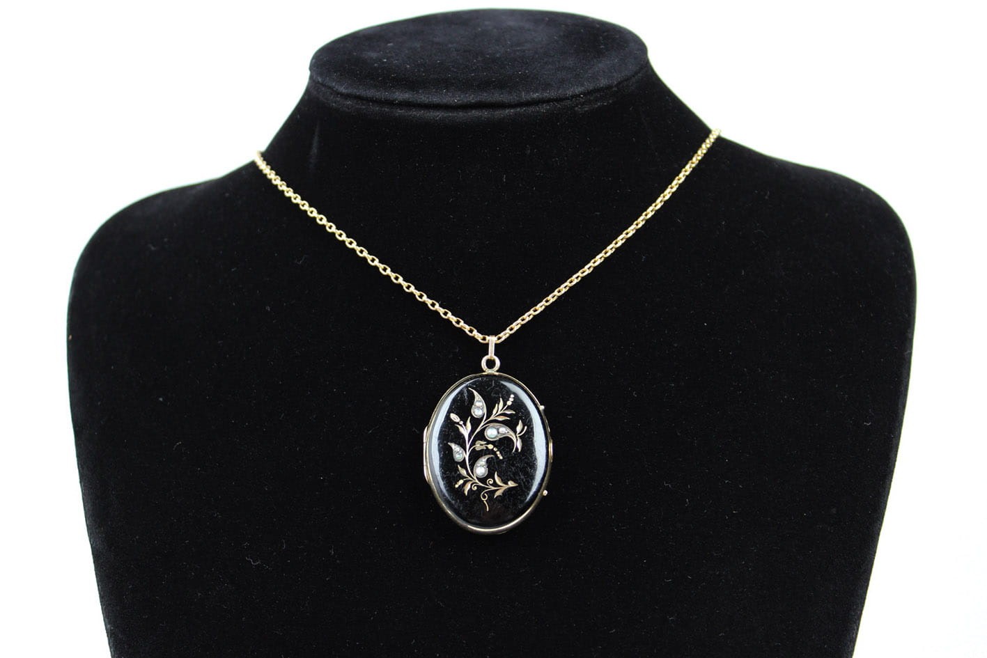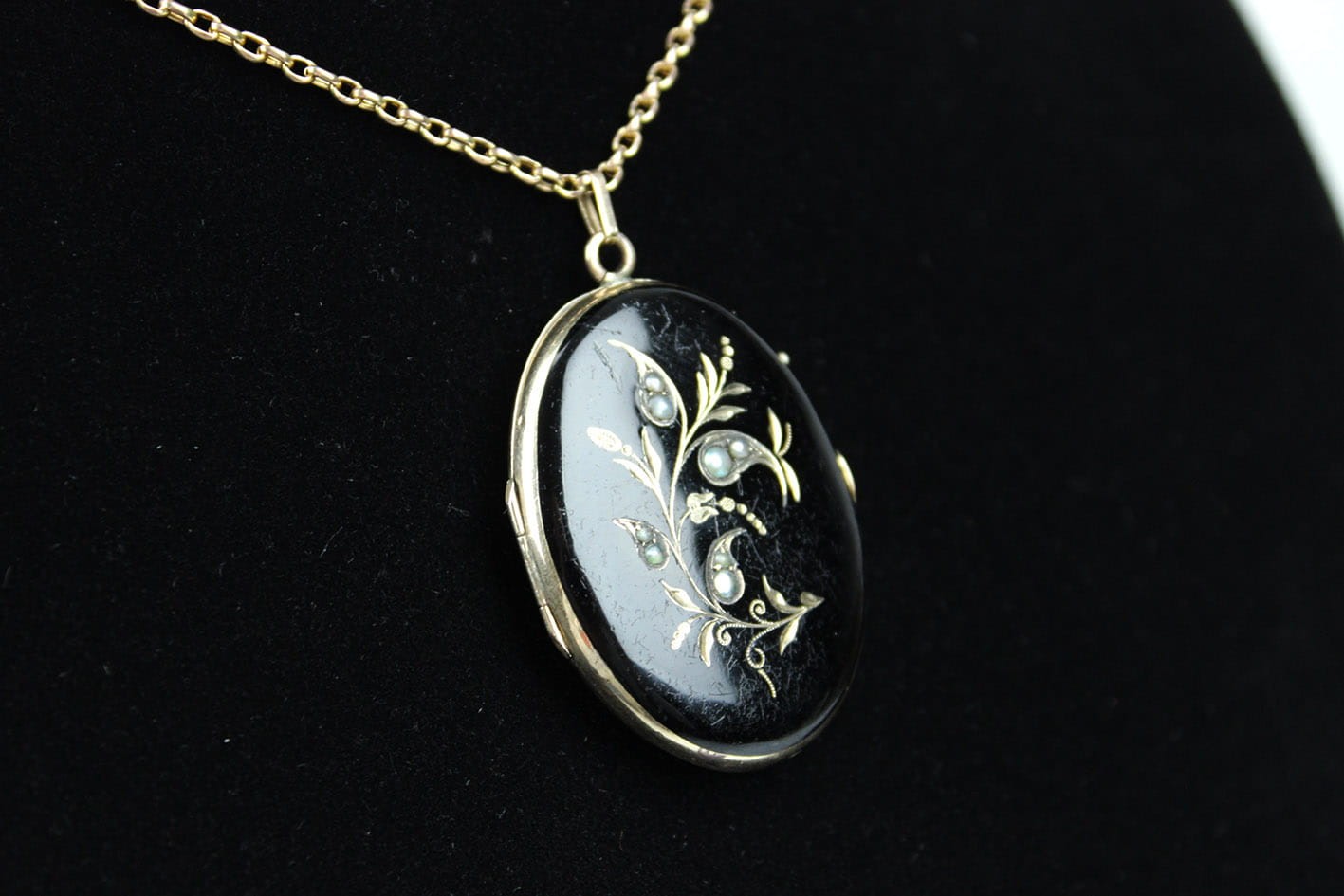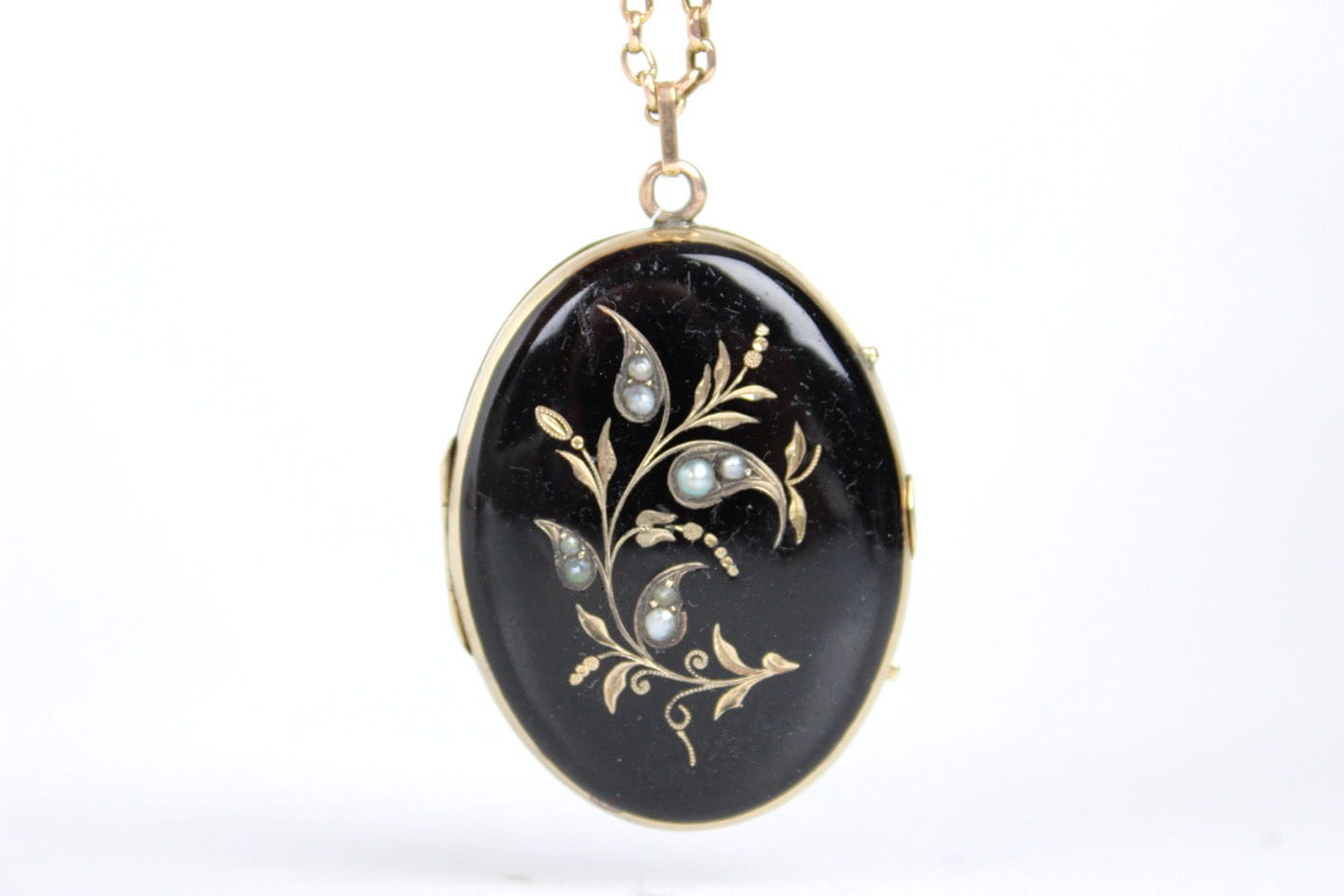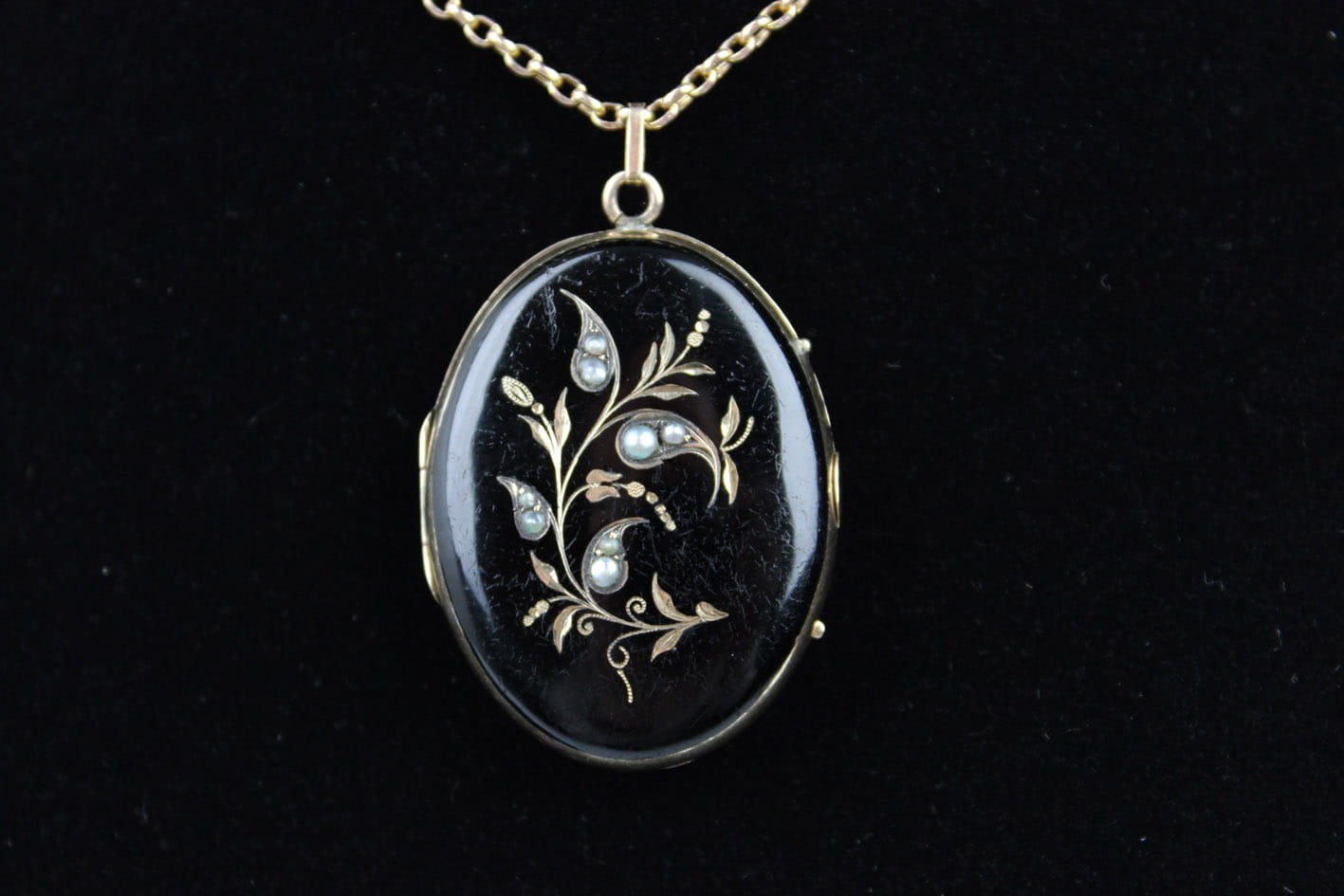 Okazały medalion z II połowy XIX wieku, wykonany z mieszanych materiałów – złota próby około 560-580 oraz srebra próby około 800 (brak punc, całość badana metodą kwasową). Awers zdobi finezyjny grawerunek z motywami floralnymi, dodatkowo wzbogacony półperłami oraz elegancką czarną emalią. Rewers również pokryty jest czarną emalią. Stan zachowania: bardzo dobry, z jedynie delikatnymi rysami oraz niewielkim śladem po naprawie emalii z epoki, widocznym dyskretnie na rewersie przy oczku. Wnętrze kryje podwójną ramkę, z czego jedna jest oszklona, przeznaczona na zdjęcie lub pukiel włosów. W medalionie zachowano oryginalne zdjęcie z lat 30. XX wieku, co dodaje mu historycznego uroku. Wymiary: