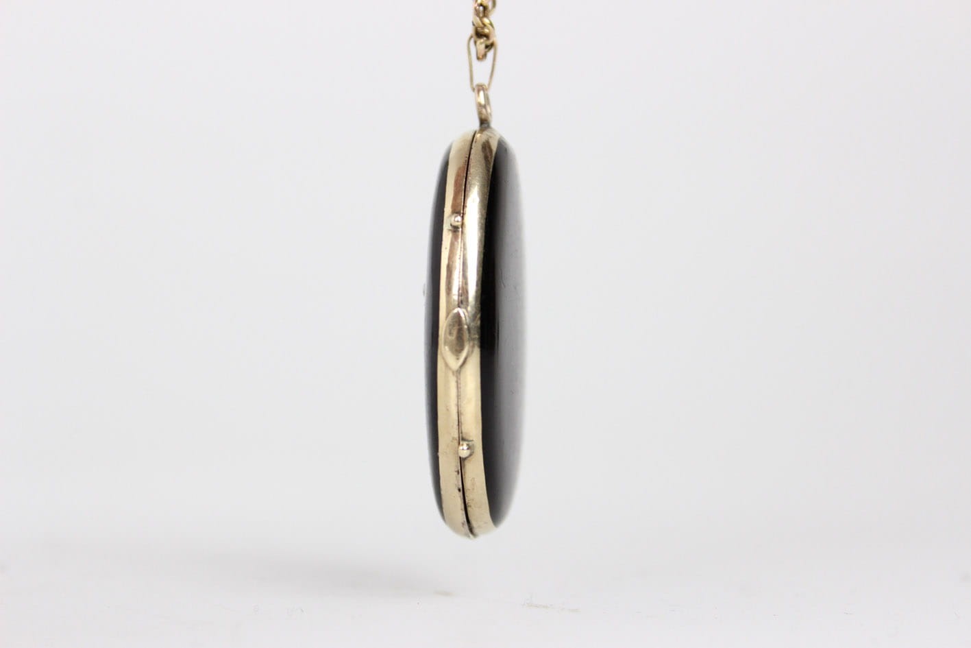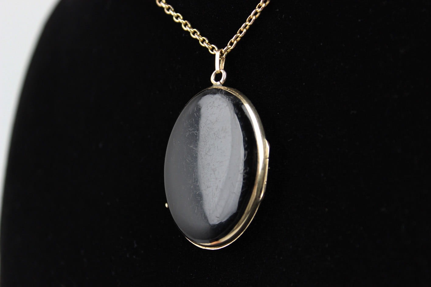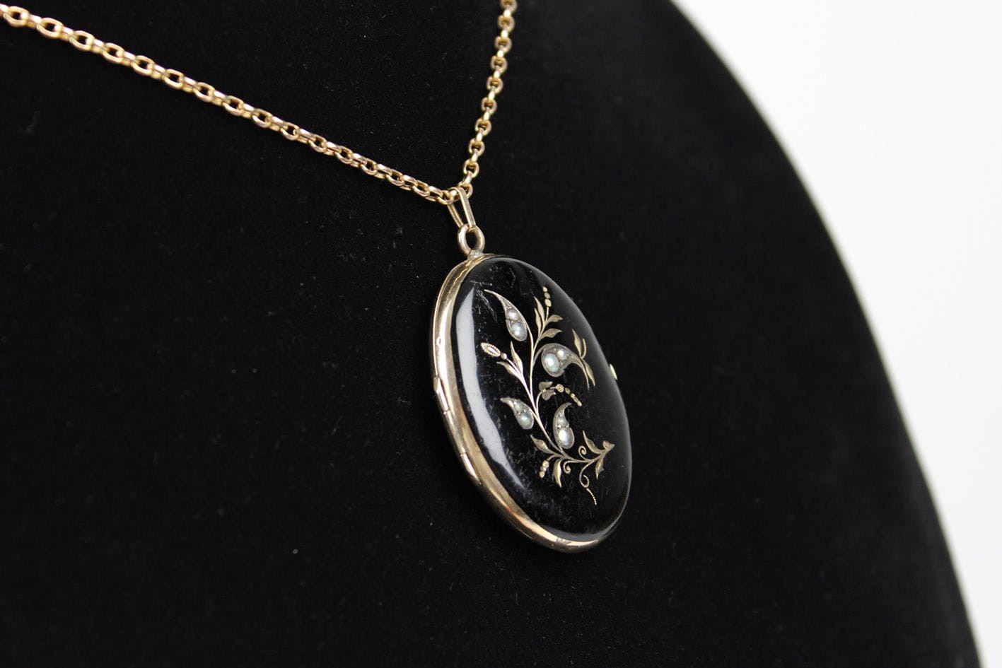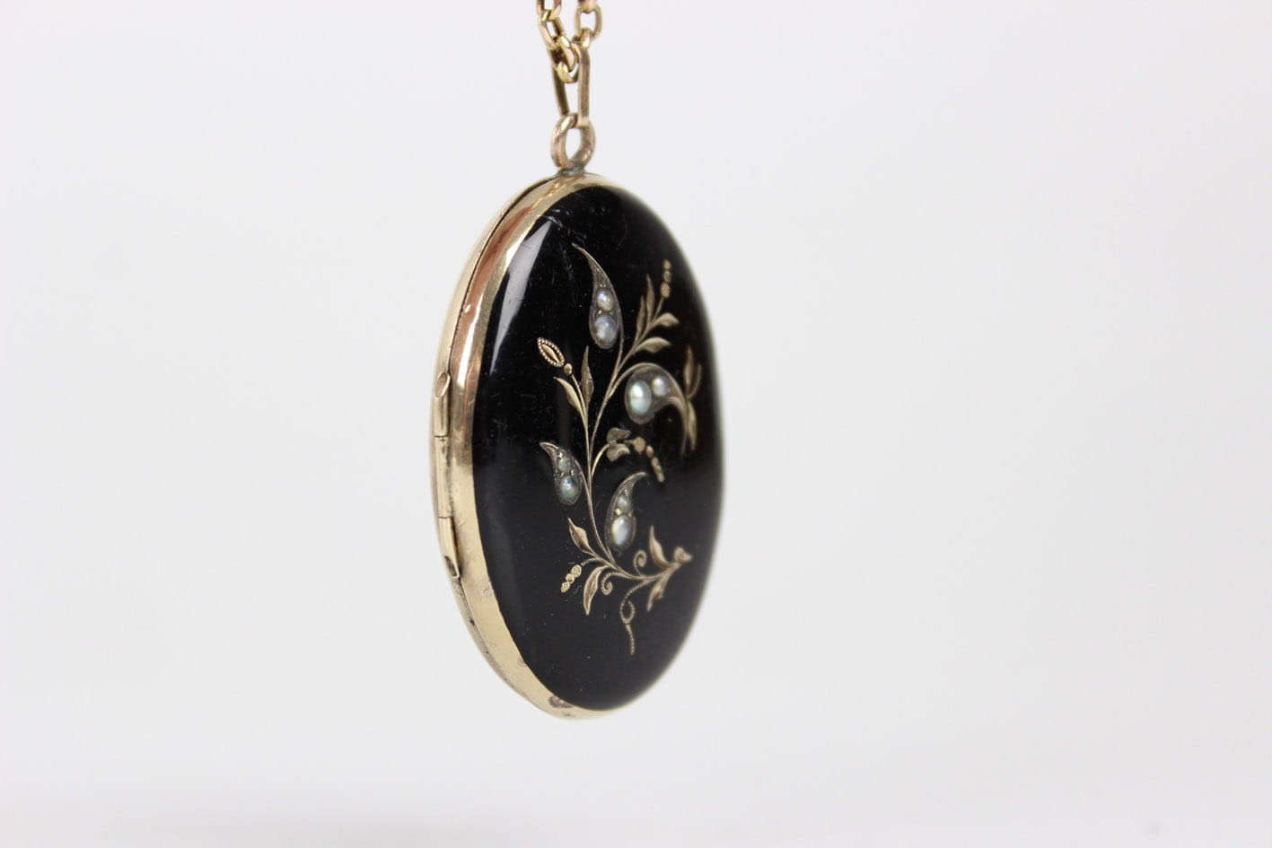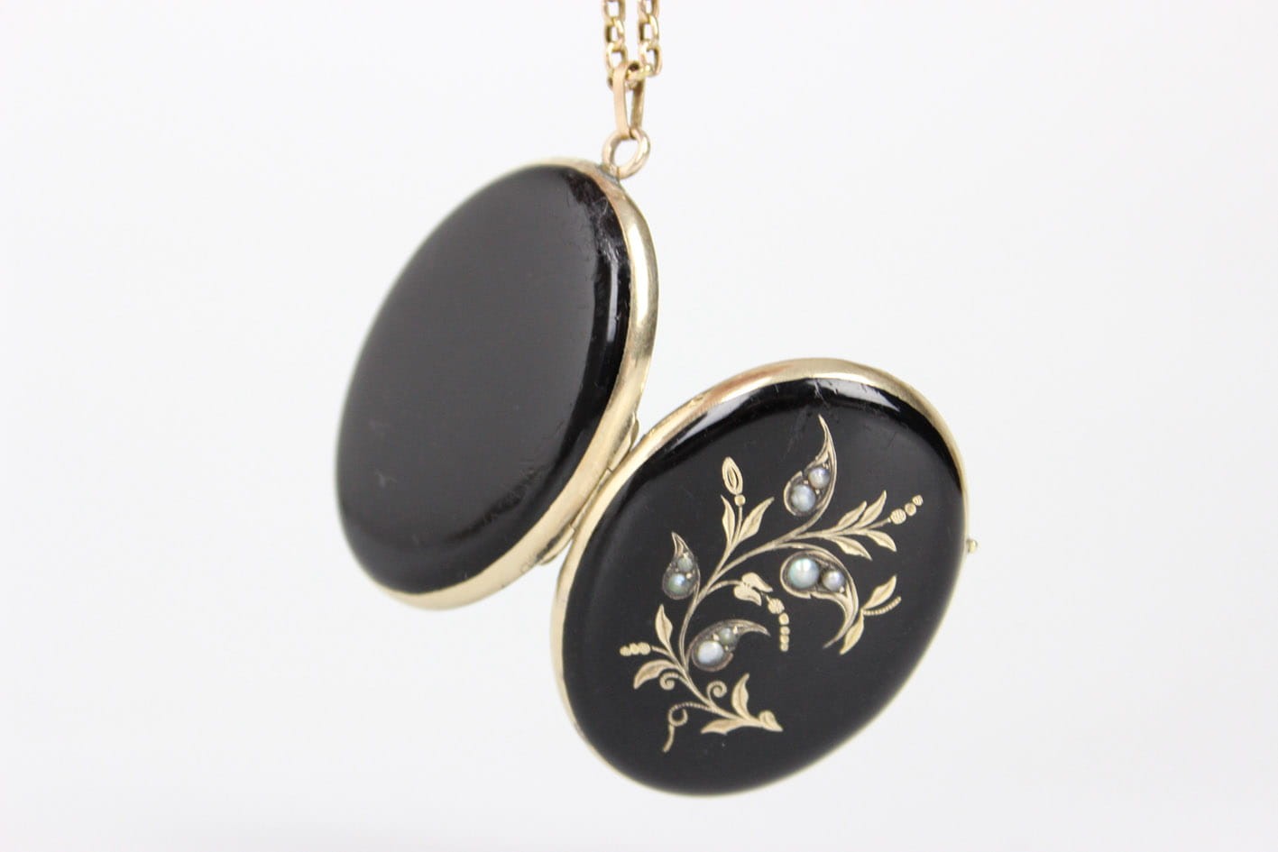 Okazały medalion z II połowy XIX wieku, wykonany z mieszanych materiałów – złota próby około 560-580 oraz srebra próby około 800 (brak punc, całość badana metodą kwasową). Awers zdobi finezyjny grawerunek z motywami floralnymi, dodatkowo wzbogacony półperłami oraz elegancką czarną emalią. Rewers również pokryty jest czarną emalią. Stan zachowania: bardzo dobry, z jedynie delikatnymi rysami oraz niewielkim śladem po naprawie emalii z epoki, widocznym dyskretnie na rewersie przy oczku. Wnętrze kryje podwójną ramkę, z czego jedna jest oszklona, przeznaczona na zdjęcie lub pukiel włosów. W medalionie zachowano oryginalne zdjęcie z lat 30. XX wieku, co dodaje mu historycznego uroku. Wymiary: