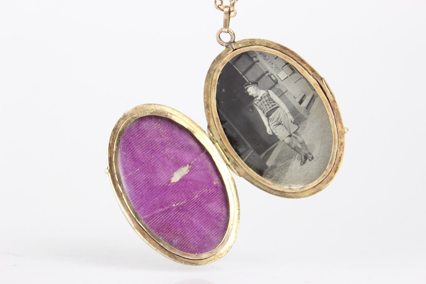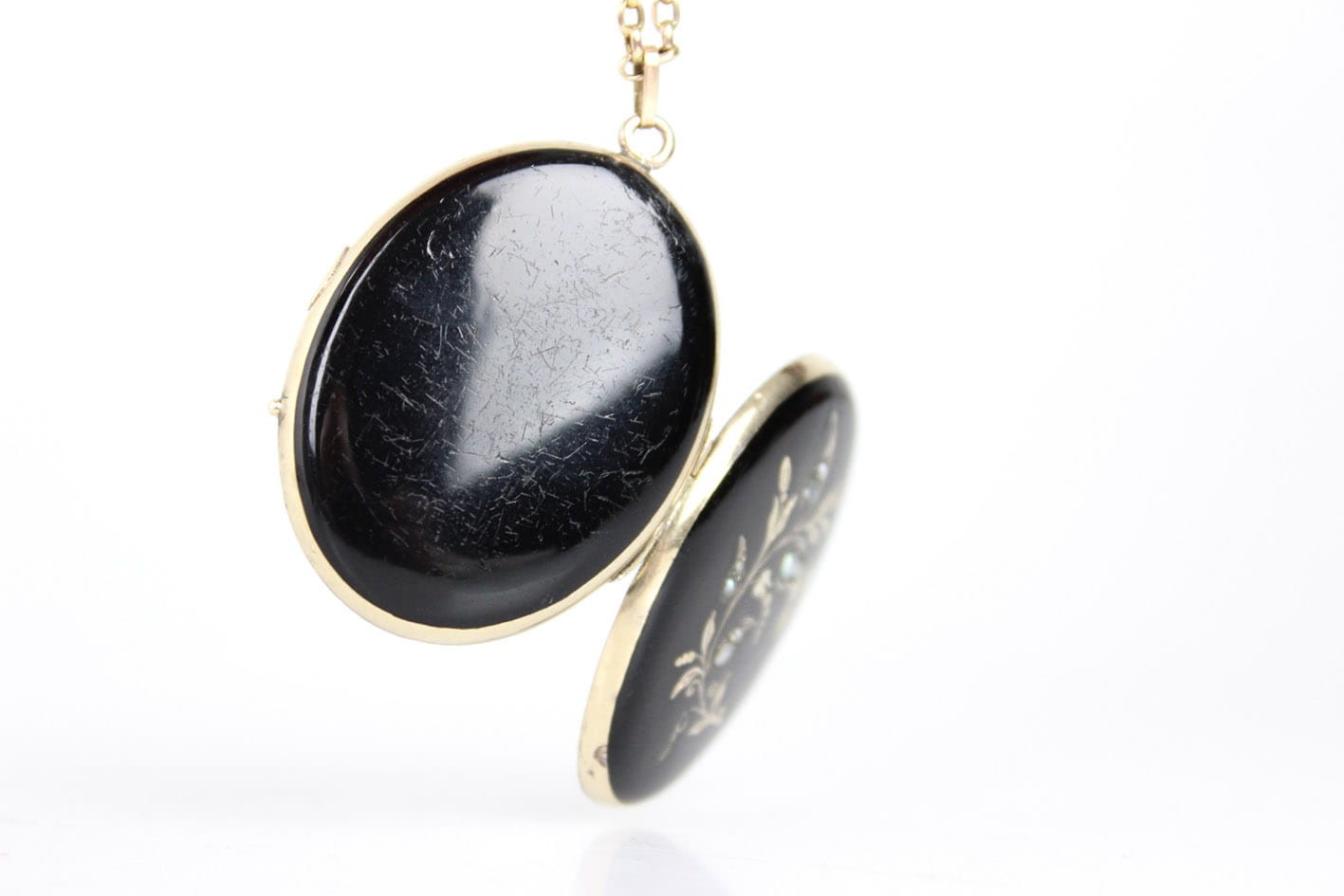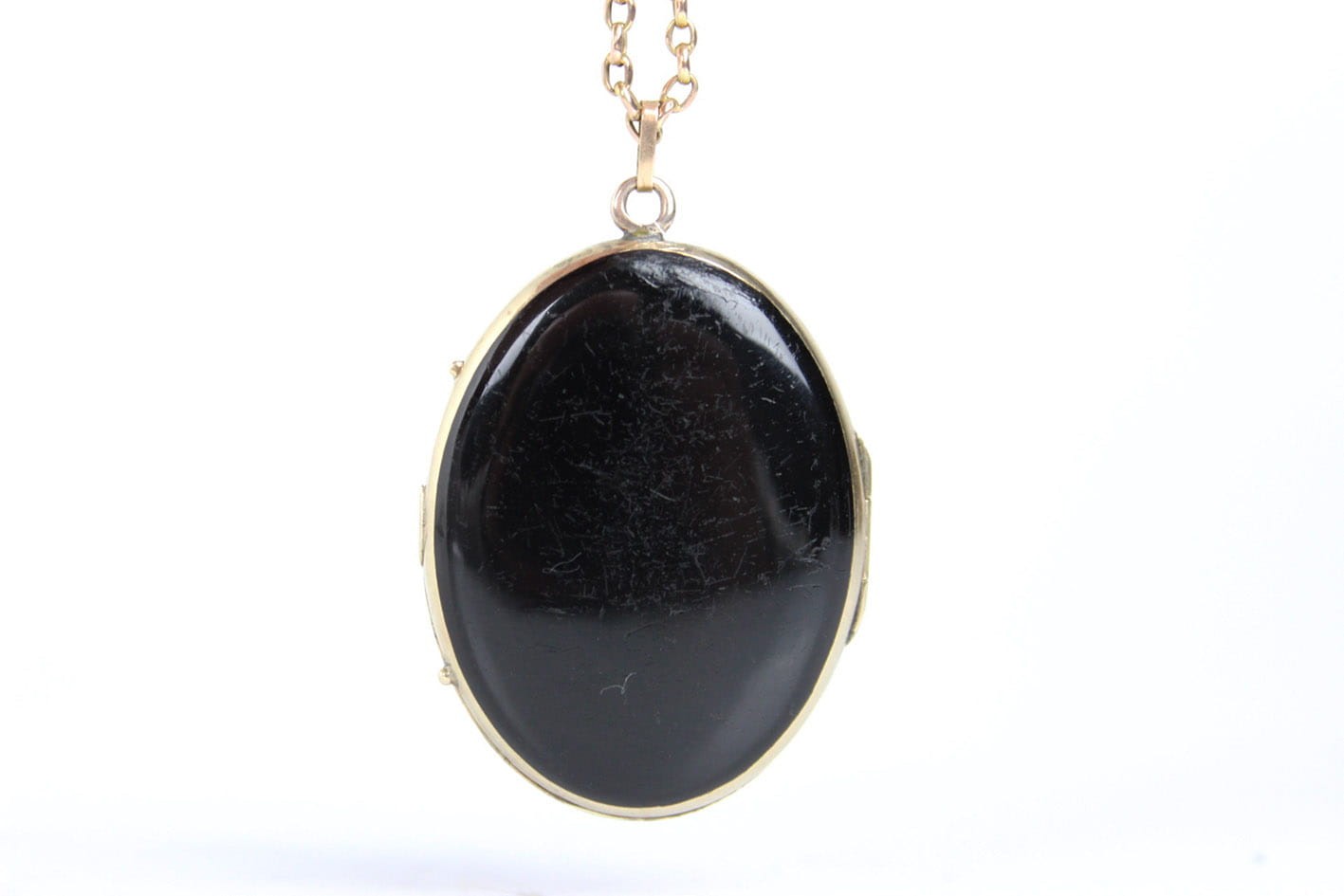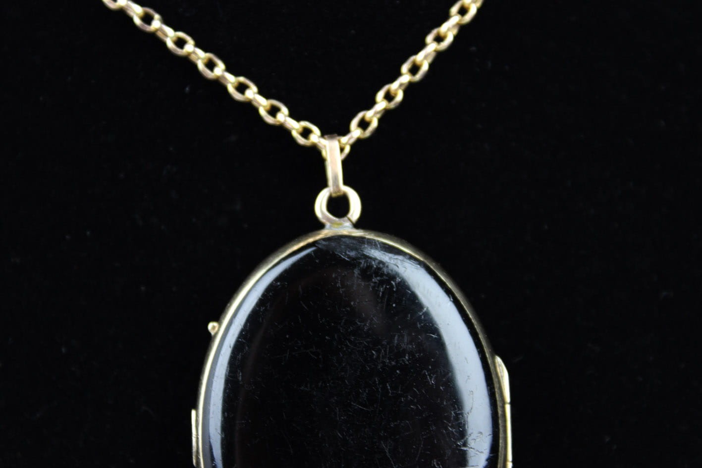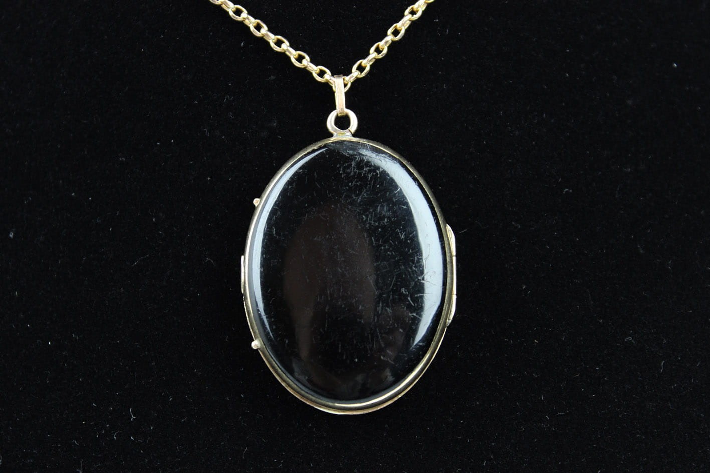 Okazały medalion z II połowy XIX wieku, wykonany z mieszanych materiałów – złota próby około 560-580 oraz srebra próby około 800 (brak punc, całość badana metodą kwasową). Awers zdobi finezyjny grawerunek z motywami floralnymi, dodatkowo wzbogacony półperłami oraz elegancką czarną emalią. Rewers również pokryty jest czarną emalią. Stan zachowania: bardzo dobry, z jedynie delikatnymi rysami oraz niewielkim śladem po naprawie emalii z epoki, widocznym dyskretnie na rewersie przy oczku. Wnętrze kryje podwójną ramkę, z czego jedna jest oszklona, przeznaczona na zdjęcie lub pukiel włosów. W medalionie zachowano oryginalne zdjęcie z lat 30. XX wieku, co dodaje mu historycznego uroku. Wymiary: