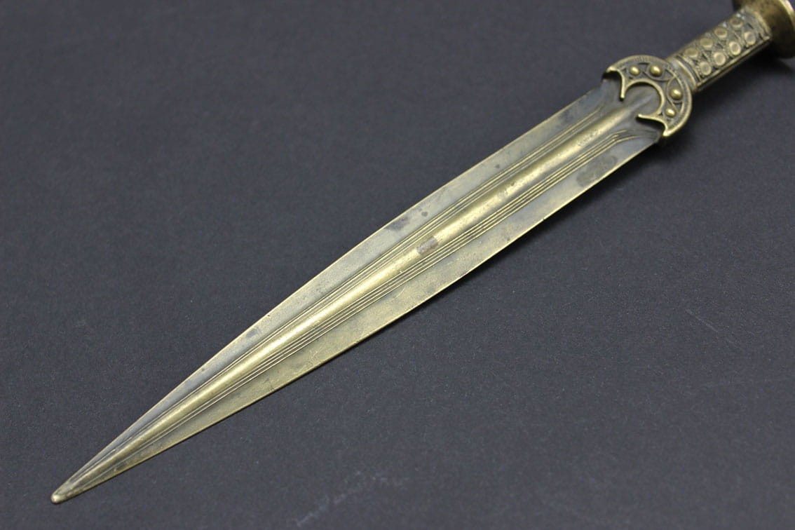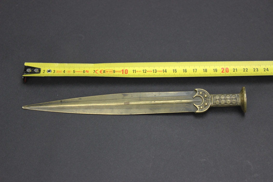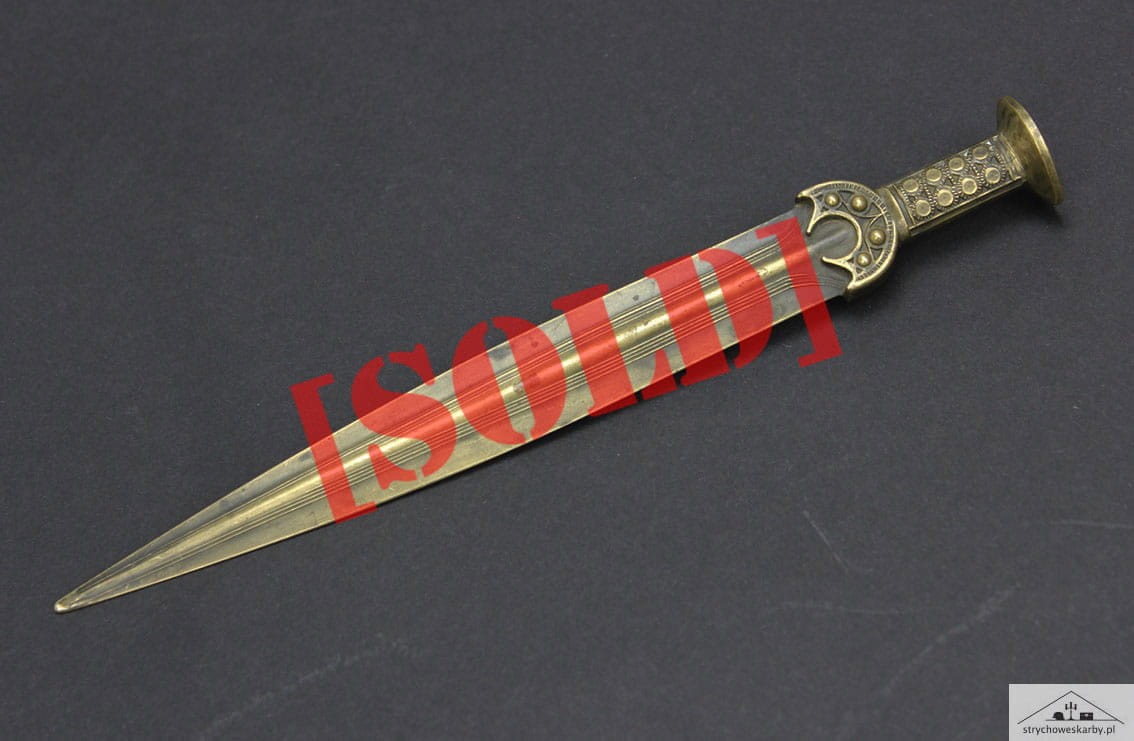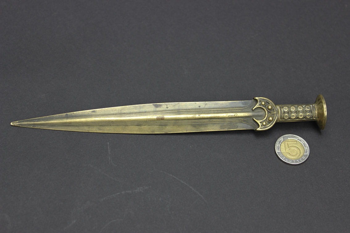 Przyciągający niejedno spojrzenie niepowtarzalny nożyk do listów pochodzący z lat 80-tych XIX wieku. Przedmiot powstał w dobie odkryć archeologicznych jakie w tamtym czasie pojawiały się w całej Europie. Wyrób jest miniaturową kopią mieczy z epoki brązu i tak samo jak oryginały wykonany został w brązie. Całość w pięknym stanie zachowania z oryginalną wiekową patynką.