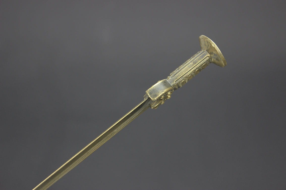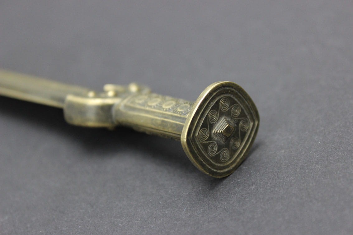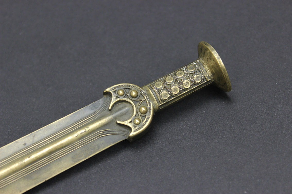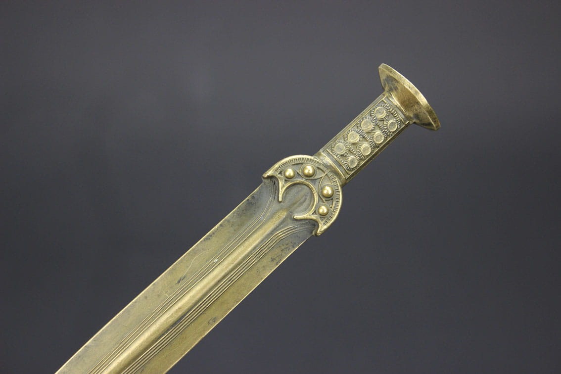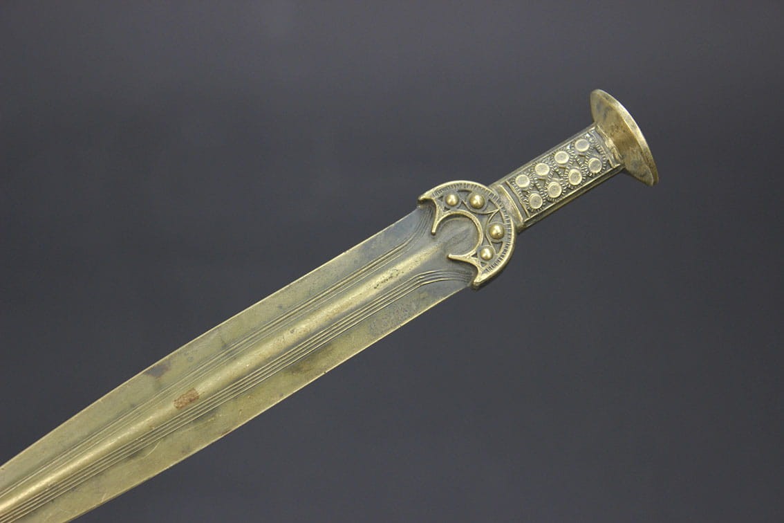 Przyciągający niejedno spojrzenie niepowtarzalny nożyk do listów pochodzący z lat 80-tych XIX wieku. Przedmiot powstał w dobie odkryć archeologicznych jakie w tamtym czasie pojawiały się w całej Europie. Wyrób jest miniaturową kopią mieczy z epoki brązu i tak samo jak oryginały wykonany został w brązie. Całość w pięknym stanie zachowania z oryginalną wiekową patynką.