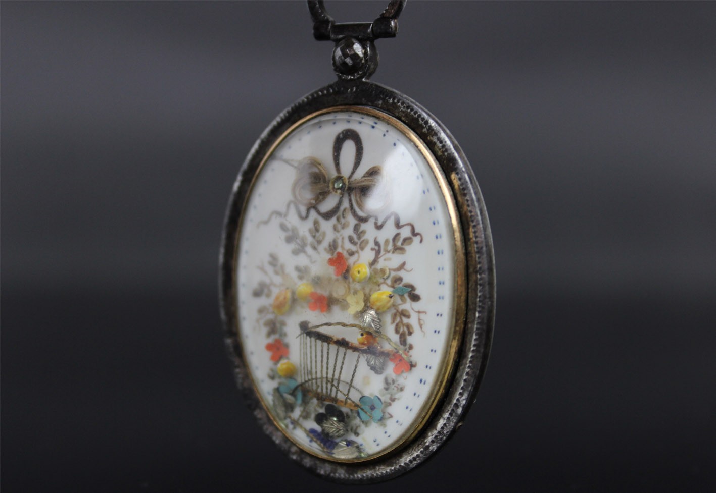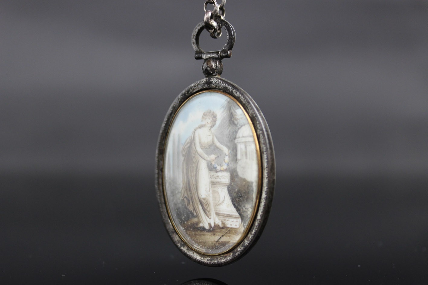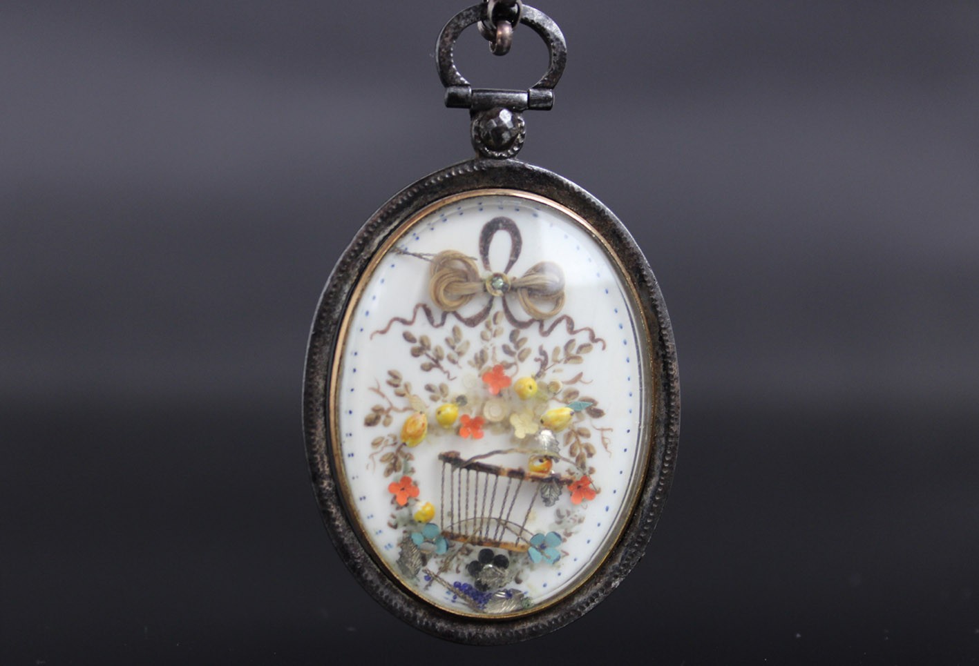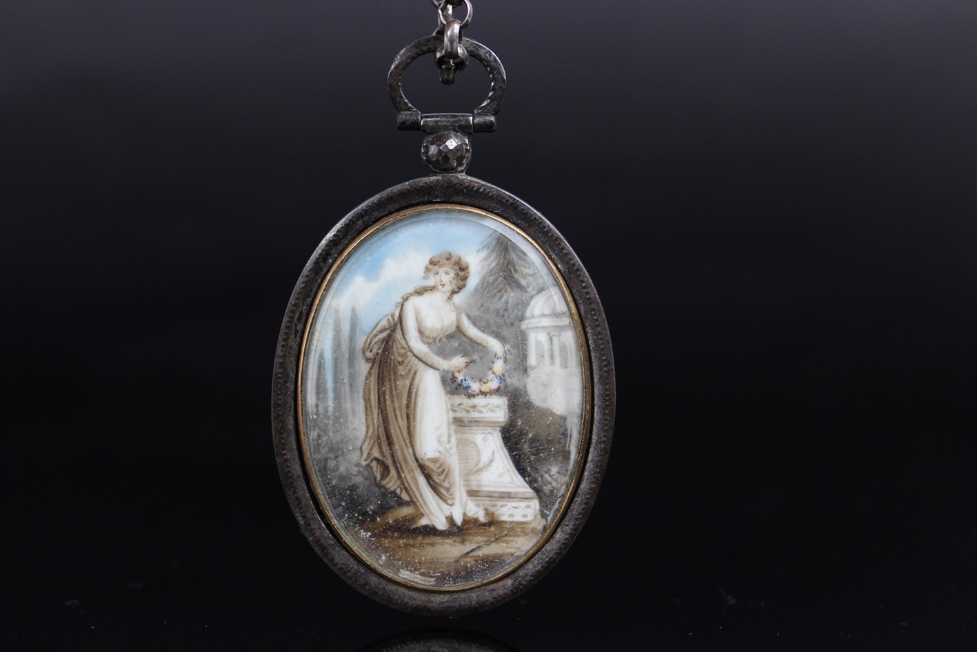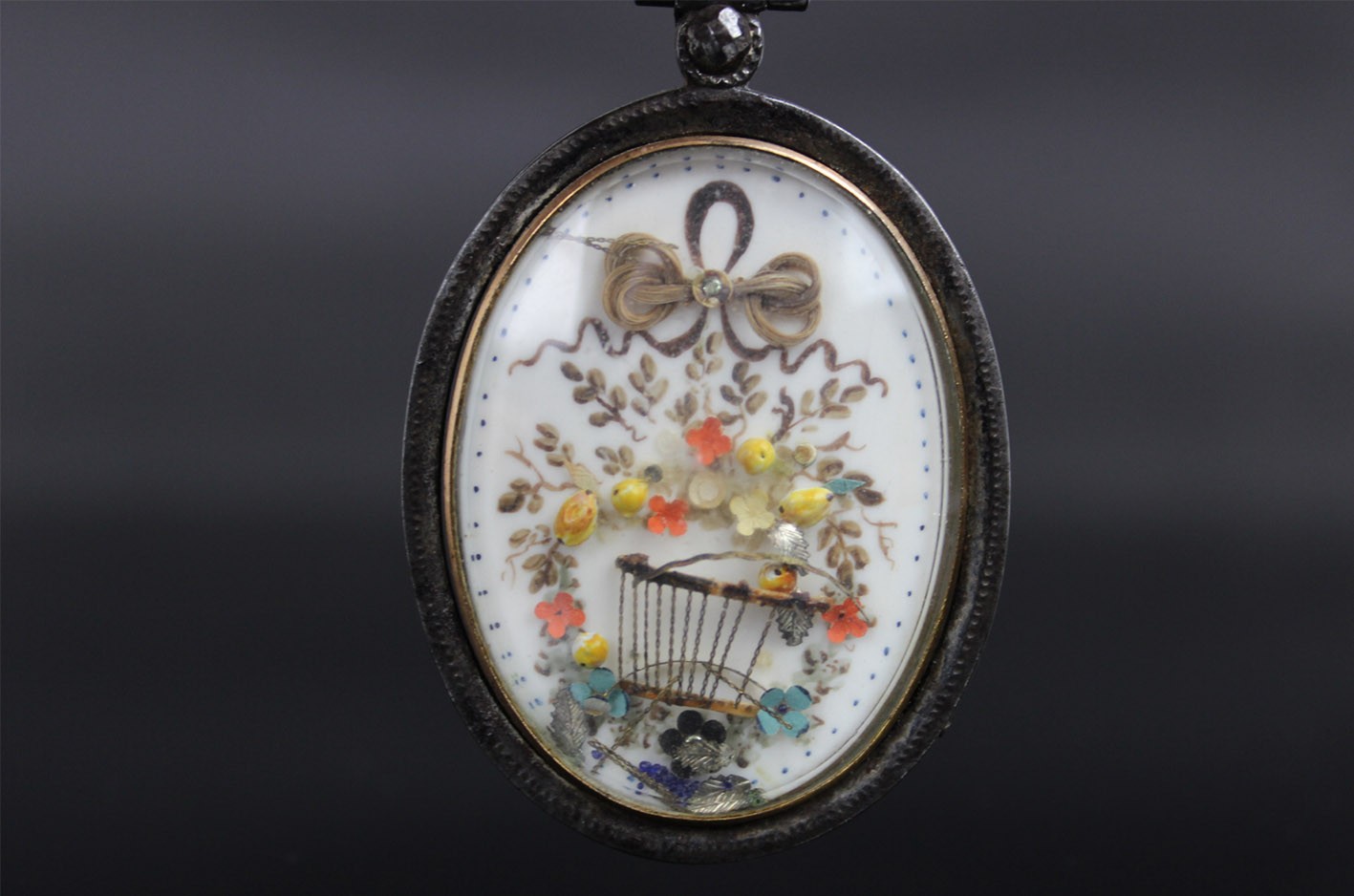 Rzadki przykład późnogeorgiańskiej biżuterii sentymentalnej, wykonanej w technice miniatury malarskiej i mikromontażu przestrzennego. Owalna forma z dwiema wypukłymi szybkami, osadzona w ręcznie kutym żelaznym korpusie o subtelnie młotkowanej fakturze, z zawiesiem zakończonym żelazną, fasetowaną rozetką.