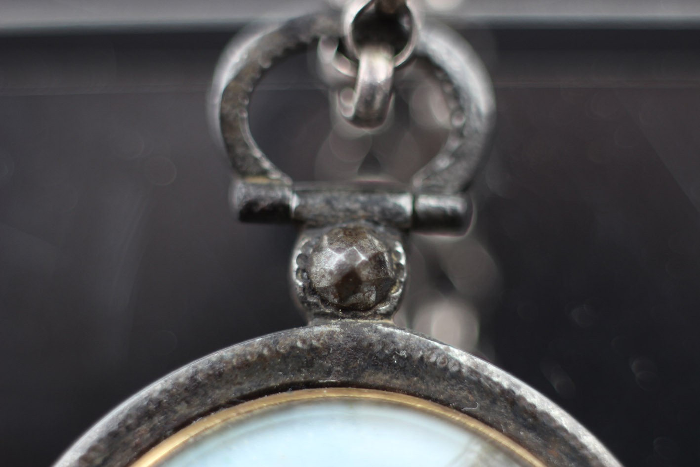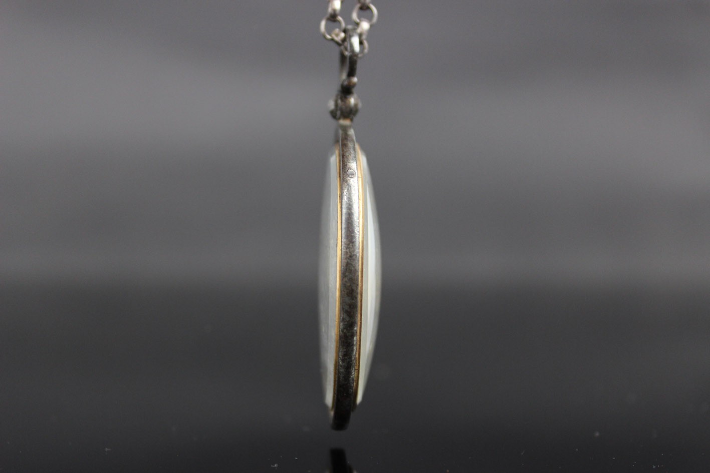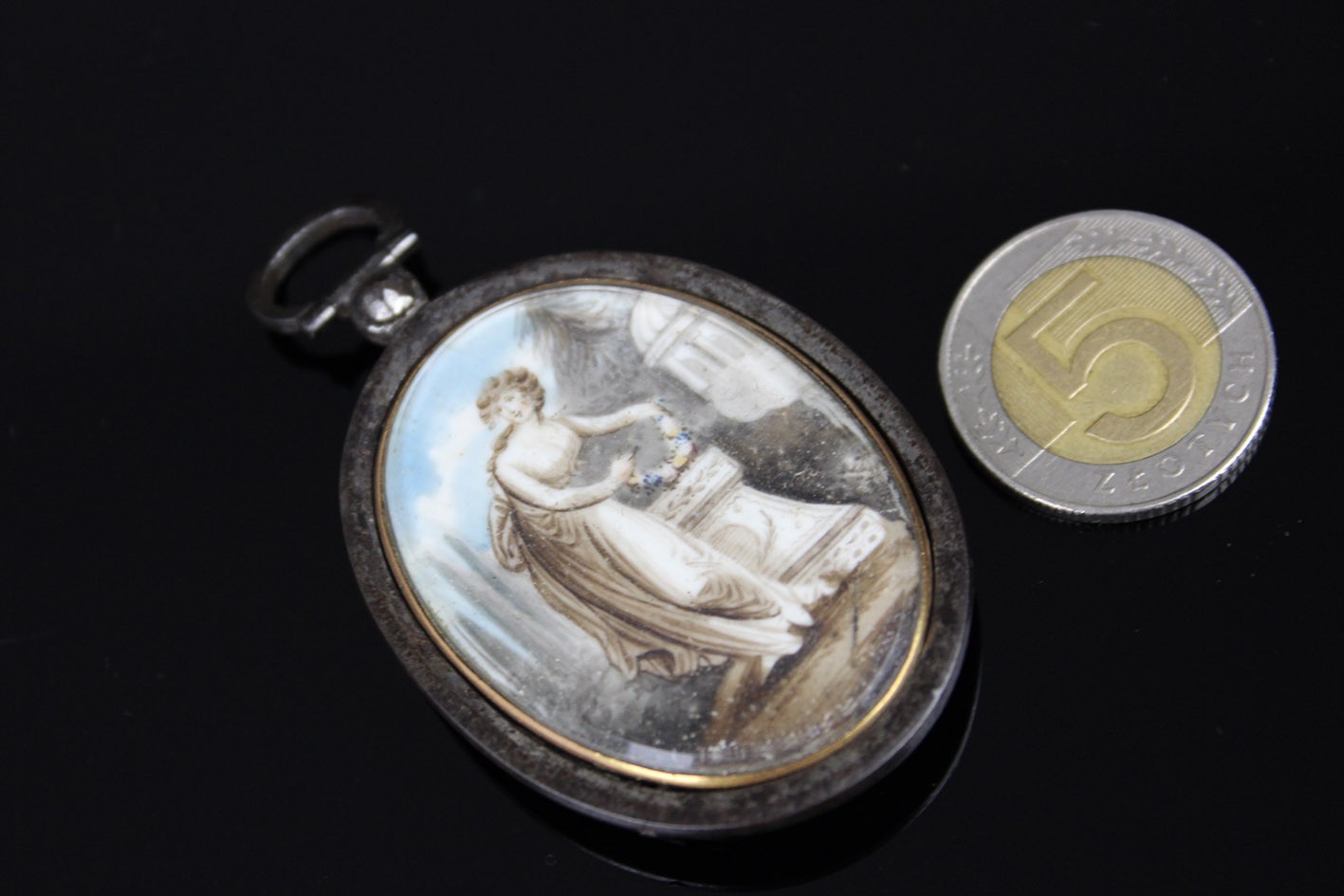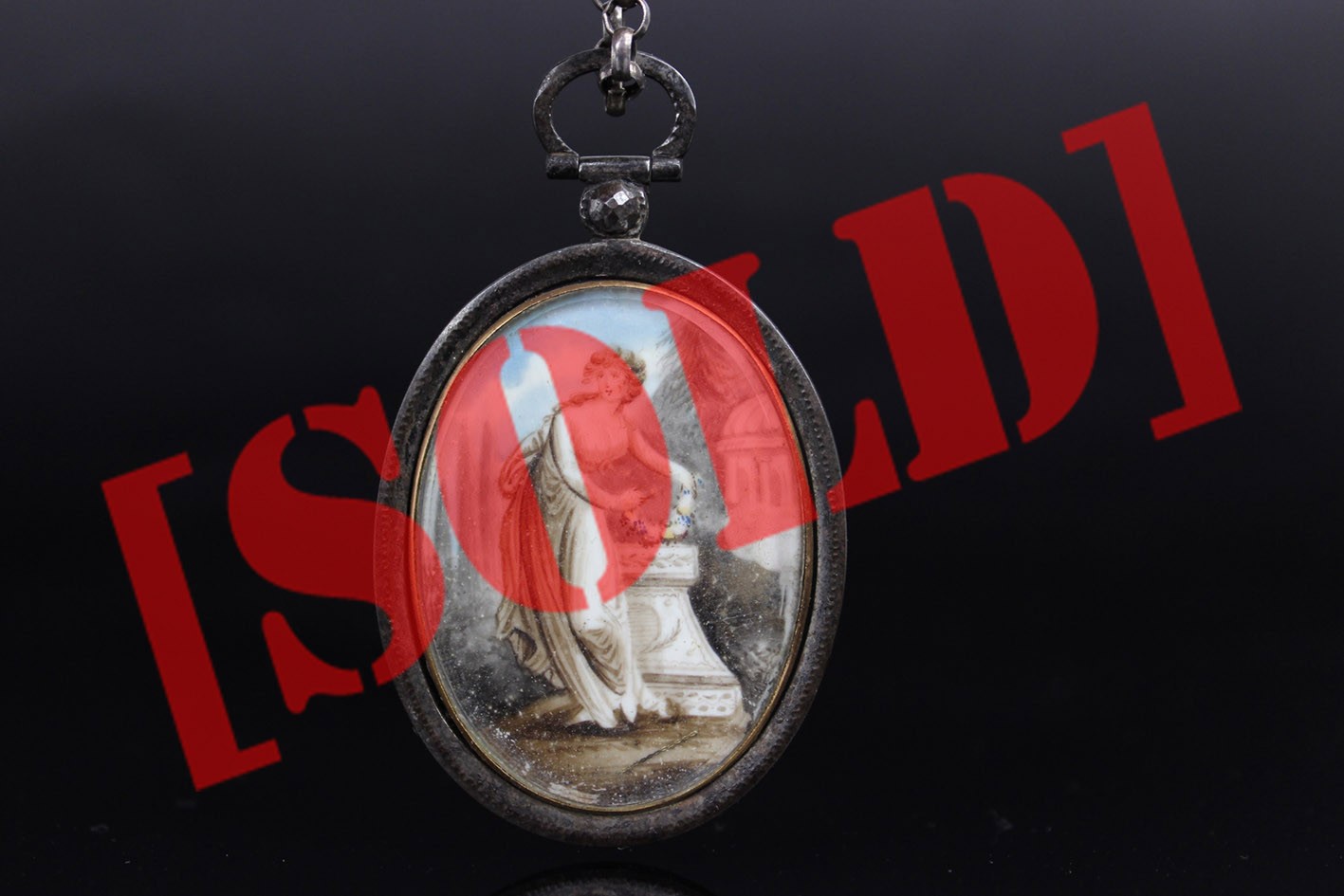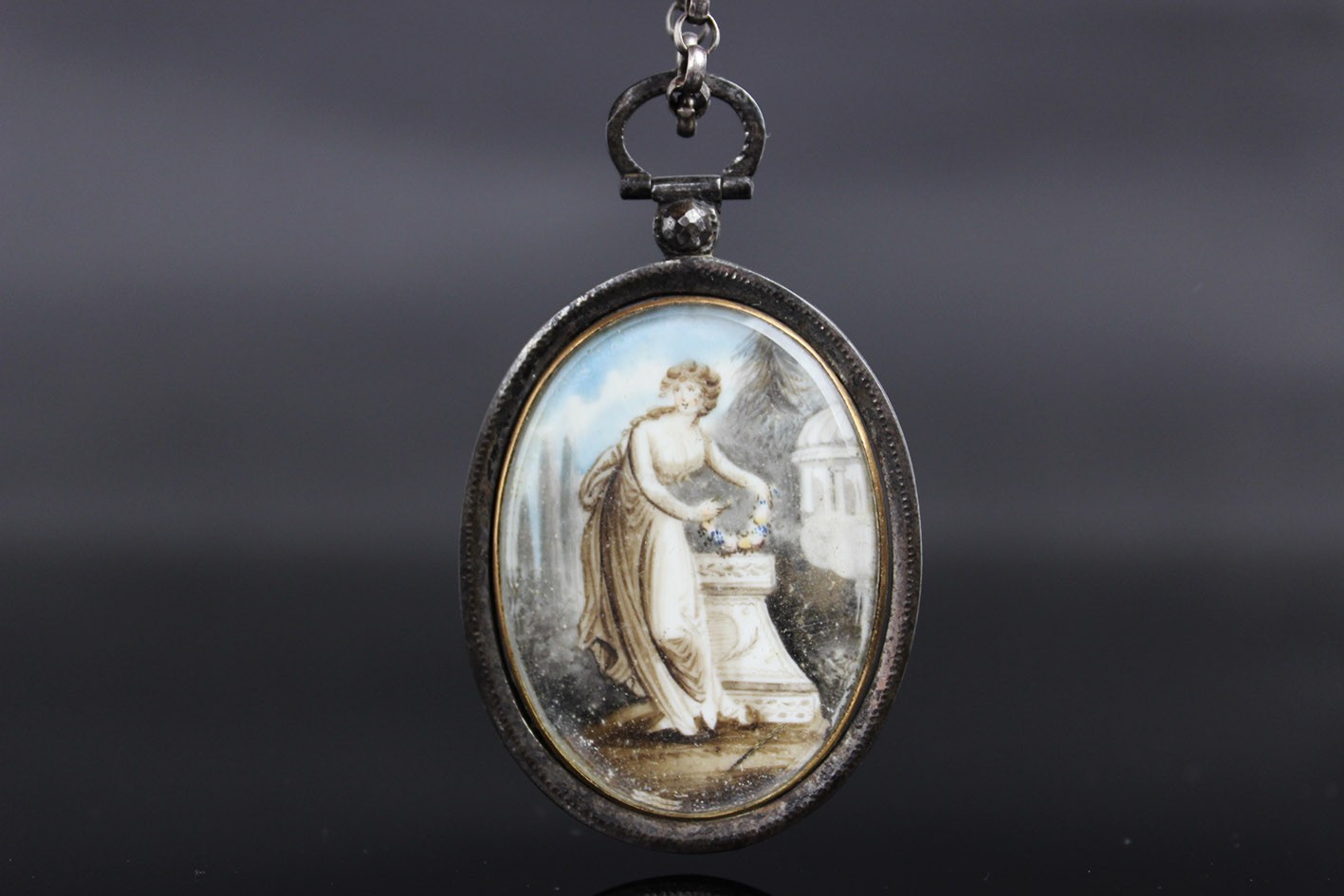 Rzadki przykład późnogeorgiańskiej biżuterii sentymentalnej, wykonanej w technice miniatury malarskiej i mikromontażu przestrzennego. Owalna forma z dwiema wypukłymi szybkami, osadzona w ręcznie kutym żelaznym korpusie o subtelnie młotkowanej fakturze, z zawiesiem zakończonym żelazną, fasetowaną rozetką.