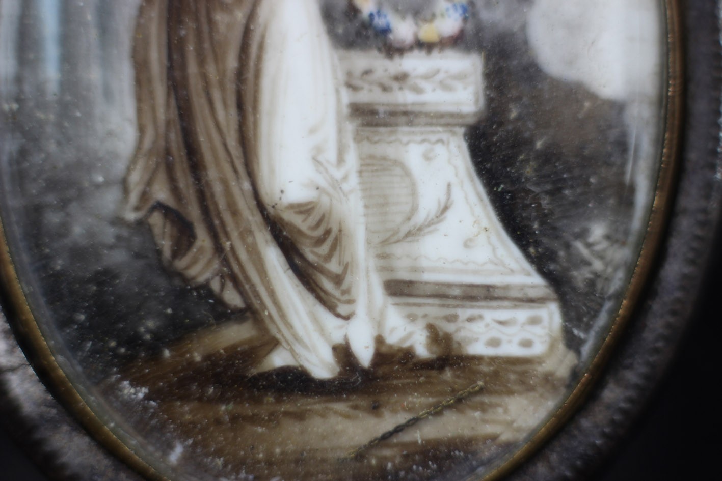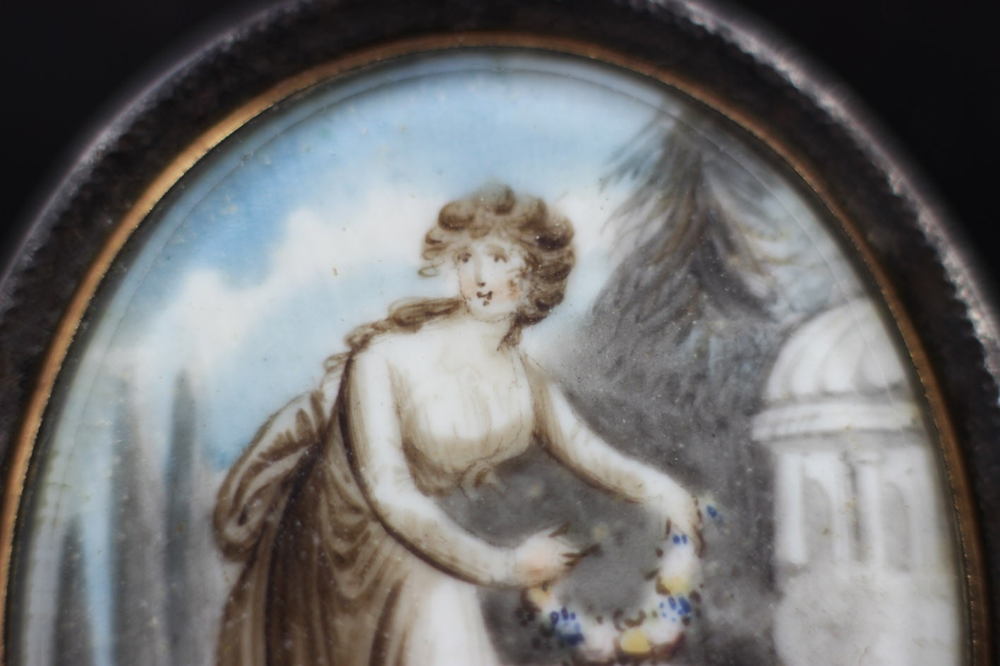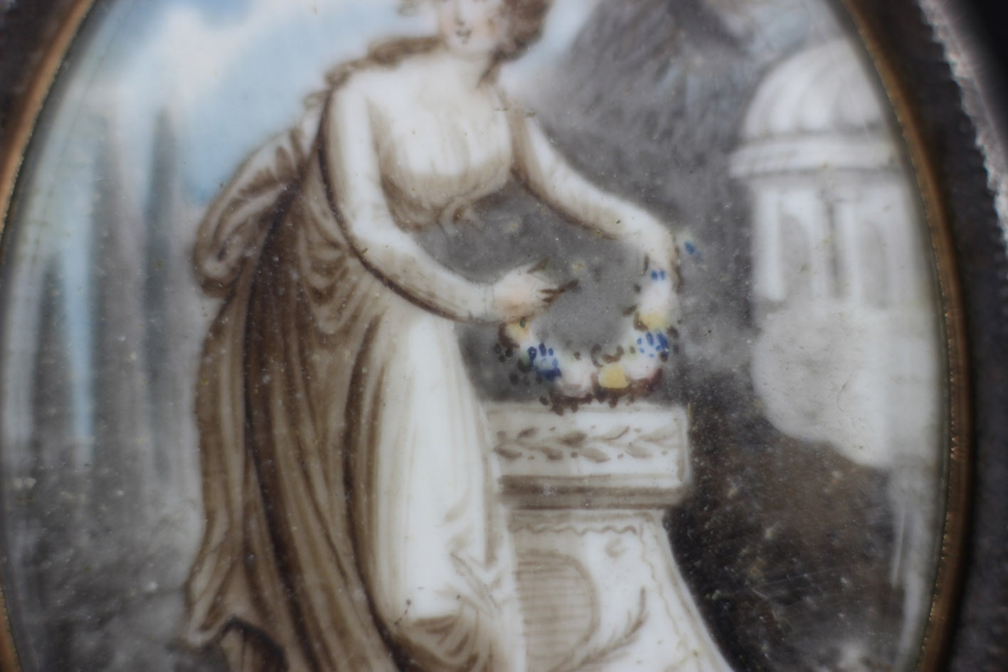 Na awersie – misternie malowana scena na płytce z kości, utrzymana w delikatnych tonacjach sepii i błękitu. Ukazuje młodą kobietę w klasycyzującej sukni, składającą wieniec kwiatów na kamiennym ołtarzu – motyw typowy dla angielskich miniatur sentymentalnych końca XVIII wieku.