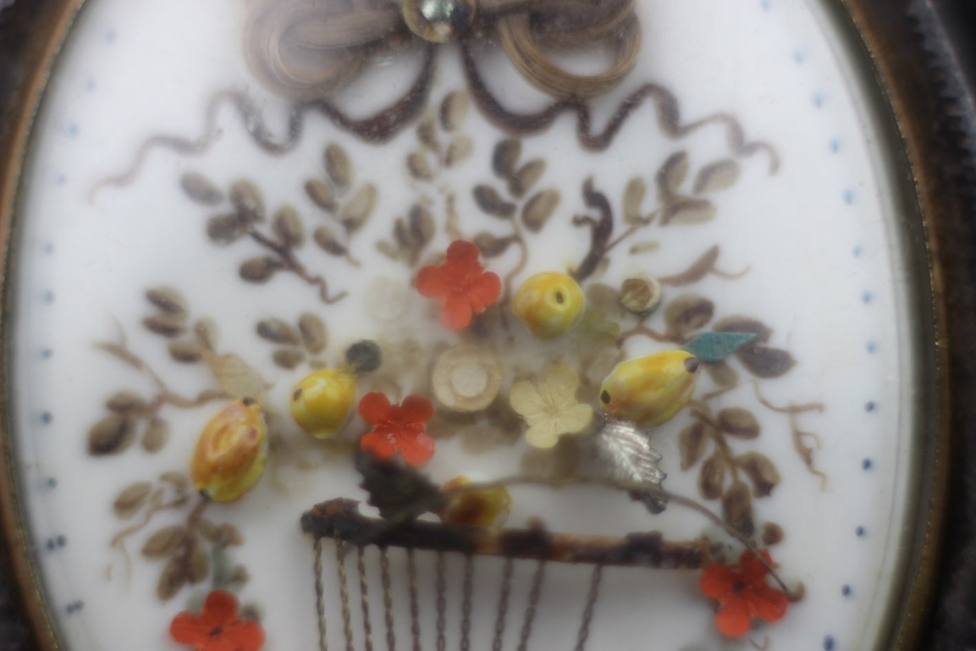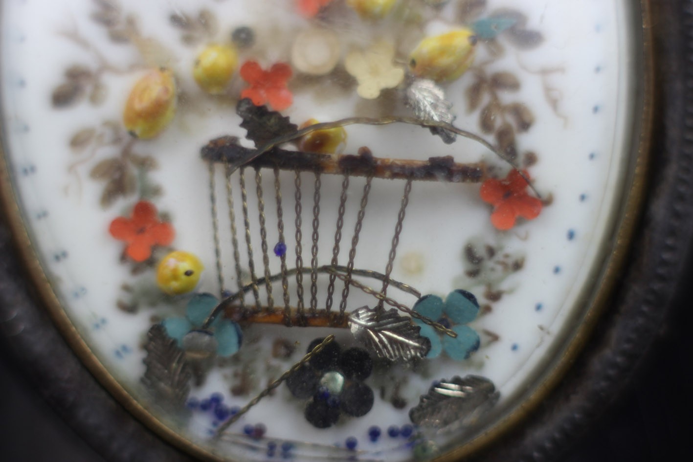 Rewers kryje natomiast jedną z najbardziej urzekających cech dawnych miniatur – złożoną, trójwymiarową kompozycję z drobnych elementów organicznych i metalowych. Widać tu miniaturową lirę, otoczoną girlandą kwiatów, wykonanych z barwionej kości, papieru, srebrzonych listków i fragmentów włosów. Z biegiem ponad dwóch stuleci kompozycja nieco się rozluźniła: niektóre detale przesunęły się pod szkłem, część mikroskopijnych fragmentów odpadła lub uniosła, tworząc delikatny, niemal malarski chaos. Ten „bałagan wieku” nie ujmuje urody przedmiotu – przeciwnie, stanowi autentyczny zapis jego długiej historii i kruchości materii, jakby sama miniatura podlegała temu samemu przemijaniu, które niegdyś symbolizowała.