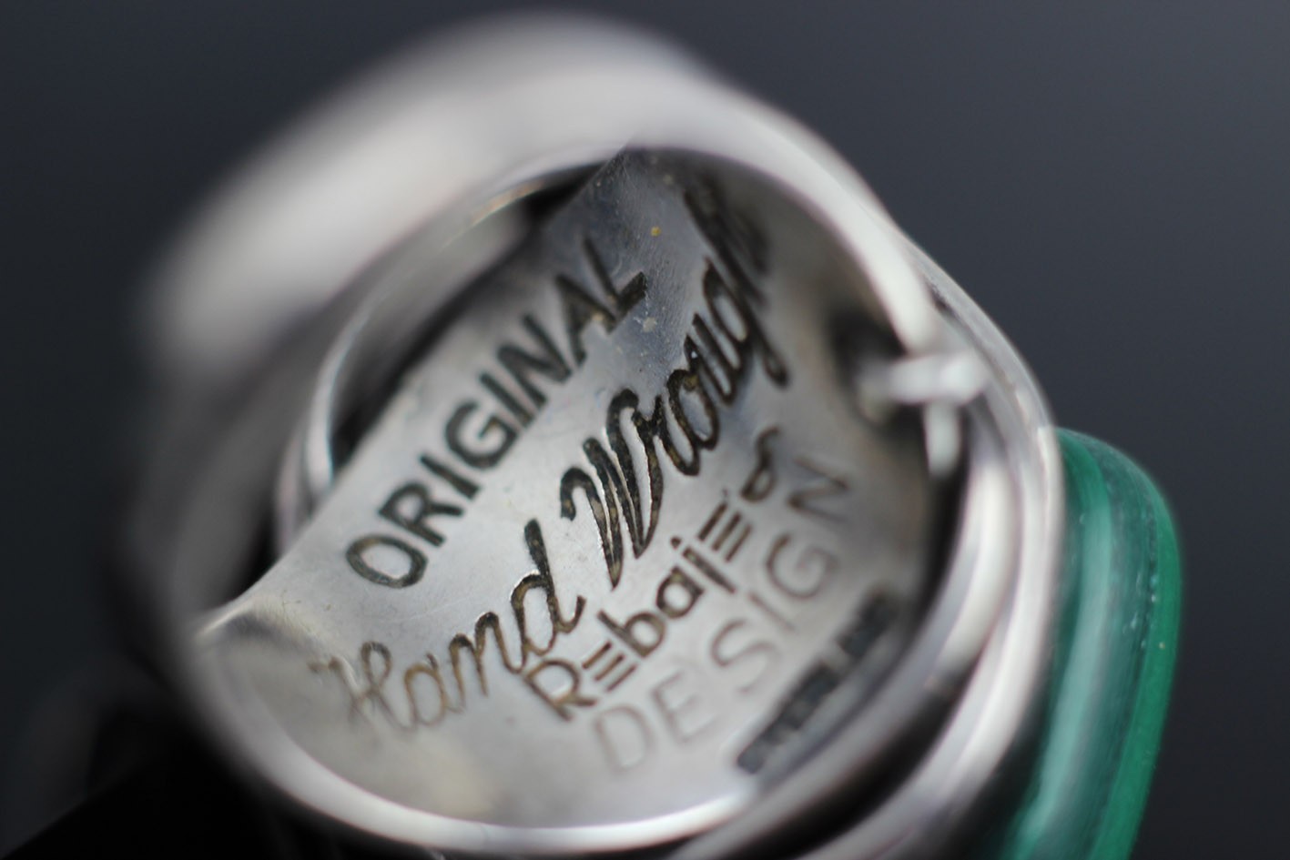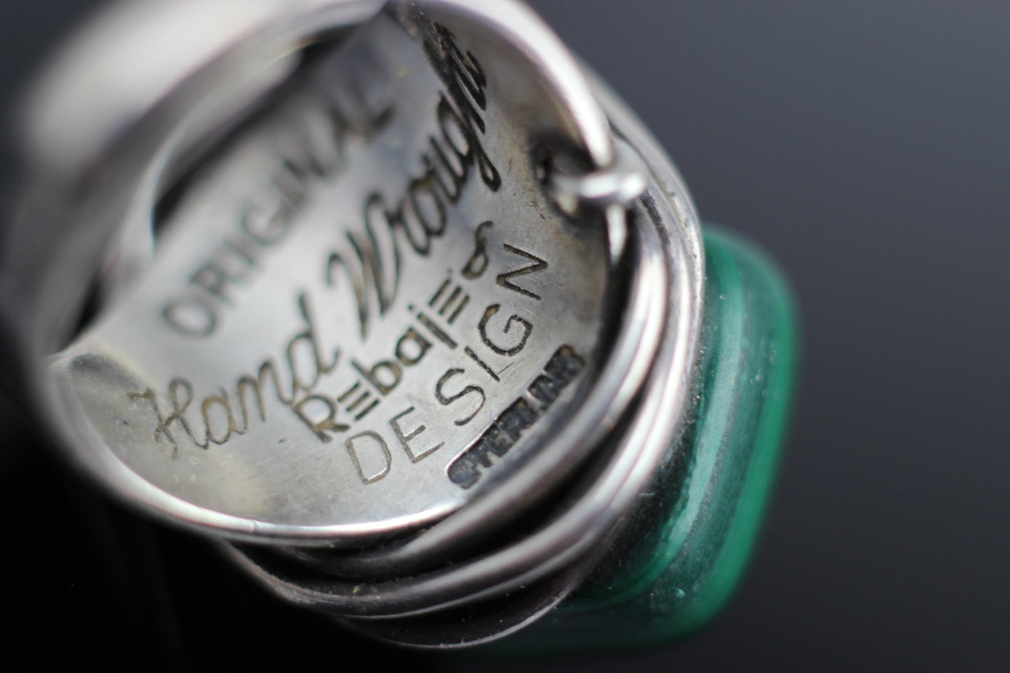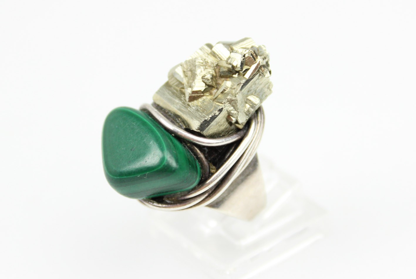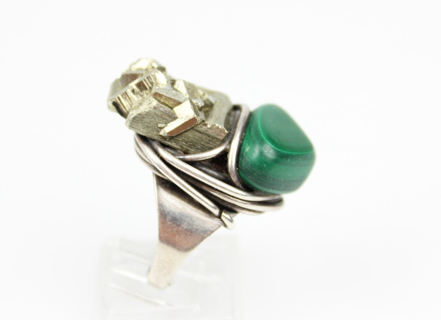 Modernistyczny pierścionek o dynamicznej, asymetrycznej kompozycji, będący autorską pracą Francisco (Frank) Rebajesa, nowojorskiego modernisty znanego z rzeźbiarskich form. Na szczycie zestawiono dwa przeciwstawne akcenty: gładko wypolerowany malachit o soczystej zieleni oraz surowy kryształ pirytu o naturalnej, sześciennej morfologii. Oba elementy „spina” spiralnie poprowadzona, ręcznie formowana linia srebrnego drutu, która tworzy charakterystyczny dla Rebajesa efekt ruchu i napięcia. Bryła ma wyraźny, „studyjny” charakter – to biżuteria traktowana jak mała rzeźba, wpisana w język amerykańskiego modernizmu połowy XX w. Wnętrze sygnowane:“ORIGINAL Hand Wrought REBAJES DESIGN STERLING”. Obrączka typu otwartego pasująca na większość palców. Wymiary: