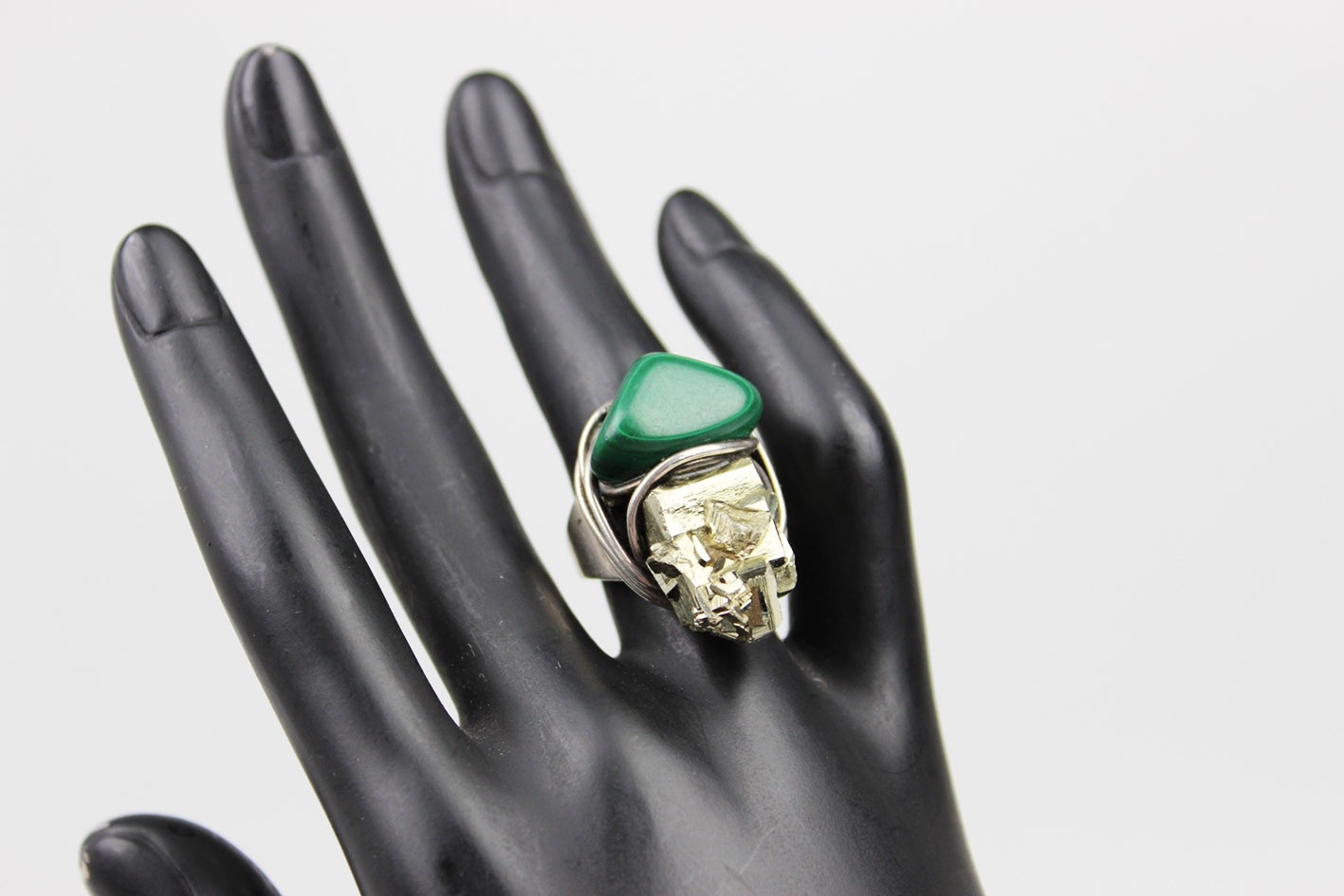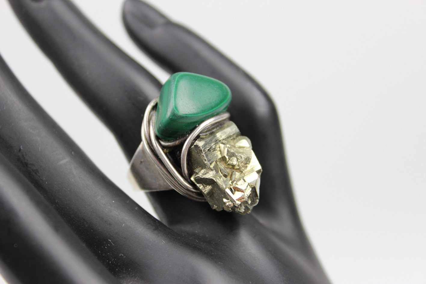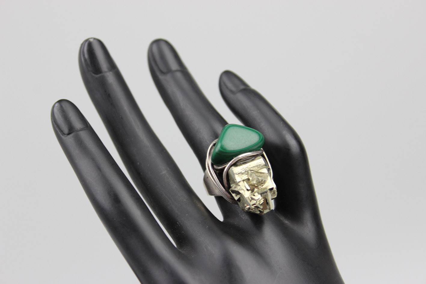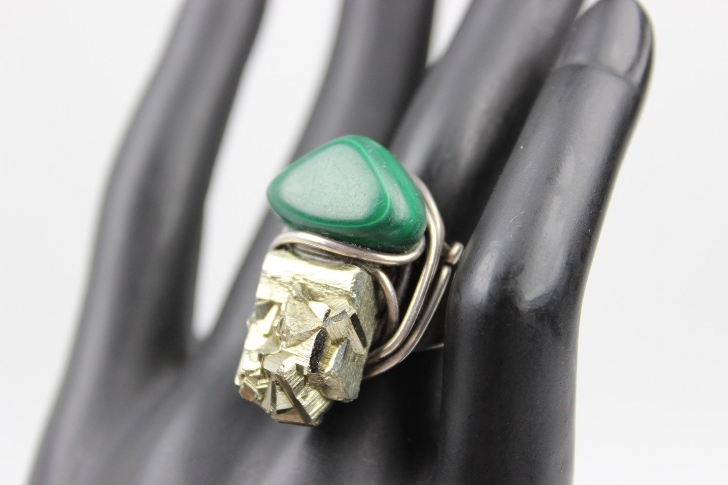 Modernistyczny pierścionek o dynamicznej, asymetrycznej kompozycji, będący autorską pracą Francisco (Frank) Rebajesa, nowojorskiego modernisty znanego z rzeźbiarskich form. Na szczycie zestawiono dwa przeciwstawne akcenty: gładko wypolerowany malachit o soczystej zieleni oraz surowy kryształ pirytu o naturalnej, sześciennej morfologii. Oba elementy „spina” spiralnie poprowadzona, ręcznie formowana linia srebrnego drutu, która tworzy charakterystyczny dla Rebajesa efekt ruchu i napięcia. Bryła ma wyraźny, „studyjny” charakter – to biżuteria traktowana jak mała rzeźba, wpisana w język amerykańskiego modernizmu połowy XX w. Wnętrze sygnowane:“ORIGINAL Hand Wrought REBAJES DESIGN STERLING”. Obrączka typu otwartego pasująca na większość palców. Wymiary: