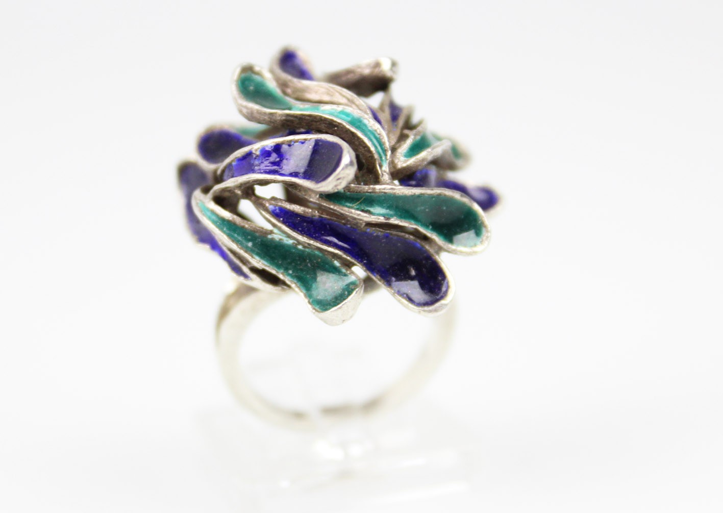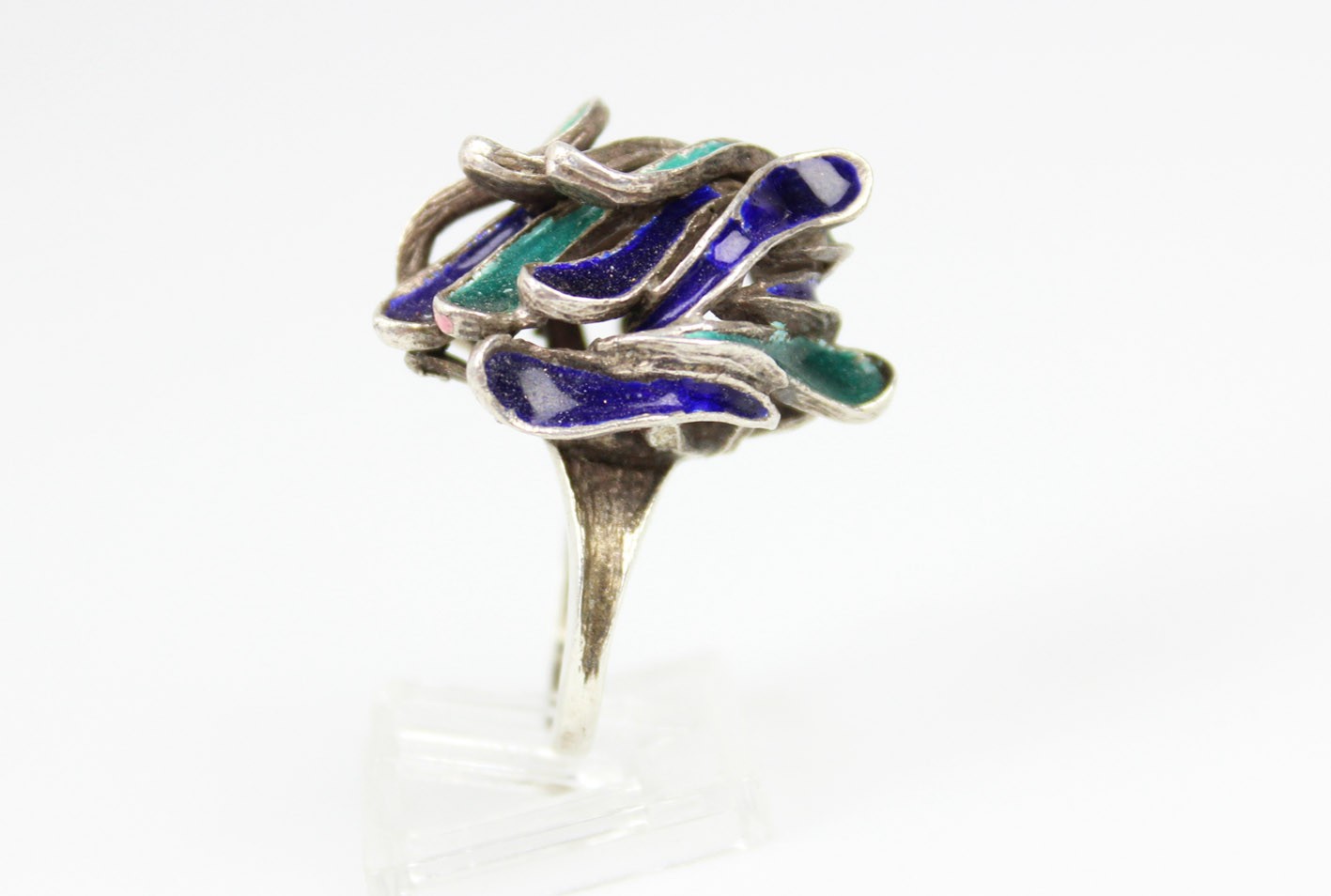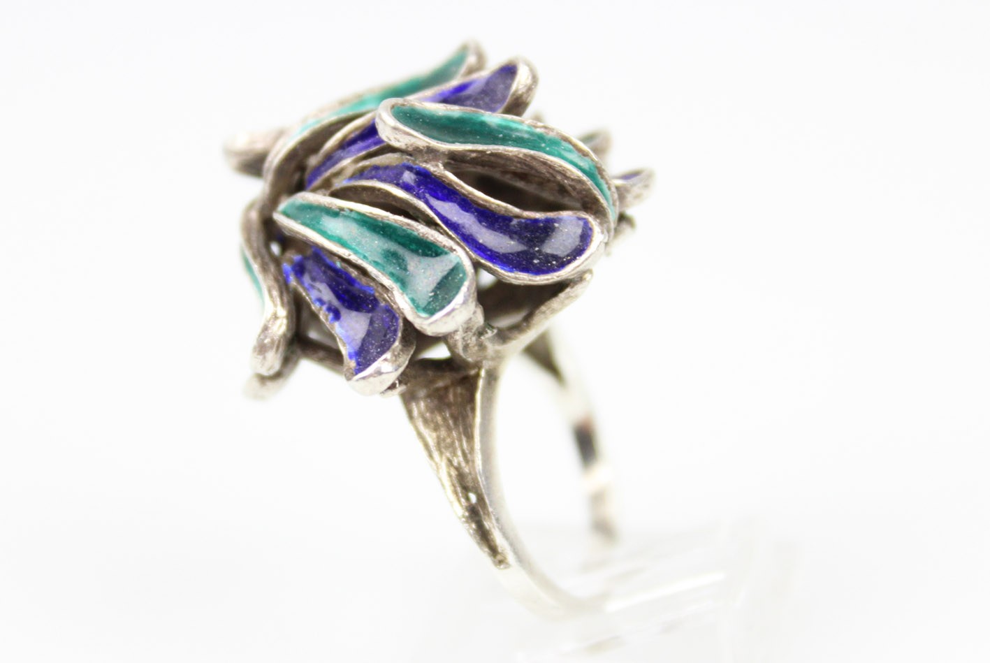 Efektowny pierścionek o wyraźnie modernistycznej formie, wykonany ze srebra próby 835 i zdobiony barwną emalią w odcieniach głębokiego kobaltu, granatu i szmaragdowej zieleni. Kompozycja opiera się na nieregularnych, płynnych liniach tworzących dynamiczną, przestrzenną strukturę przypominającą organiczne formy natury lub abstrakcyjne płatki. Wyrób w formie typowej dla skandynawskiego wzornictwa lat 60 tych XX wieku łączącego surowość materiału z kolorem i ekspresją kształtu. Całość zachowana w bardzo dobrym stanie z drobnymi śladami użytkowania. Wymiary: